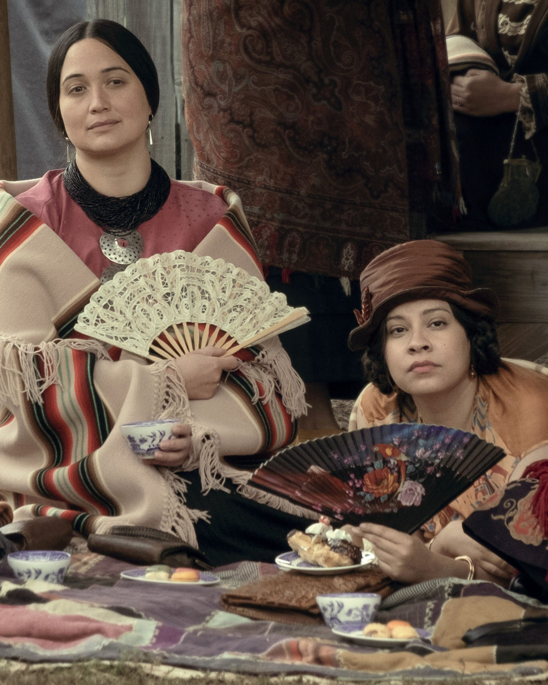 West and O’Keefe also took special care in how all of these main (and background) characters wore the pieces – whether they were draped across the back or folded delicately over the arm. “There’s many different ways to wear an Osage blanket,” says O’Keefe. “There’s different ways to fold it, depending on where you are.” The way the accessories were styled even became a crucial detail. “Lily Gladstone would not go to set without Julie going to her trailer first to make sure the blanket was folded the exact right way for the scene,” says West.