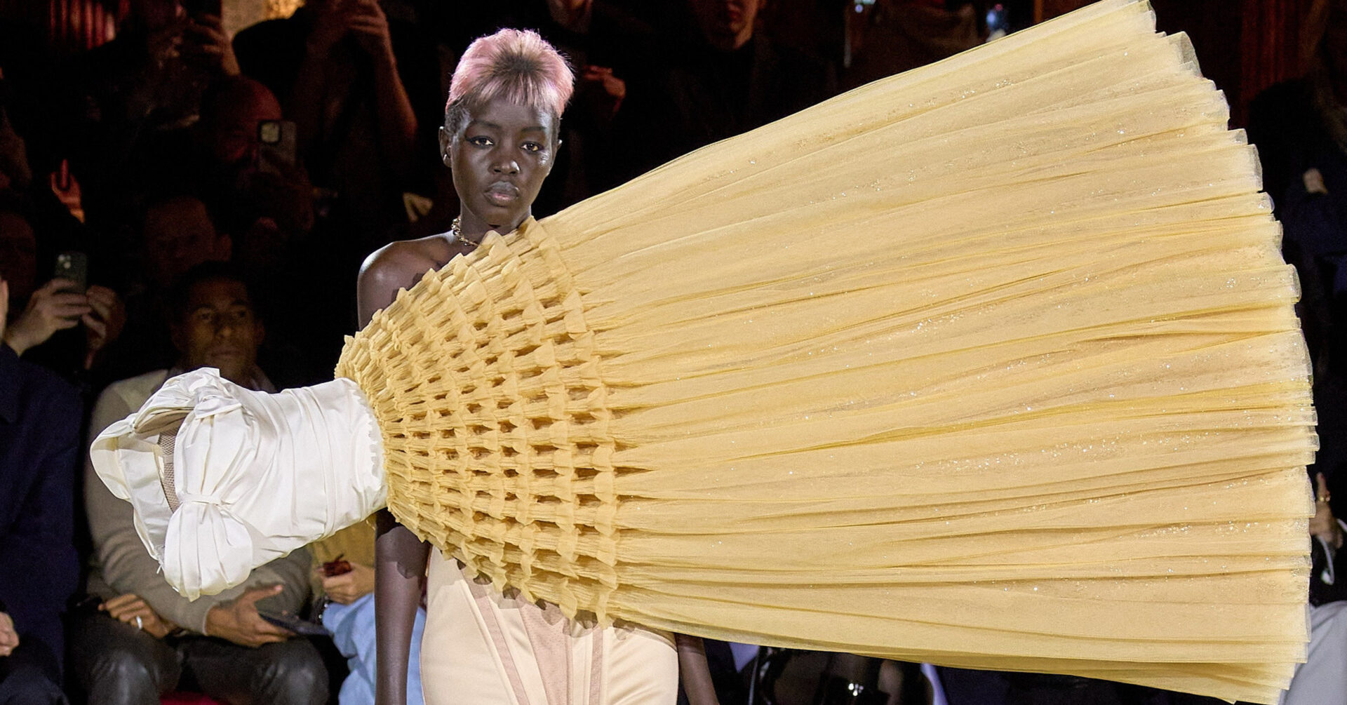 At the Intercontinental Le Grand hotel in Paris, Viktor Horsting and Rolf Snoeren showcased a collection of head-turning looks that were their most meme-worthy yet. The show began with a handful of breathtaking tulle dresses in the most delectable confectionary hues. But as the show progressed, the dresses started to appear in the most bizarre positionings—from appearing slightly lopsided and with a bustier placement right up to the model’s neck, to being entirely sideways, as well as upside-down and covering the face. With certain looks, it seemed as if the model was carrying the dress while wearing undergarments.