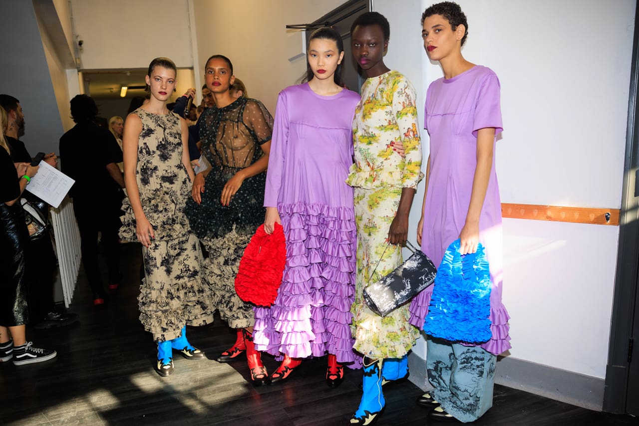 Molly Goddard’s ruffle hem two-piece provides a breath of fresh air, capturing the spirit of lively young fauna frolicking among grasslands on a butter yellow backdrop, reminiscent of sunny spring afternoons in the Pyrenees.