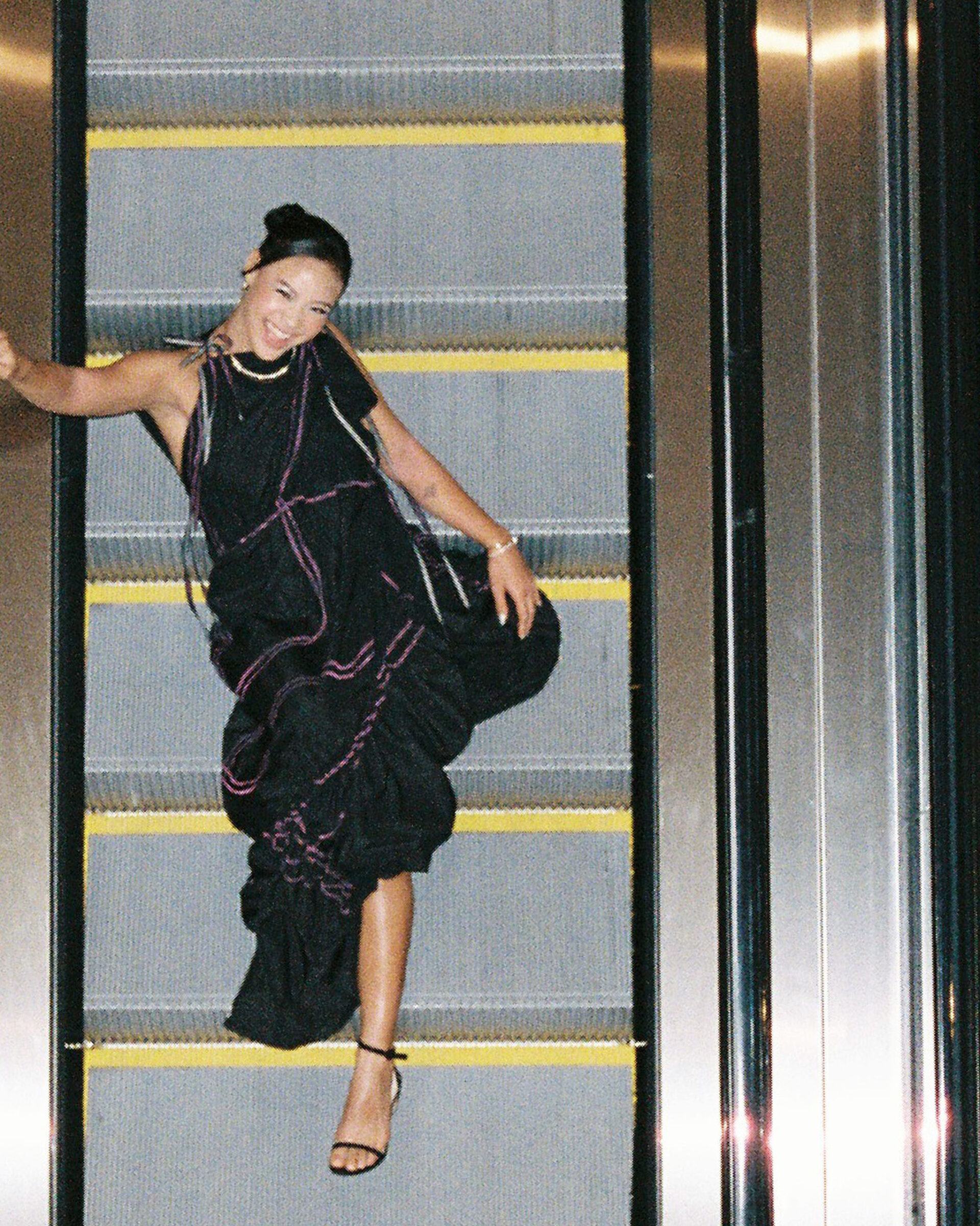 DJ, journalist, and Vogue Philippines May 2023 cover star Sai Versailles attended the gala wearing a dress by Prince Padilla’s NOVEL, which is among the featured brands featured in Vogue Philippines’ September 2023 cover story. It features white stitching that trails down in organic waves, as well as a cheeky high-slit. She pairs the dress with a pair of JOS mundo white mules lent to her from their archives and a silver bag.