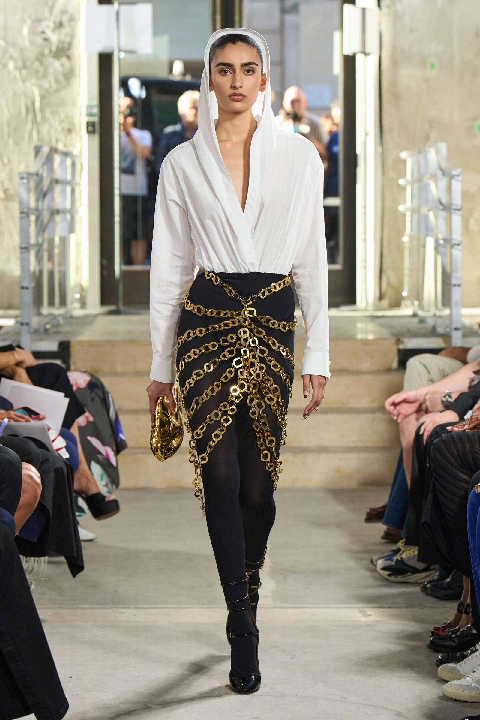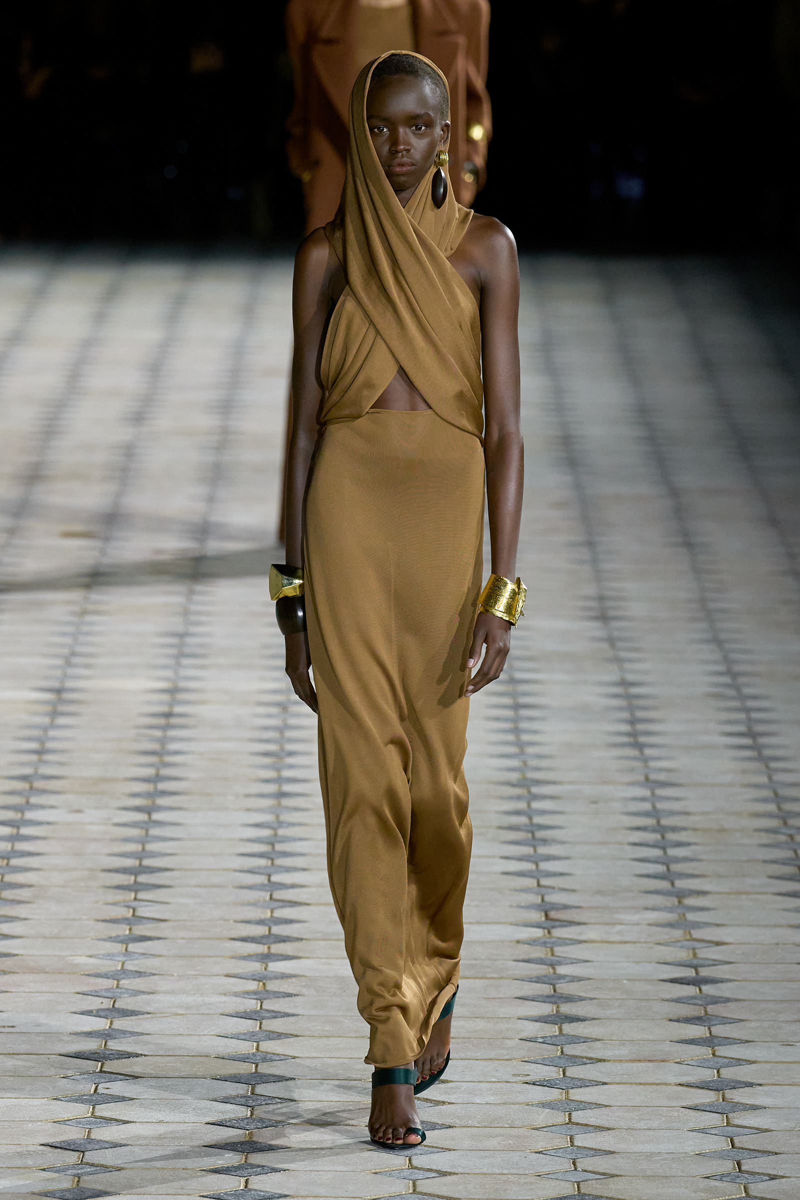 Seamless head-to-toe draping were seen across runways, from Saint Laurent’s twisted and hooded columnar dresses or Alaia’s modern cloaks to Ferragamo’s cowls that transition into tube dresses. From the top, falling into deep Vs, and softly gathered folds, the season’s speaks of  a desire to cocoon within the refinement of a polished silhouette.