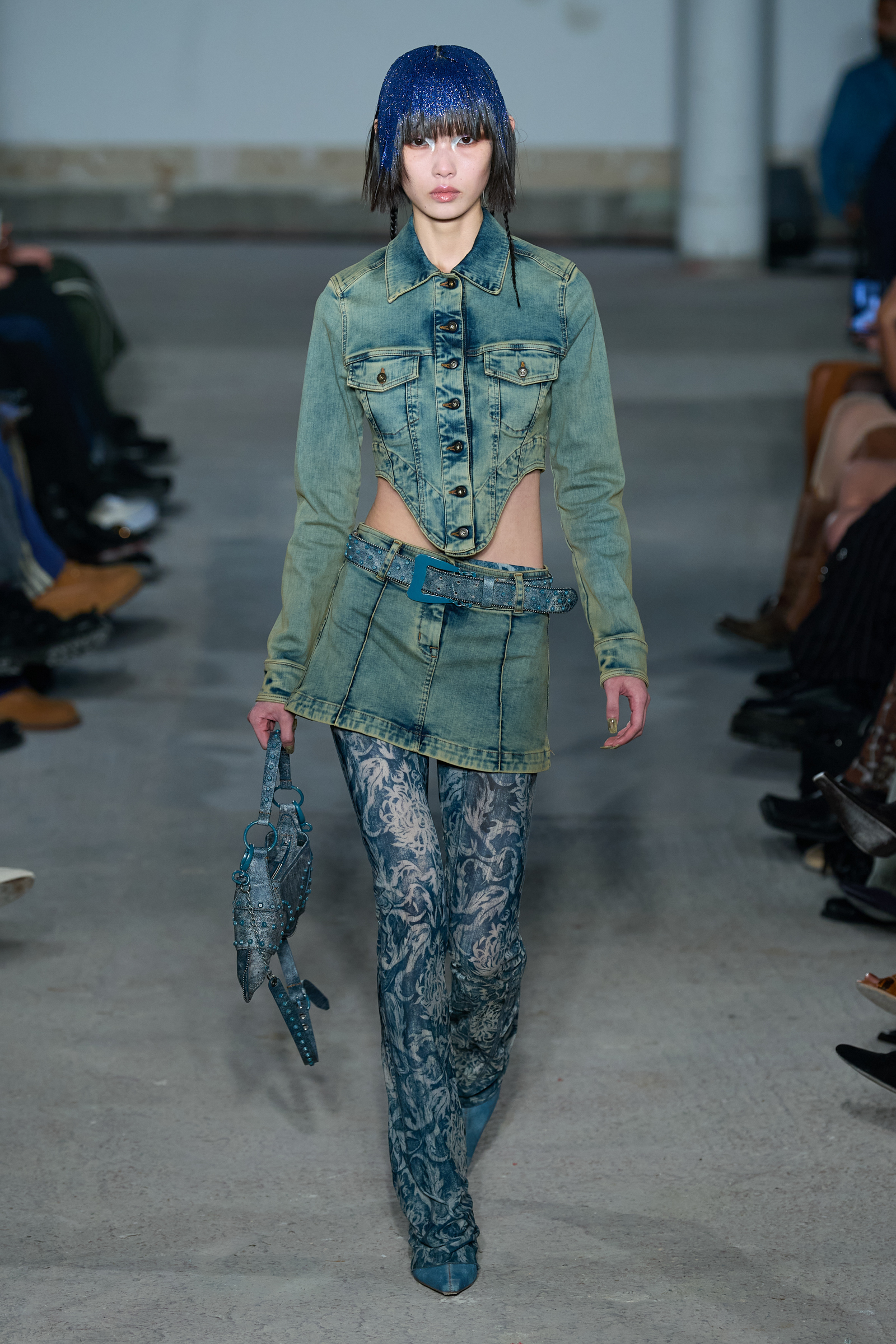 On the runway, denim gets re-energized with textural evolutions from prints, studs, deconstructions, and reconstructions. Silhouettes ran the range from dresses to gowns to separates to coordinates. Name a shape, and denim this season has probably done it. Blumarine’s collection presents a number of full looks in a faded warm-toned wash, but the star of the show was metal studs emblazoned in designs across the whole collection. Burberry revitalizes indigo by melding it with monotoned lace giving a more tactile feel. At Diesel, imperfection is the goal with distressed edges and frayed fringes. Says creative director Glenn Martens, “The piece is supposed to look ‘broken’ so that you can live with it forever.”
