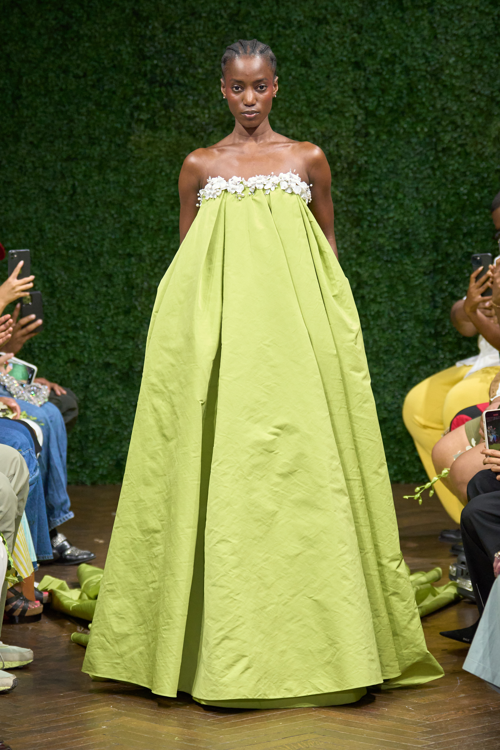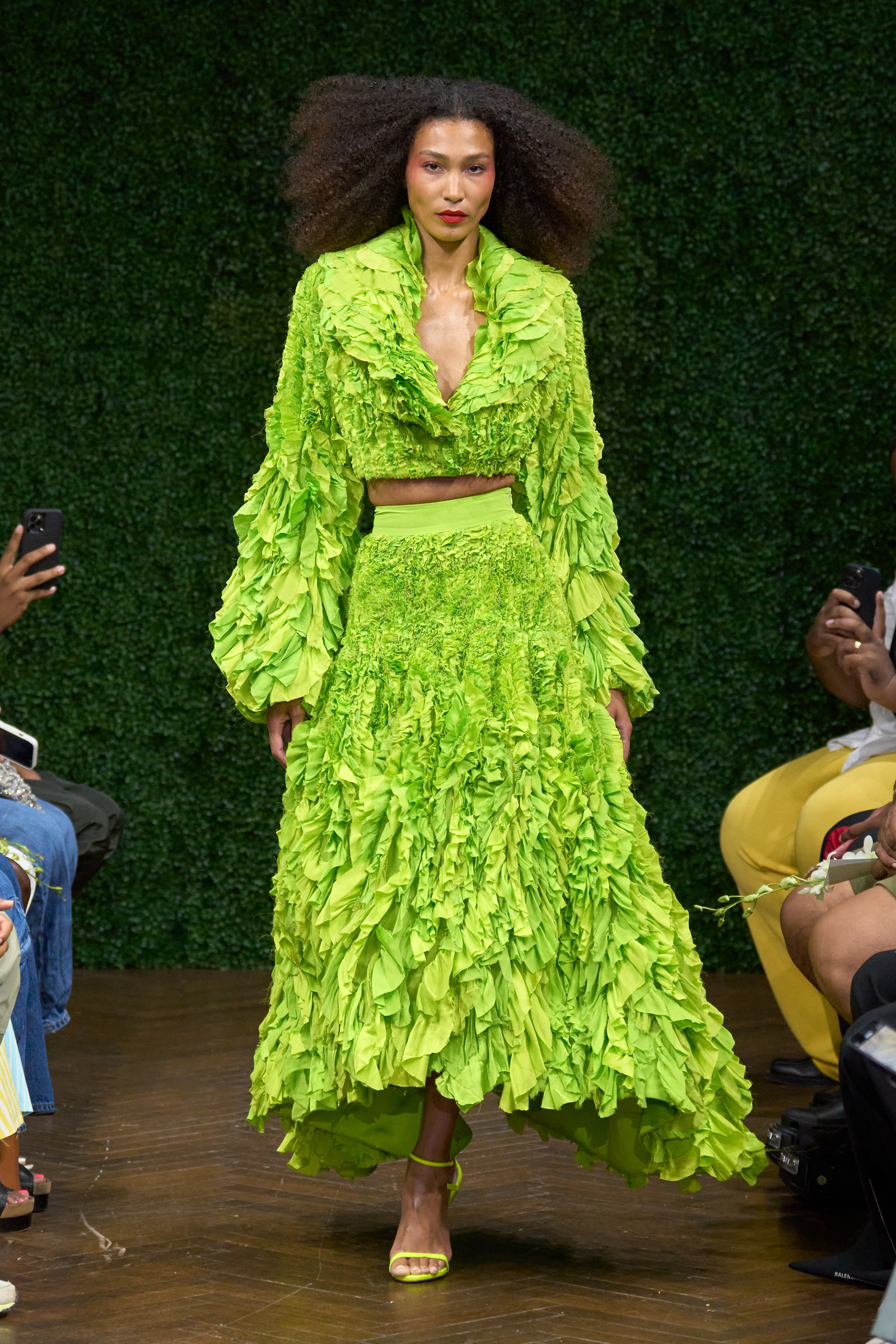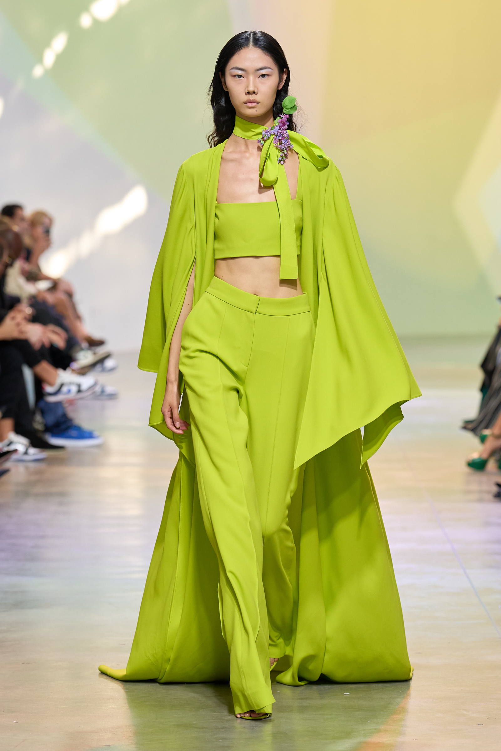 Pantone may have announced Viva Magenta as its color of the year—but the runway’s hue of choice begs to differ. Consistent on designers’ roster of spring-summer offerings is one striking shade: lime green. The highlighter hue figured on a three-piece set at Elie Saab, sculptural crop bustier at Collina Strada, and high-low goddess frock at Michael Kors. Italian house Fendi and Japanese label CFCL offer a subdued tone with see-through layers and porcelain white accents. Aliette and Etro lean into the shade’s deeper spectrum via an asymmetric billowy dress and bodycon two-piece. The color of now is a celebration of summer’s full-fledged return to the great outdoors.