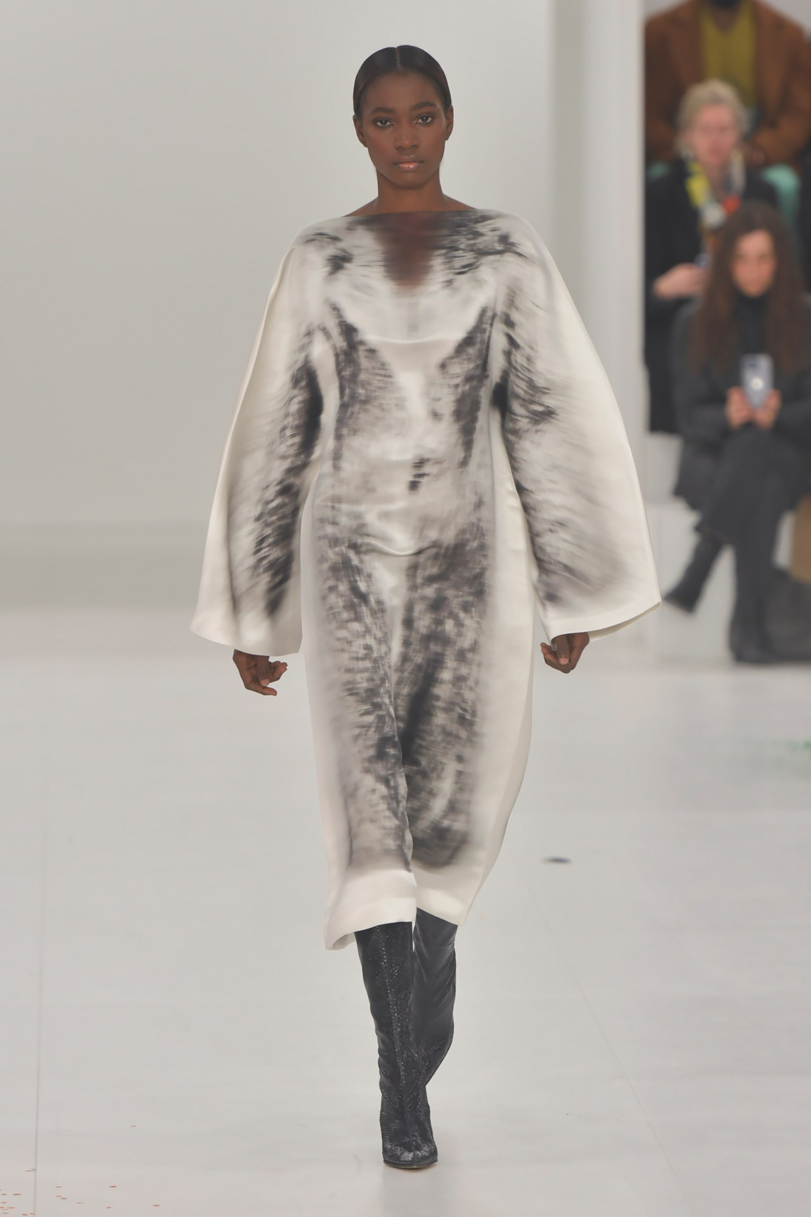 In spite of the subdued style mood, there were still a handful of moments that caused the now traditional stir on social media. Coperni’s Sébastien Meyer and Arnaud Vaillant—pioneers when it comes to fusing tech and fashion—had five Boston Dynamics robo-dogs (all named Spot) prowling their show space and interacting with models (Lila Moss made one hold her meteorite Swipe Bag). Anrealage’s Kunihiko Morinaga displayed clothes with photochromic hardware technology that transformed the colors and prints of faux fur, velvet and knits. Louis Vuitton’s collection focused on a modern interpretation of the “French-girl wardrobe”, but featured neon illuminated shades inspired by Phantom of the Opera that added a futuristic touch.