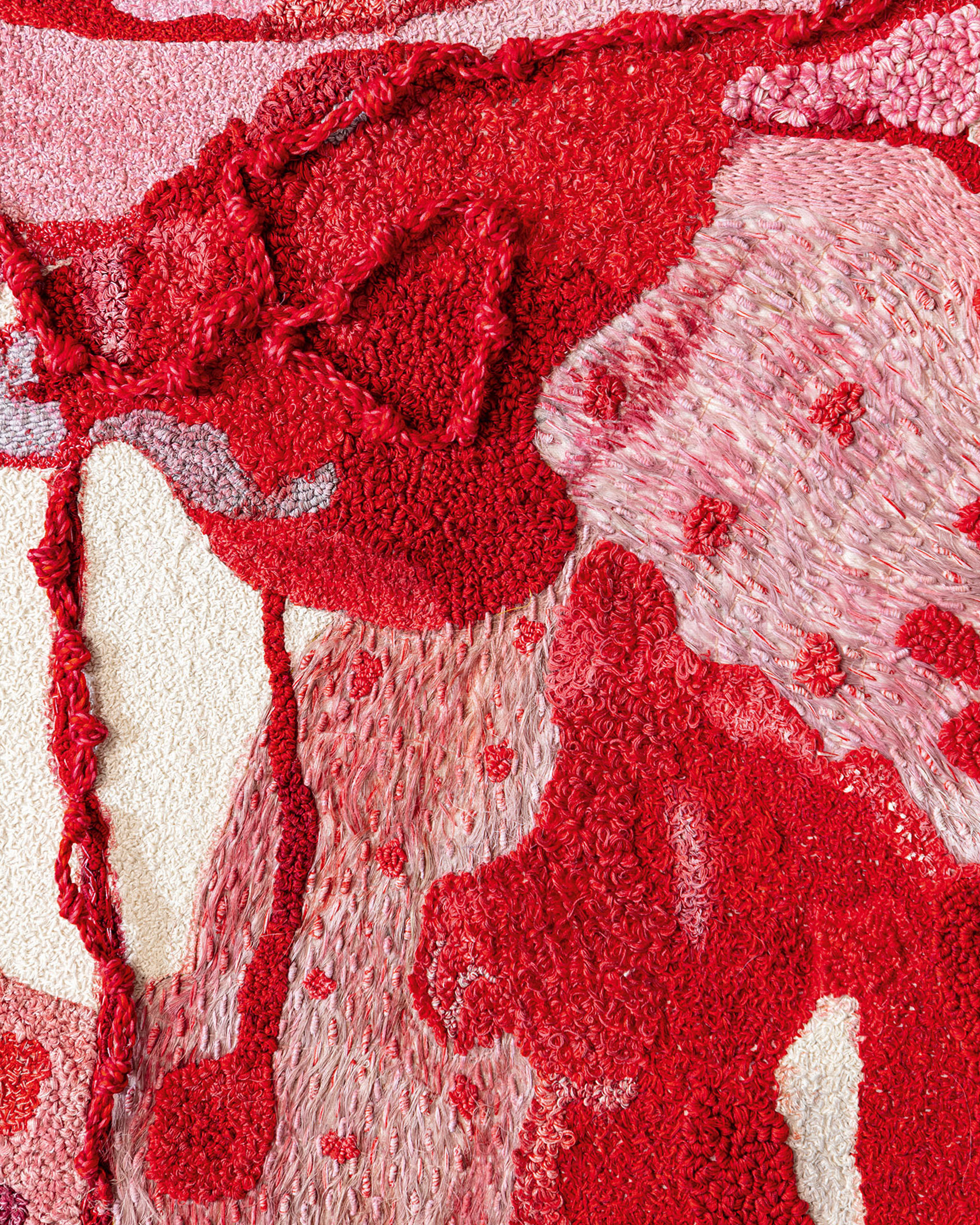 In a tangent room, an exhibition, called Mul Mathi, is housed. From the Roots, based on the works of Indian artists Madhvi Parekh and Manu Parekh, we discover the heights of high craft twined with their art. Here, a staggering amount of textural embroidery replaces their brushstrokes. Micro topographies of stitches sprawl across the immense canvases. These are thousands of minutes captured in thread. This inspiring peek into the highest craft and art shares a space with the students who are just beginning on this path.
