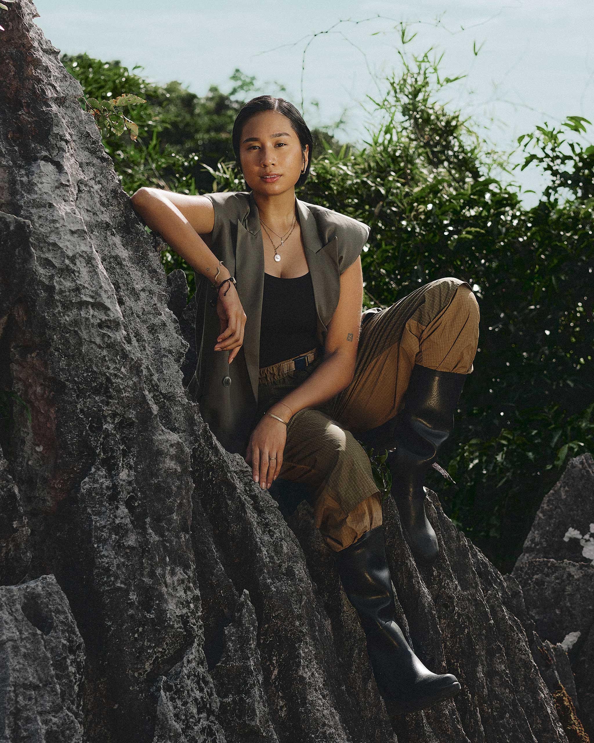 D.D.DAILY tailored vest, THE NORTH FACE utility trousers at R.O.X., AIGLE rain boots. Photographed by Artu Nepomuceno for the February 2024 Issue of Vogue Philippines