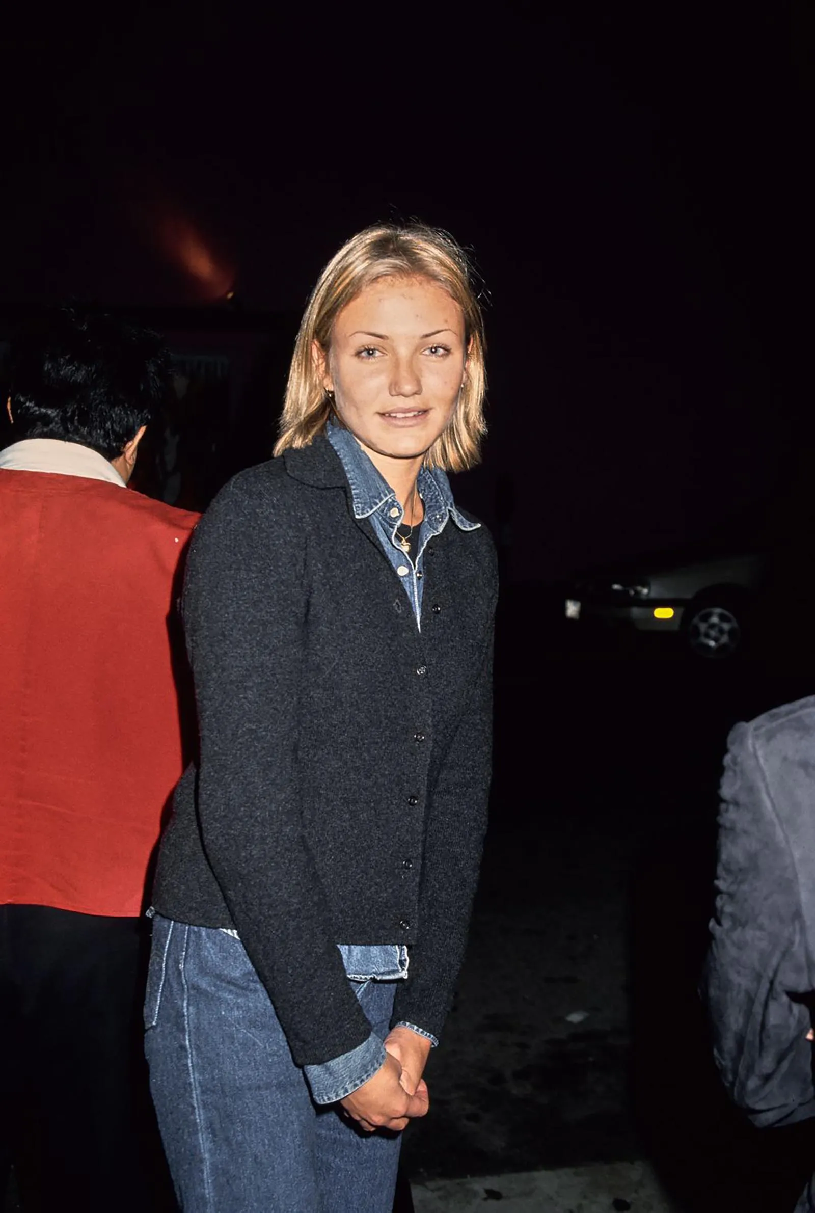 A more pared-back counterpoint to her Charlie’s Angels wardrobe of off-the-shoulder crop tops and low-slung jeans, Diaz’s everyday style was pure stripped-back ’90s cool – all cropped cardigans and midi-skirts paired with those signature peroxide locks.
