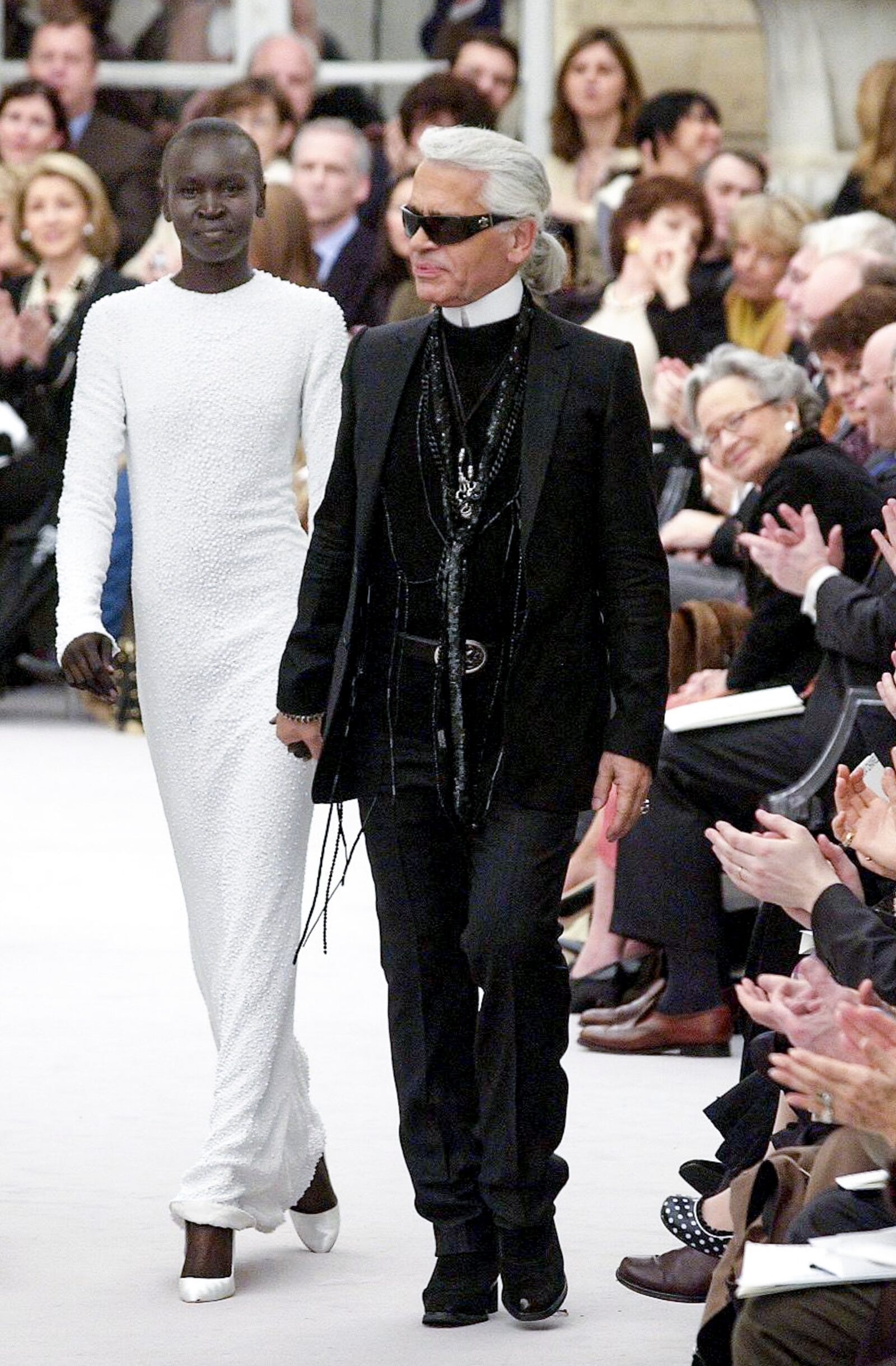 Karl’s autumn/winter 1995 couture show featured not one but five Chanel brides, including Claudia Schiffer and Helena Christensen. Karl played with Coco’s original signature designs, with an ankle-length fitted dress in the style of a classic Chanel bouclé jacket.