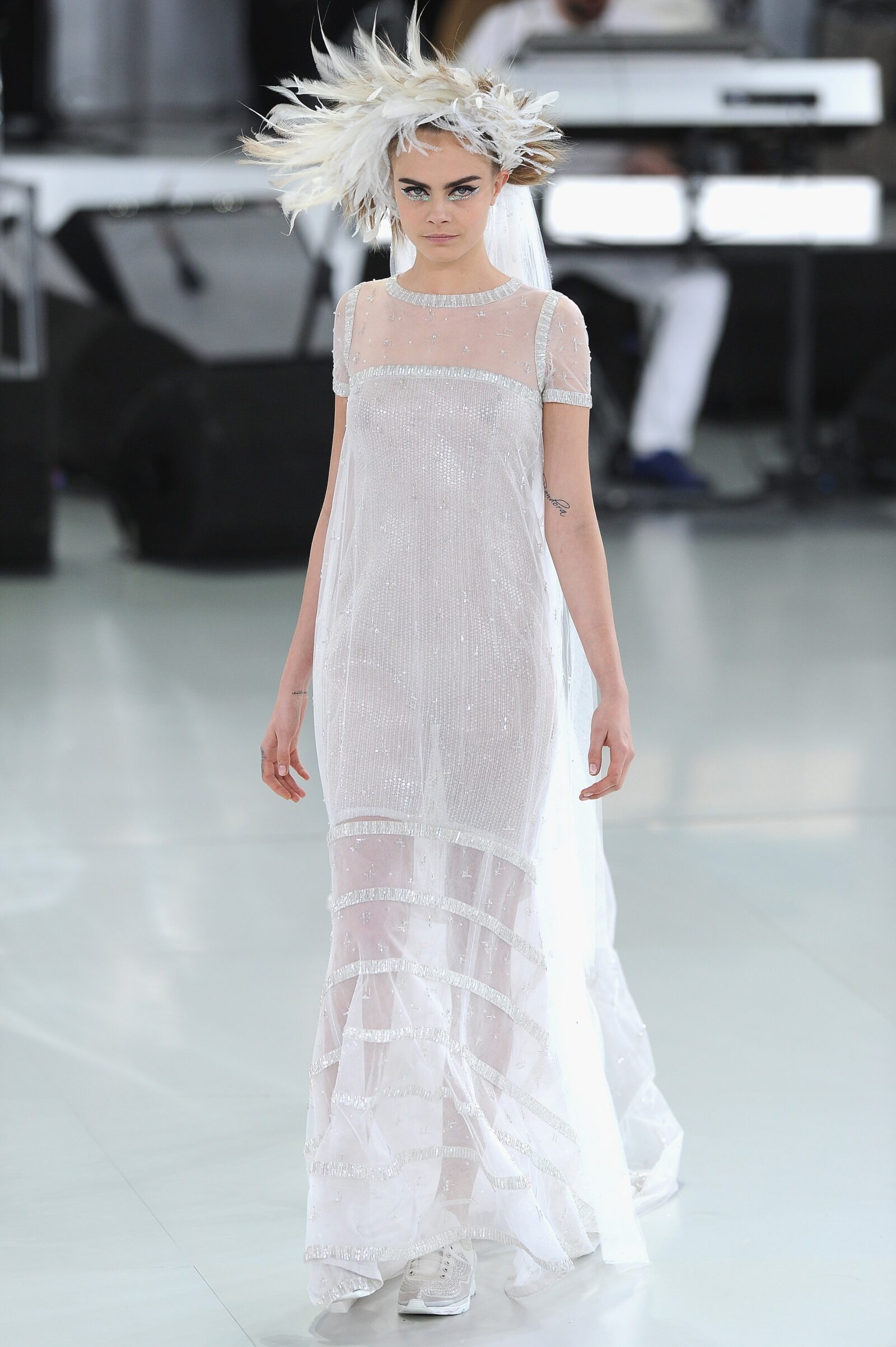 Cara Delevingne closed Chanel’s spring/summer 2014 show in a sequin gown with a relaxed feel thanks to the T-shirt neckline and the matching sequin trainers. We’d love to see Cara rewear it. on the red carpet.