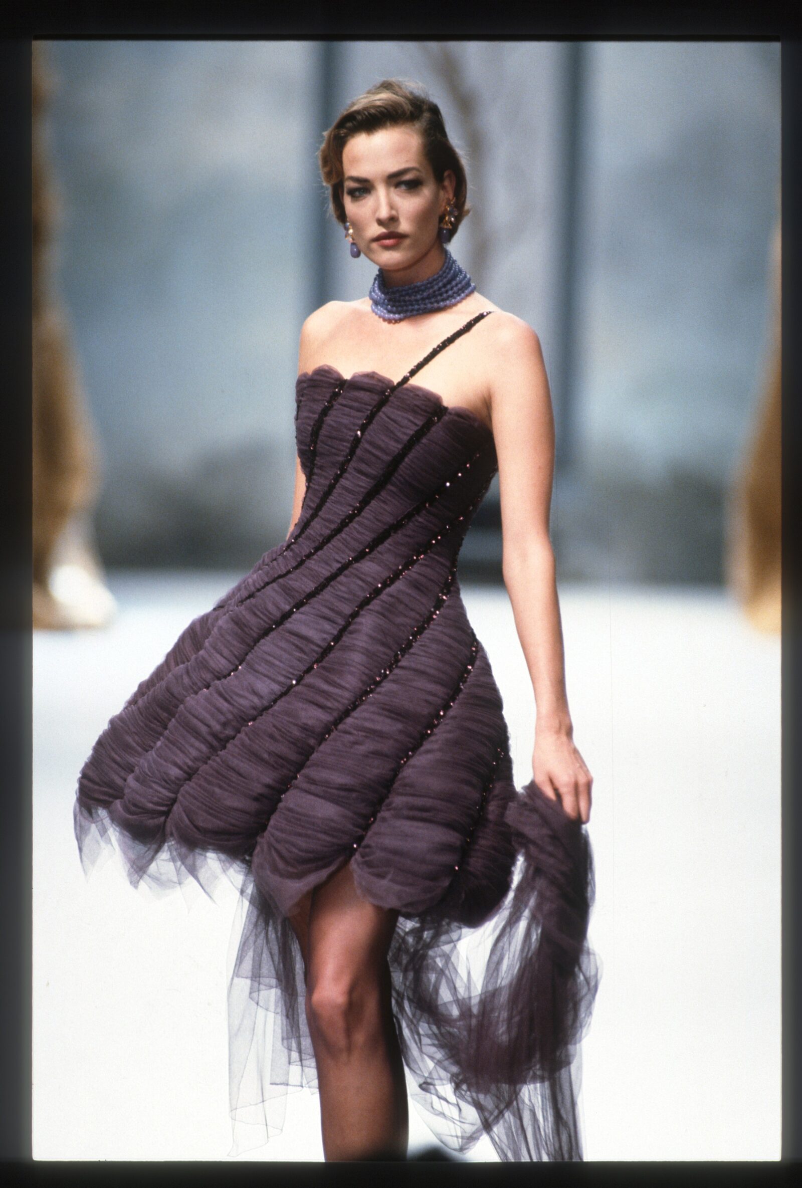 A star like Selena Gomez or Zoë Kravitz could revive this elegant black look Tatjana Patitz wore on Chanel’s autumn/winter 1991-1992 runway. The addition of the black sheer jacket makes this strapless minidress look really special.