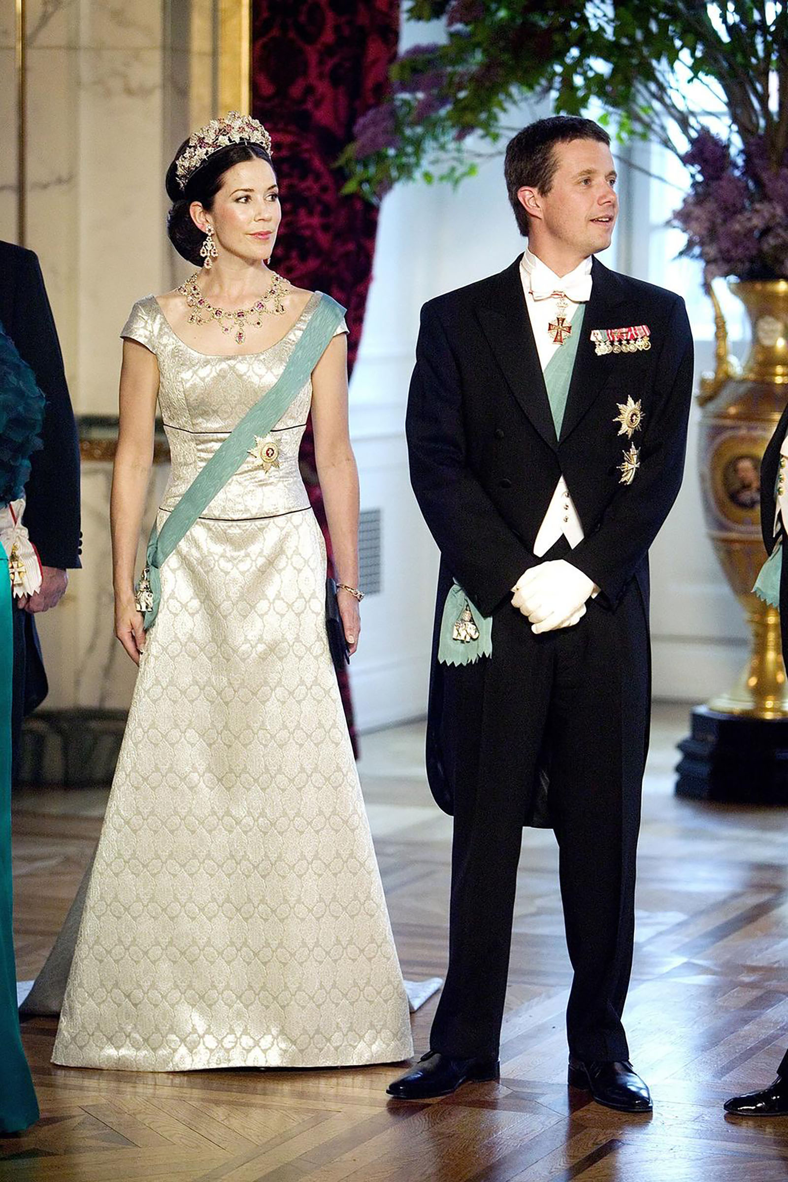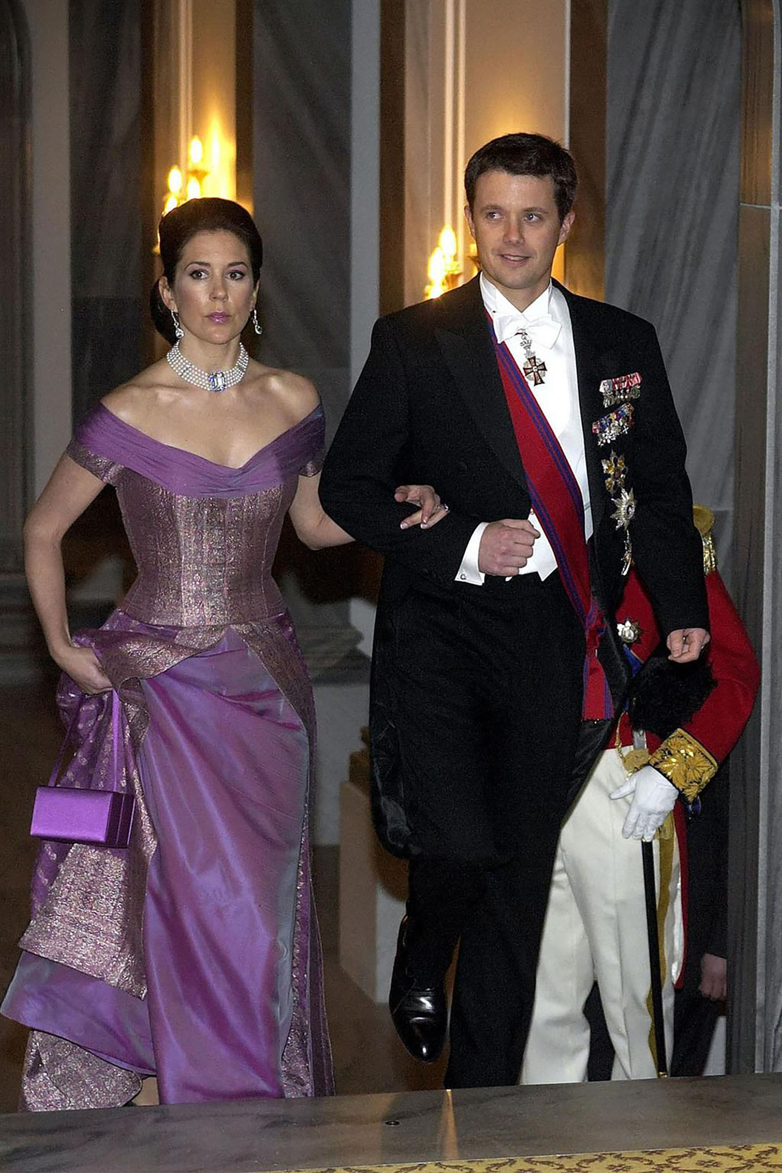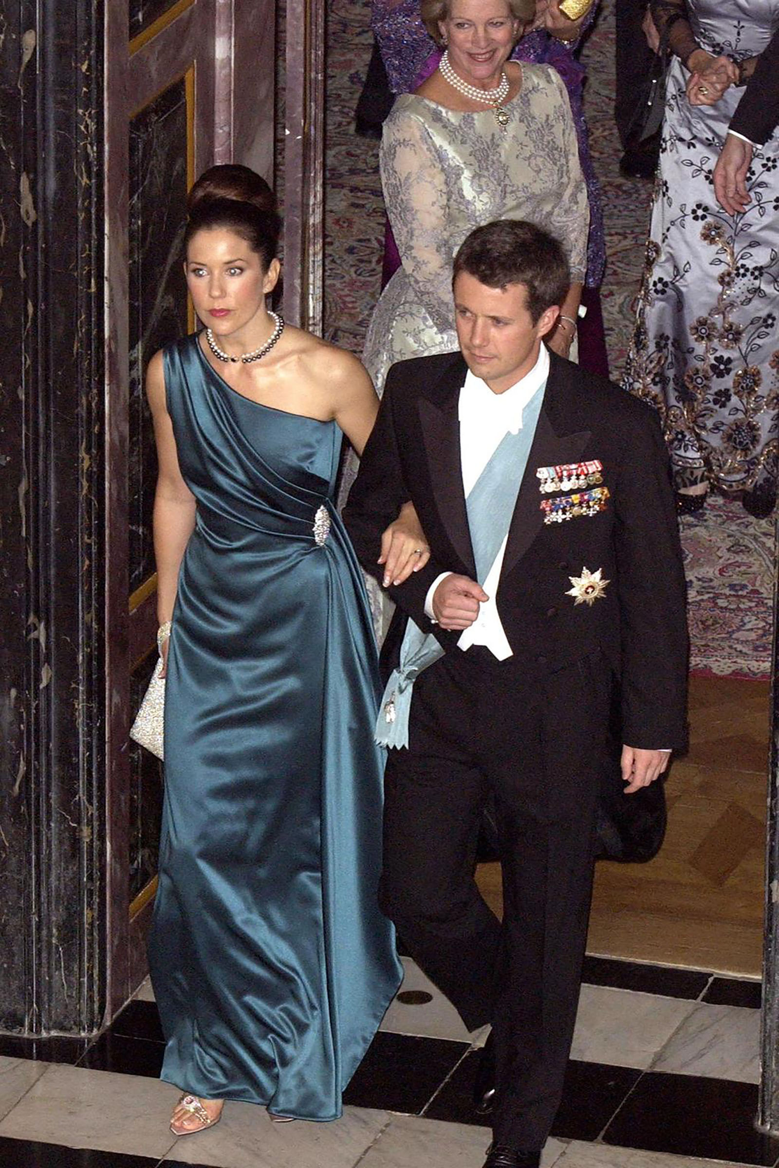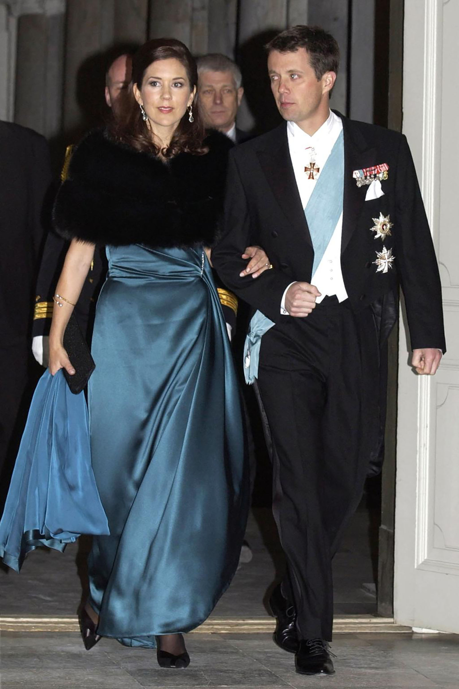 Princess Mary with Prince Frederik, with the princess wearing a blue gown and stole, in 2004.