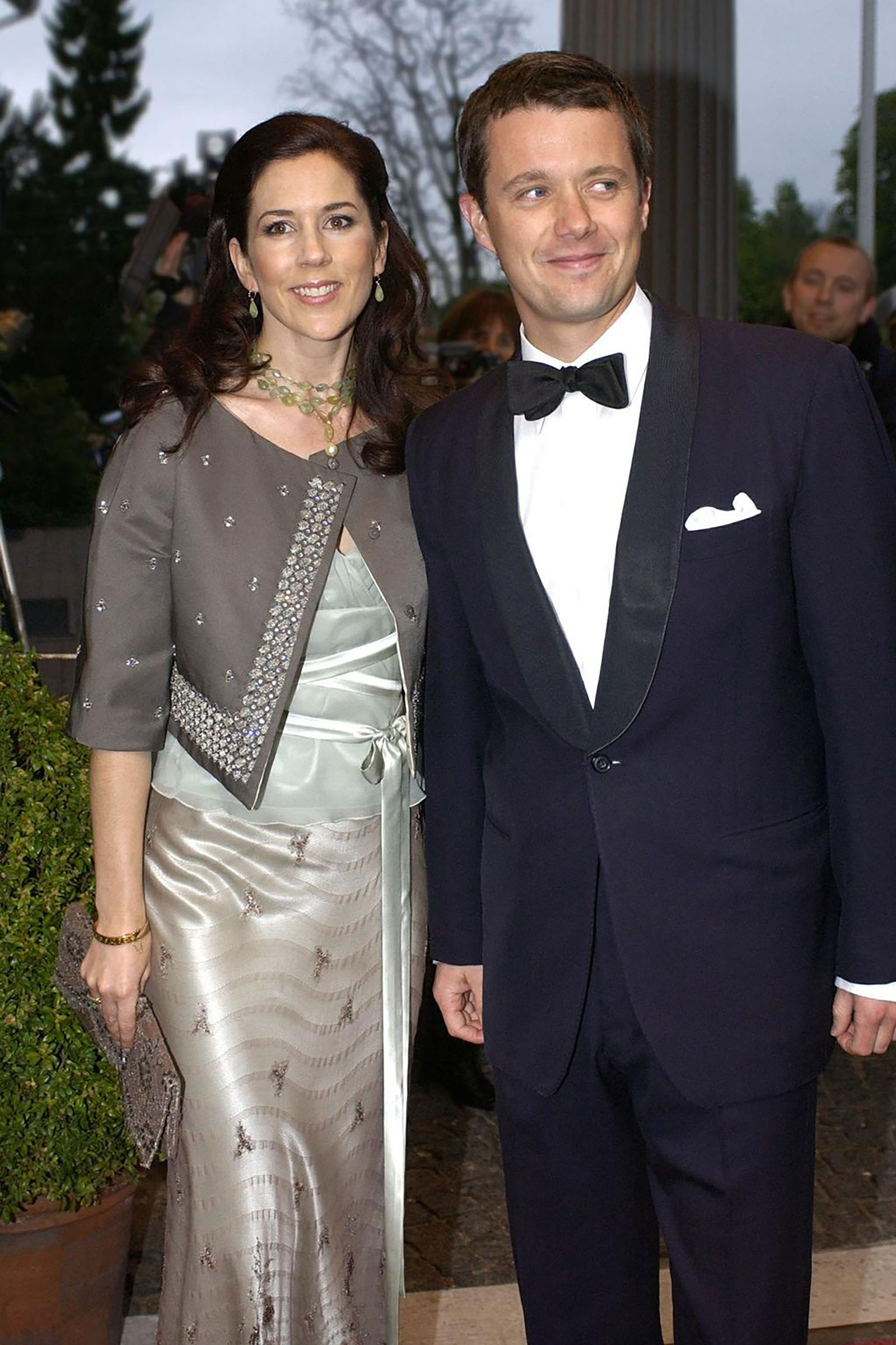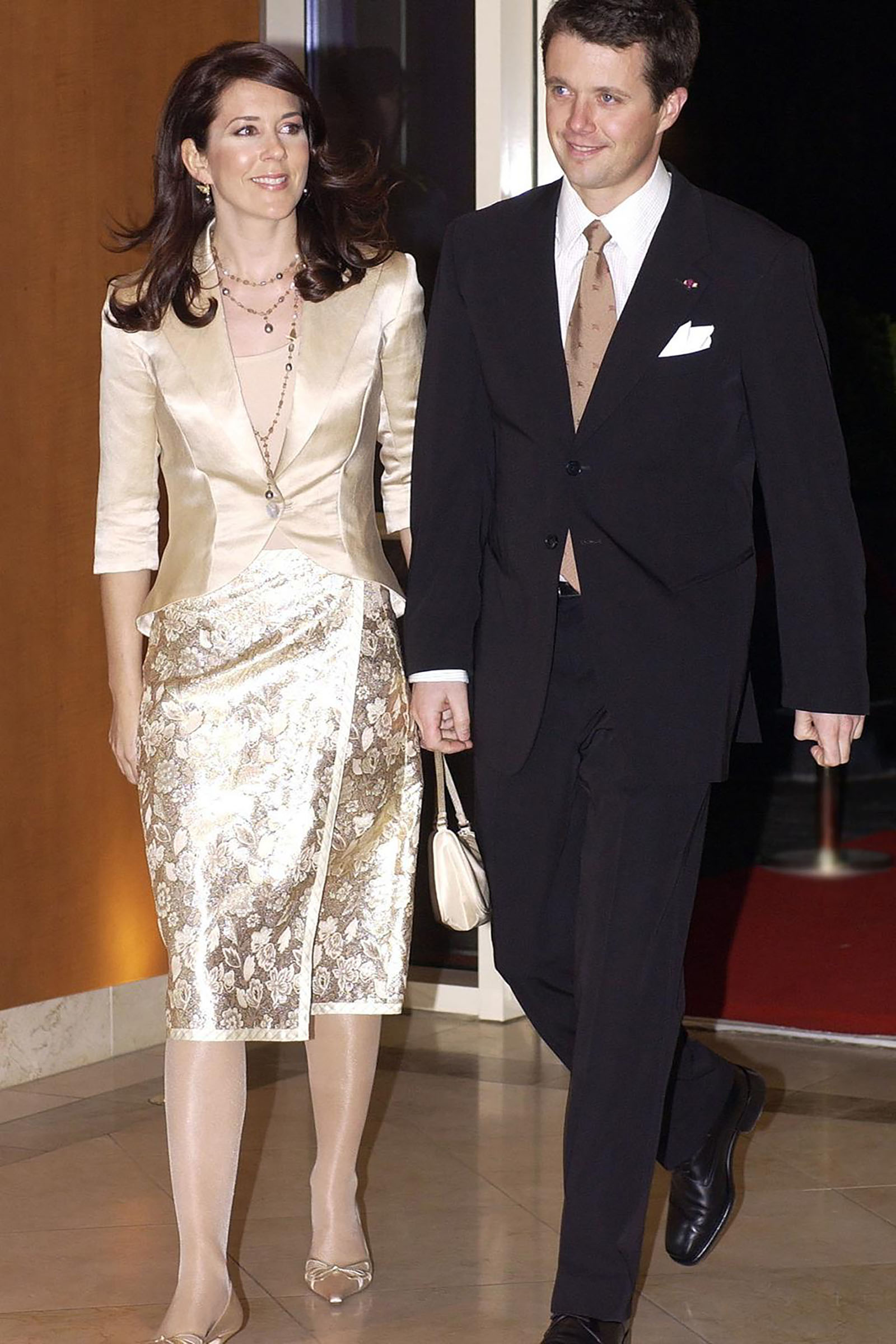 Princess Mary in a white blazer and bronze top, alongside Prince Frederik in 2004.