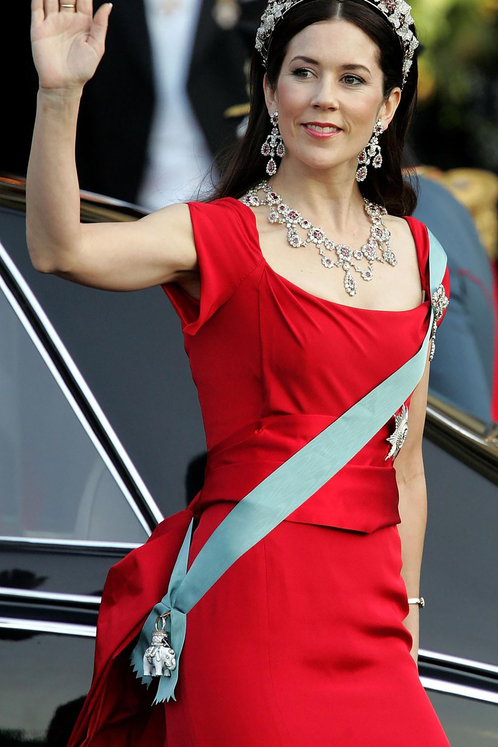 Princess Mary, the day before her royal wedding in 2004, wearing a red Uffe Frank gown and the Danish Ruby Parure.