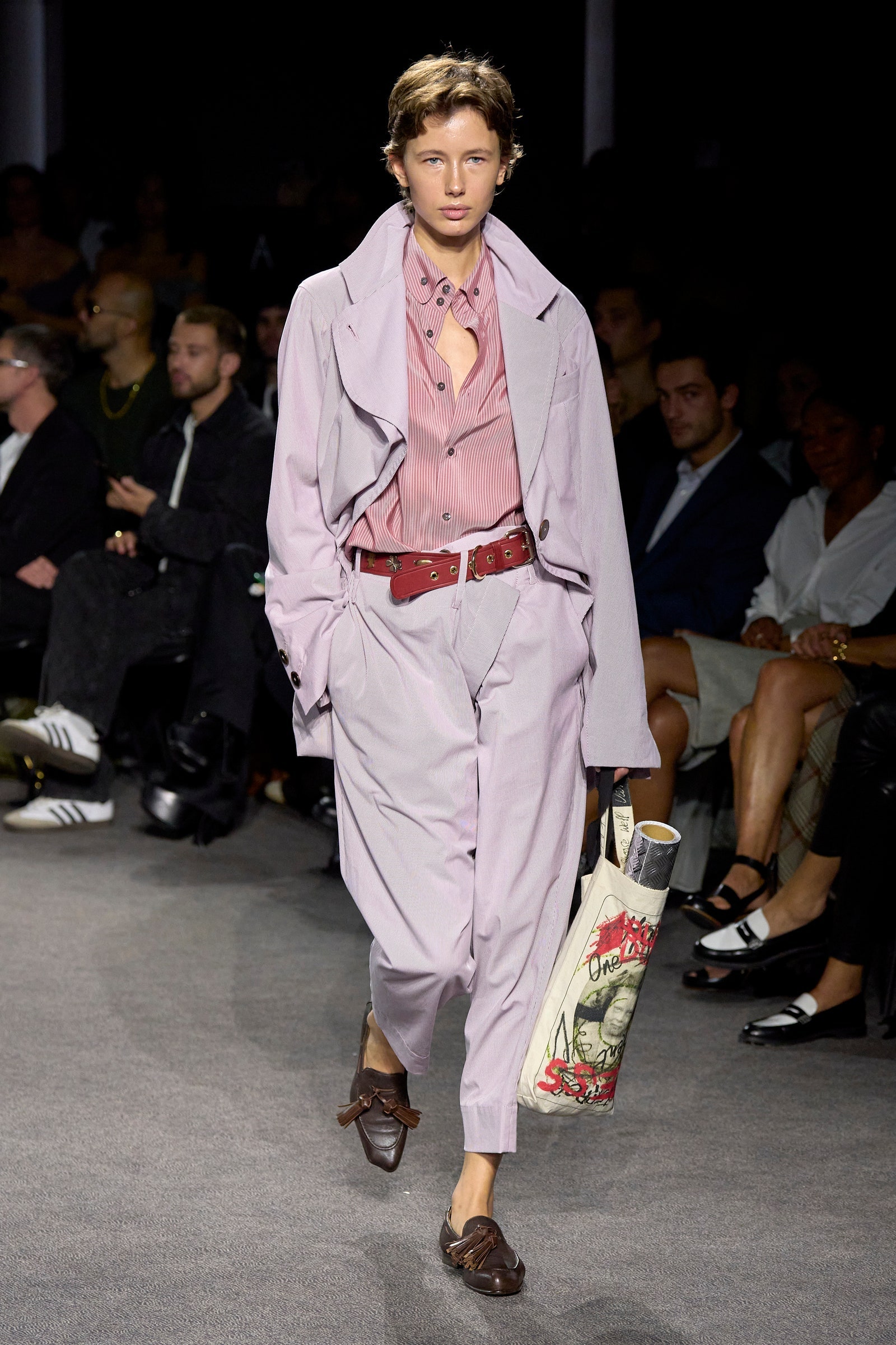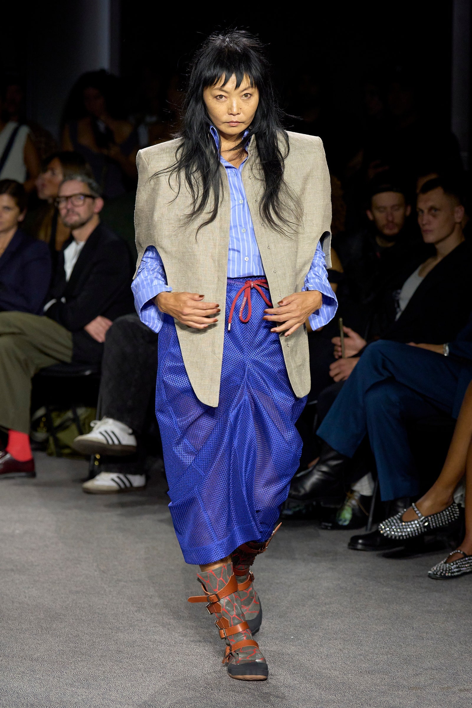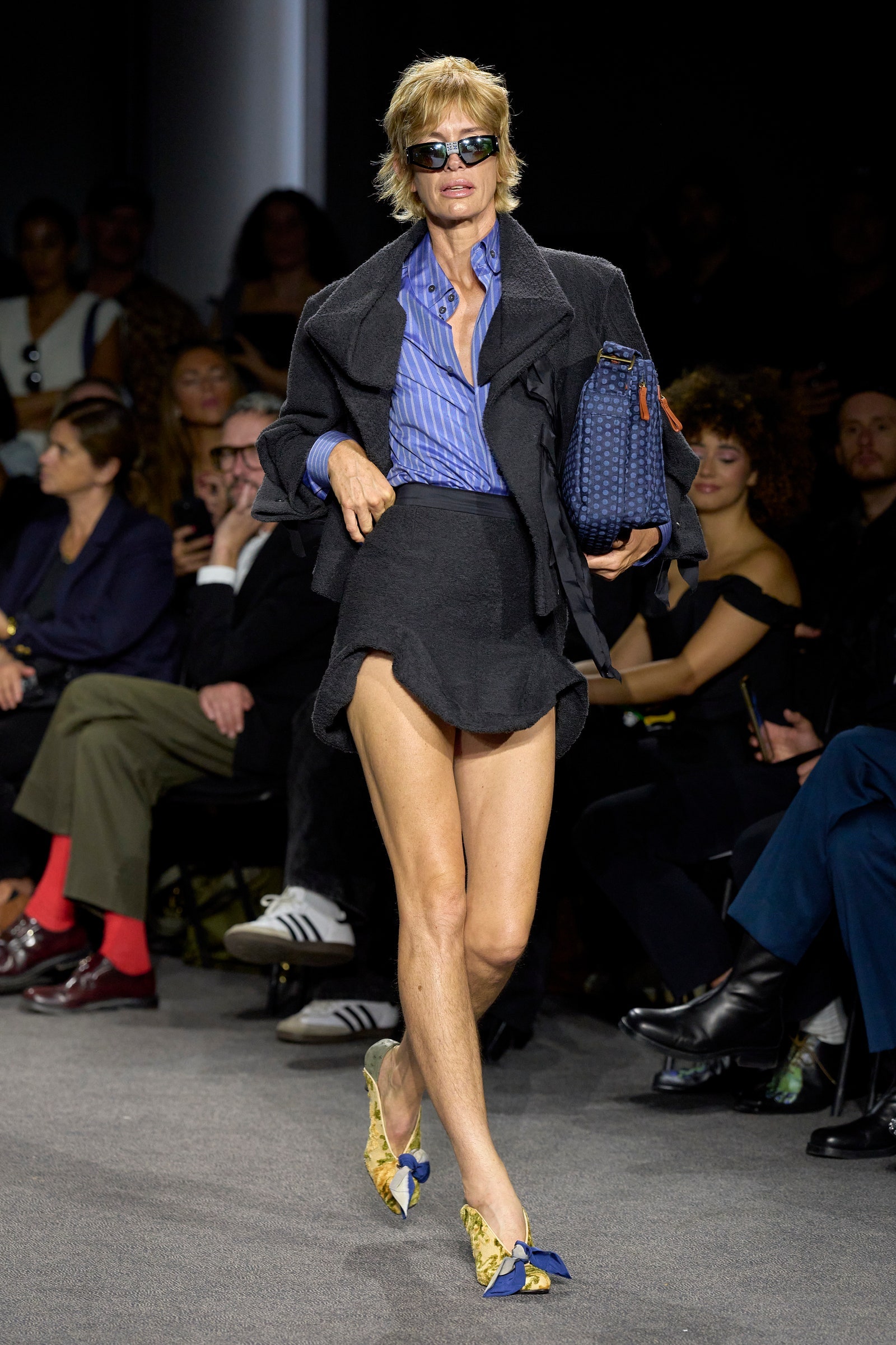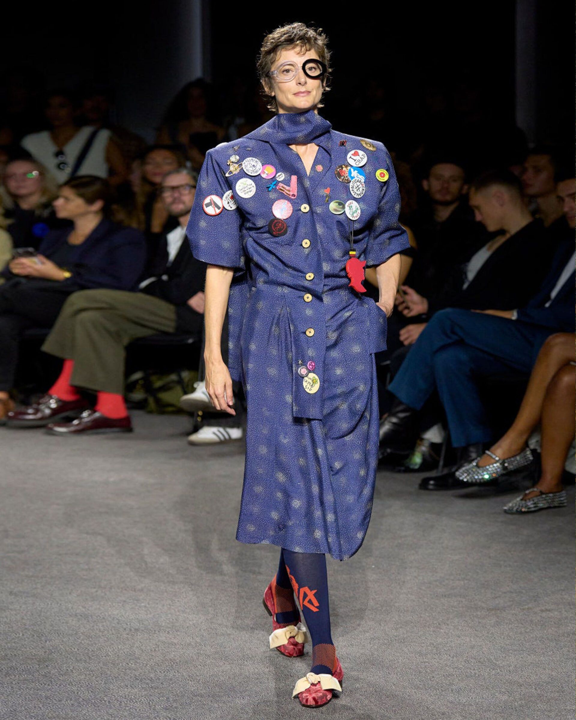 It’s testament to the timeless power of Vivienne Westwood’s personal style that Kronthaler’s premise never felt retrospective or nostalgic. Instead, these clothes were cool, from the ease of the masculine tailoring and throw-on day dresses to the more sculpted suiting silhouettes and structured dresses. Kronthaler’s inimitable couture hand was evident in the touches of ballroom that infused the more dramatic volumes, but things never burst into eveningwear or pronounced glamour. “These are the clothes I think we should wear in the street, really. It’s quite street,” as he said. Was there anything in there that Dame Vivienne wouldn’t have worn? “I added some miniskirts. She didn’t wear miniskirts for a long time. But she loved them.”