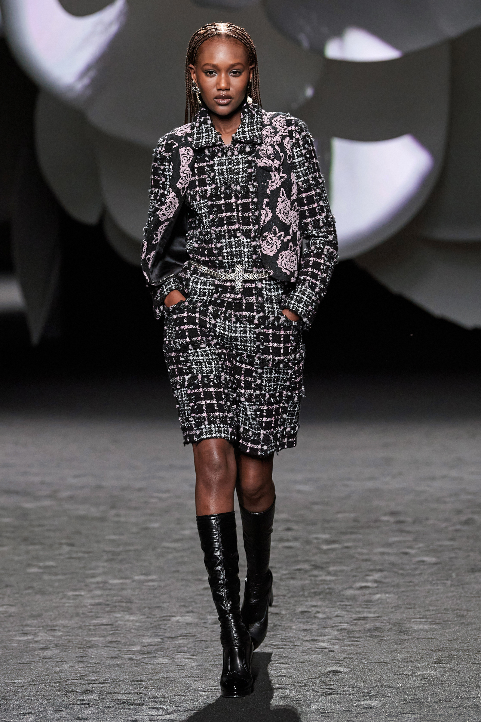 Chanel’s emblematic camellia flower was given superstar status in Virginie Viard’s show this season. Inside the structure on Place Joffre, where the maison’s shows are held while the Grand Palais undergoes refurbishment, two circular runways surrounded enormous camellia sculptures. As the show started, a film directed by Inez & Vinoodh, starring the actress Nana Komatsu on a merry-go-round, was projected onto the flowers. If those ideas vaguely reflected a theme of circularity, Viard’s collection expressed it in eclecticism: the idea that the Chanel aesthetic is so strong that you can apply it to any silhouette, garment, texture or technique… et voilà, it says Chanel.