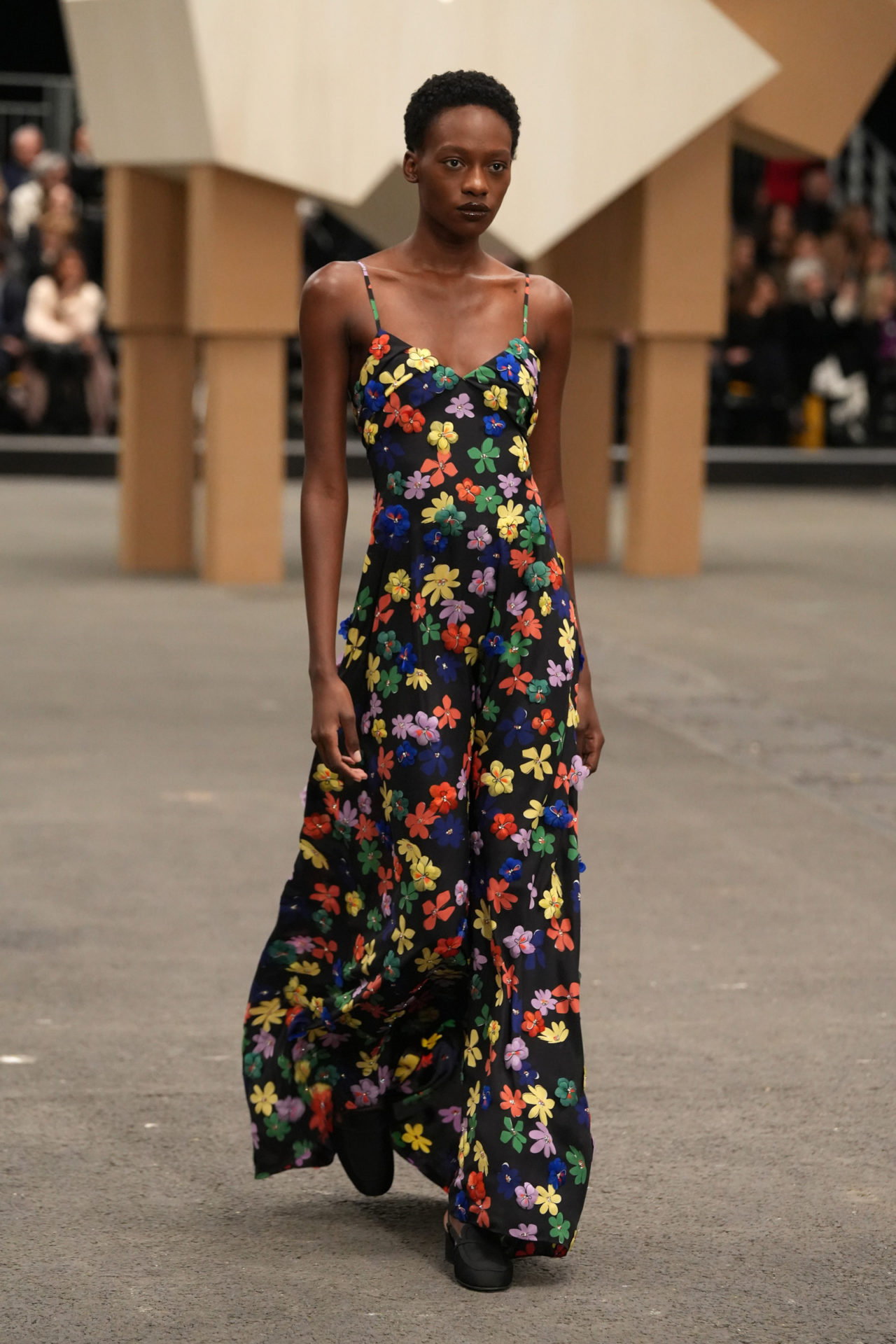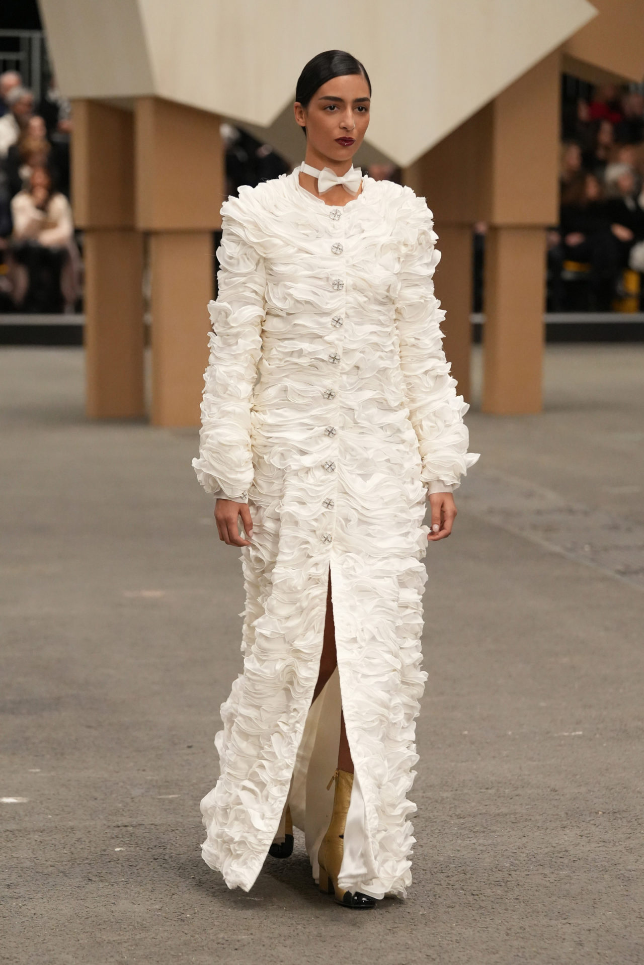 Viard cited parades and majorettes as inspirations for the collection, something that could easily have manifested in a very different expression had she not reduced and distilled her influences the way she did. When constructions intensified, like the dense micro-ruffling of a rigid A-line skirt and a floor-length coat, or the polite petticoats adorned in tactile flower applique, she maintained her purified approach. It materialised in a mainly black and white palette, with occasional dusty colours. “I like it when the marvellous bursts forth and the course of events is interrupted,” she said, referring to the set, but the same could be said for her own creations. In the unlikely meeting she staged between couture, pageantry and techno, the Chanel collection emerged triumphantly sophisticated.