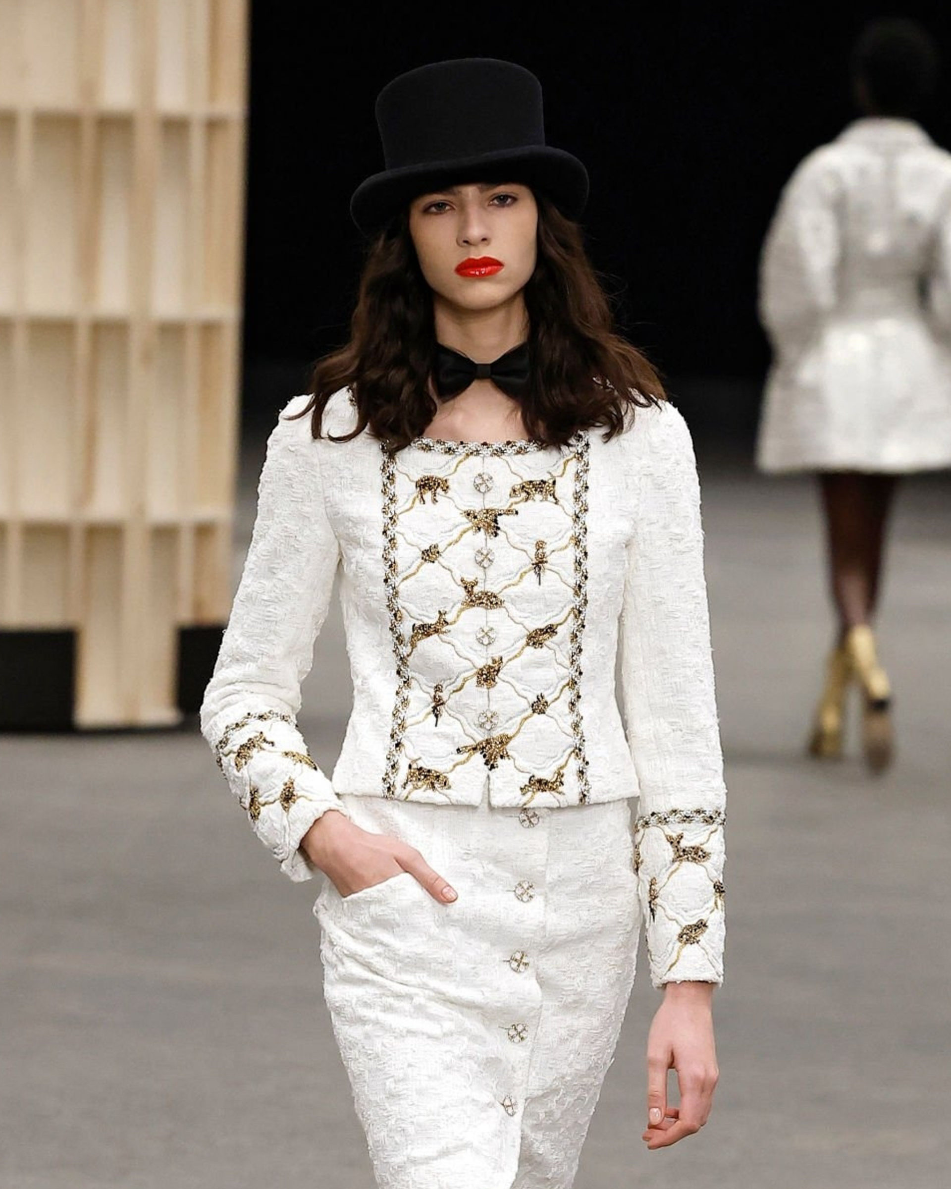 “I see more than ever the décor pushing the collection. It’s a lancement of the collection,” Pavlovsky said. “Virginie uses décor to maximise the details, and it’s working pretty well for Chanel. Working with different artistic compositions helps to launch and position the collection. She uses it to give maximum visibility.” The bestiary motifs filtered into the garments themselves, in large crystal dog head embellishments, sparkly embroidery collages of bunnies and cats, and the swallow-stitched veil that adorned the bride (who emerged from a colossal rolling elephant). This was by no means a cutesy collection, however. Viard adapted the animal motifs into silhouettes that were simplified both in volumes and hemlines: short shorts and miniskirt-suits, long-line column dresses, and tuxedo-inspired tailoring elements.