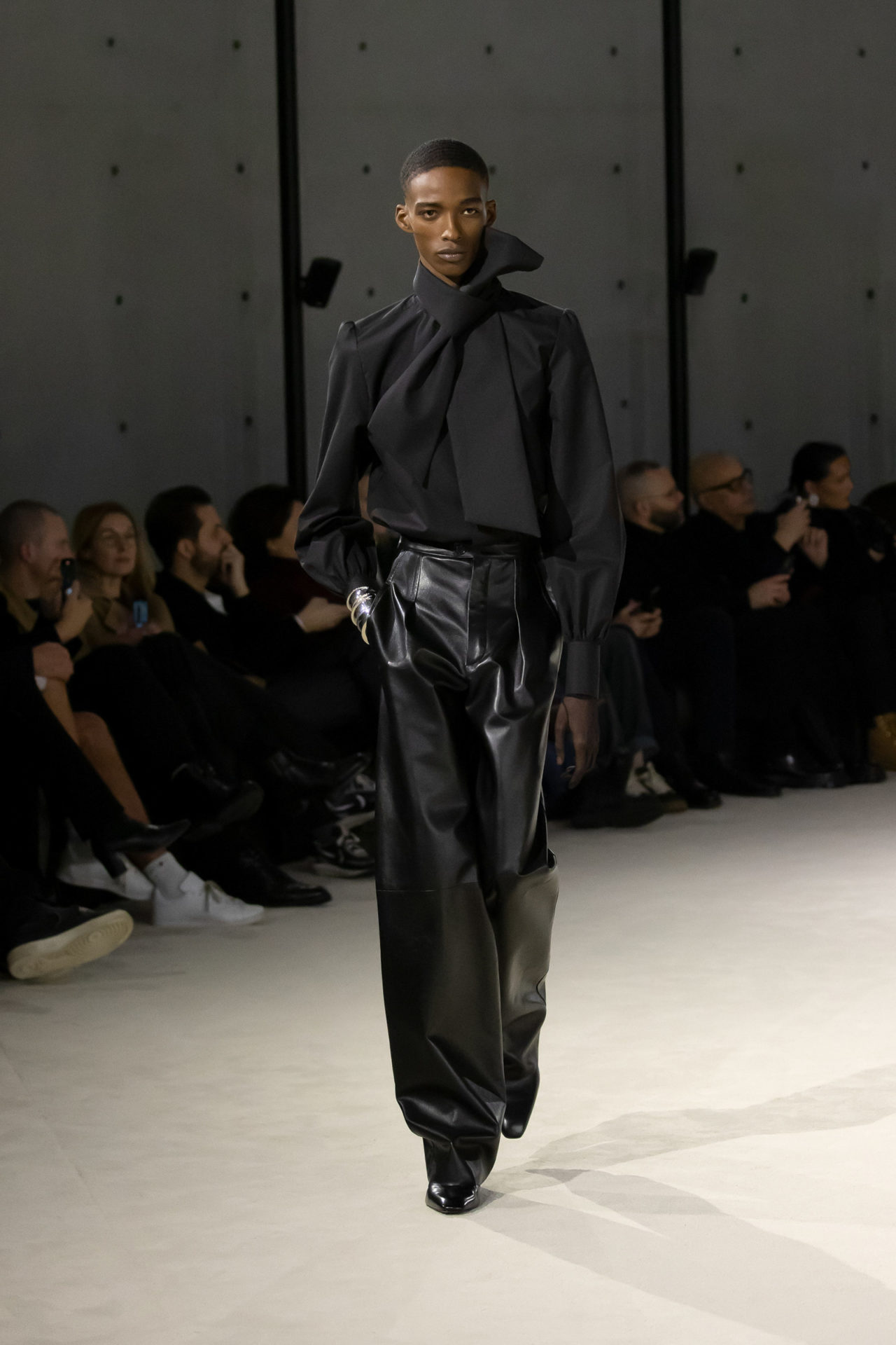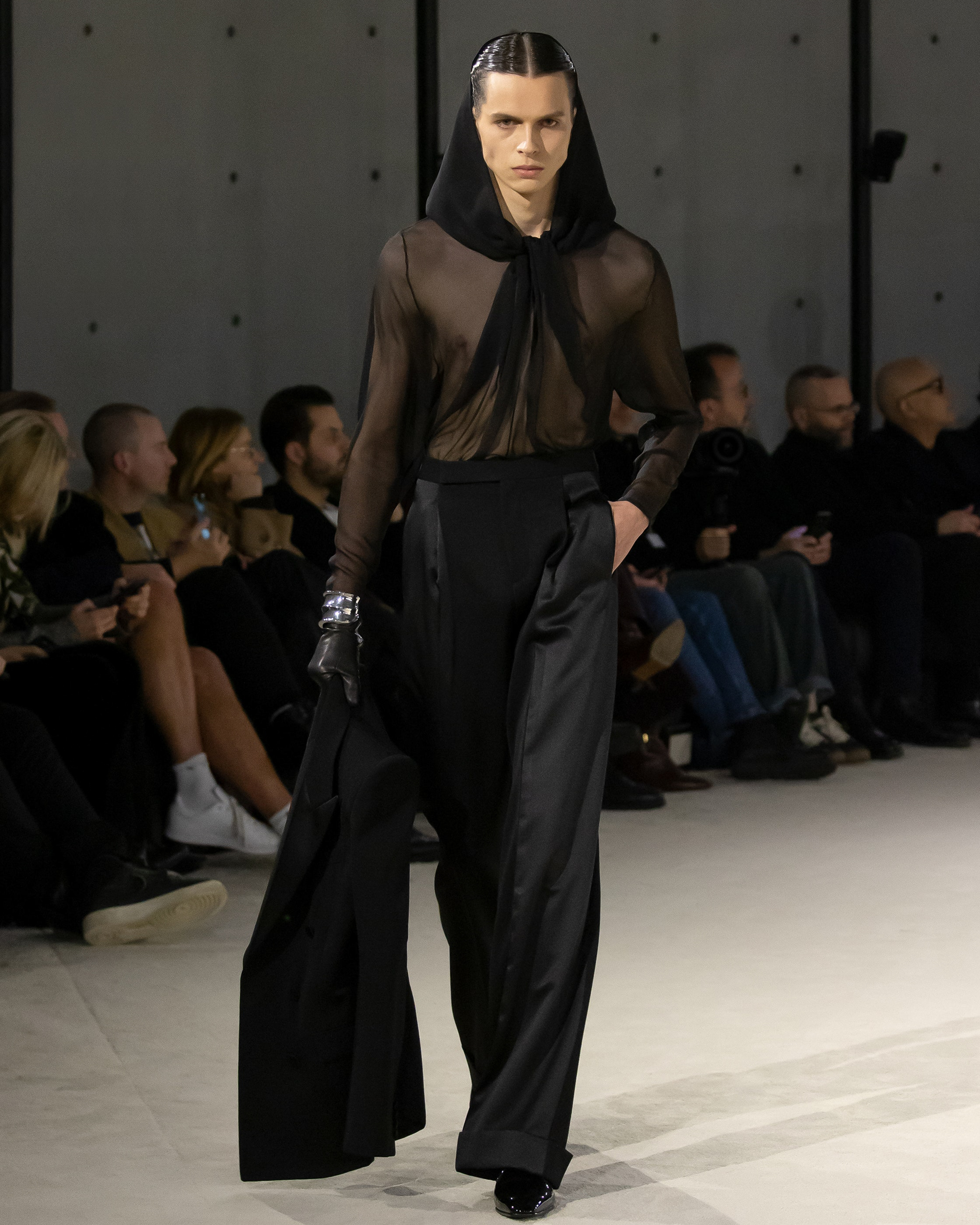 “For me, when I see this collection, I feel like it’s my second collection. My first was last season in Marrakech and this is the second one,” Vaccarello said, reflecting on the menswear proposals that came before. “I think, before, it was me, but maybe it was too separate from the women’s. More and more, I want them to be almost one person. The man goes to the women’s and the woman goes to the men’s—there’s no difference. Before they were not at the same level and I really want to put them there.” He did that and more, in a highly considered proposal masterfully carved out in a kind of monochromatic, wistful masculinity: a strong, sensual, romantic, ceremonial reflection of the Yves-centric womenswear aesthetic that defines his work.