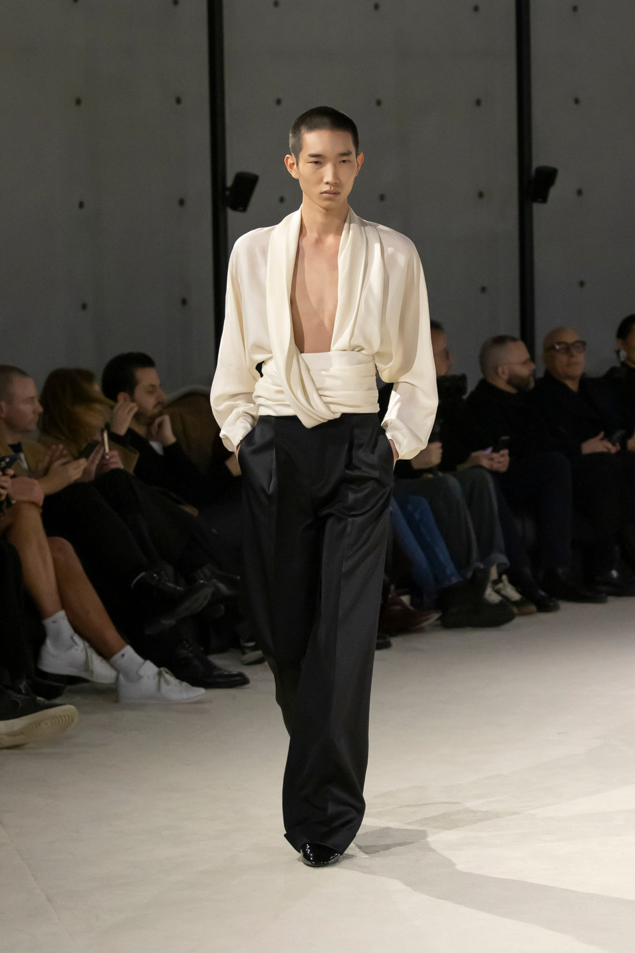 It was porn for precision freaks: every detail and every curve of Anthony Vaccarello’s first men’s show for Saint Laurent in Paris was so breathtakingly clean and defined that it hit you with entrancing effect. Presented in Tadao Ando’s chalky white cylinder within the Bourse de Commerce—a celestial alabaster light cast from its painted ceilings—it was like watching classical statues slowly moving around the great hall: their faces angelically chiselled, their shoulders heroically arched, their clothes draped like Hellenistic veils. “I like the masculine and the sculpted. The contradiction of that with the softness,” Vaccarello said casually before the show, but this was anything but a casual experience.