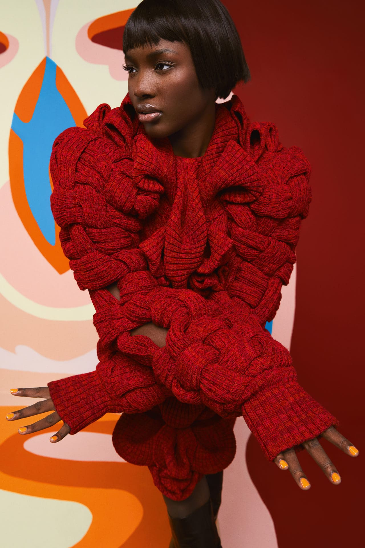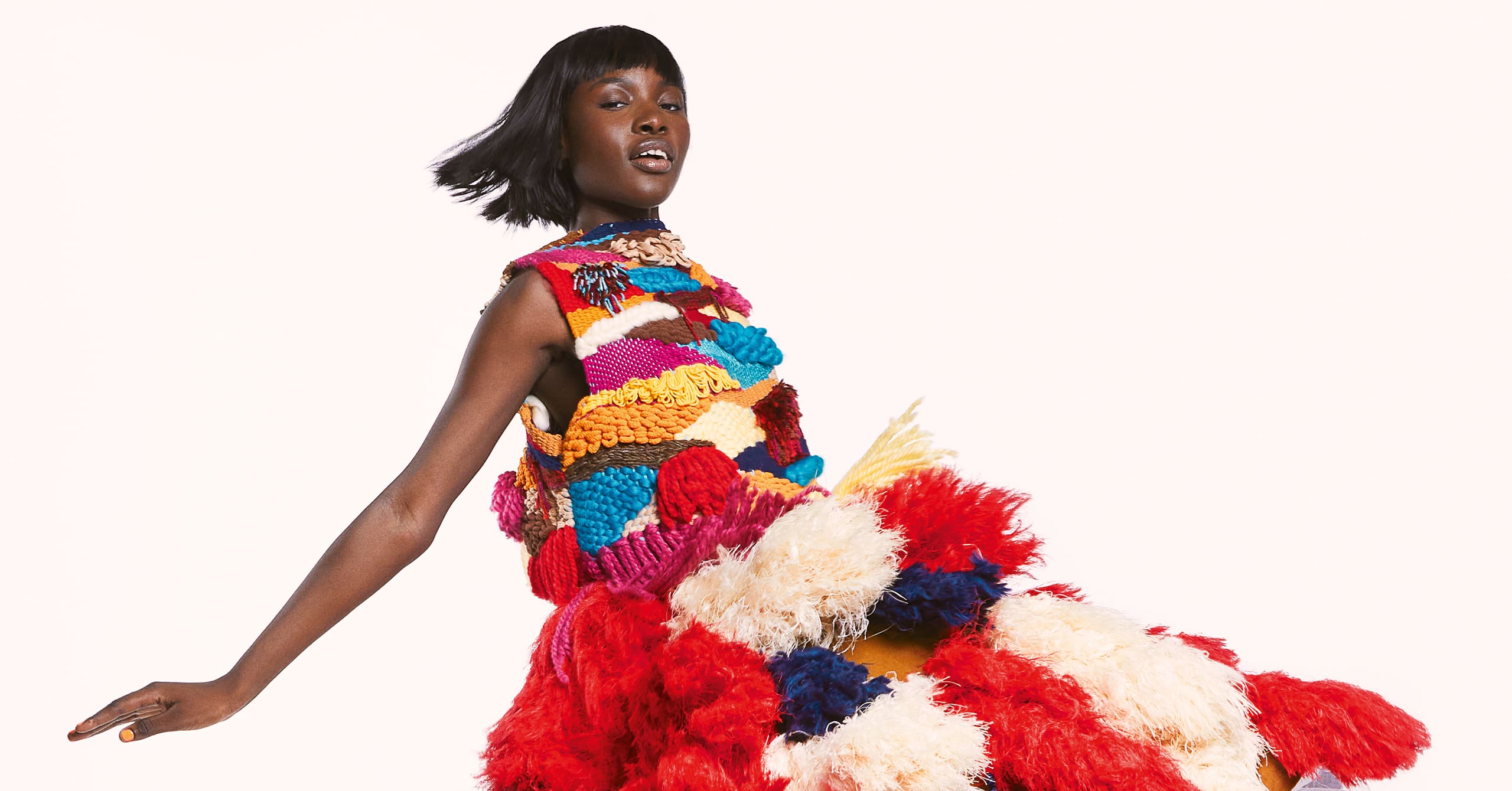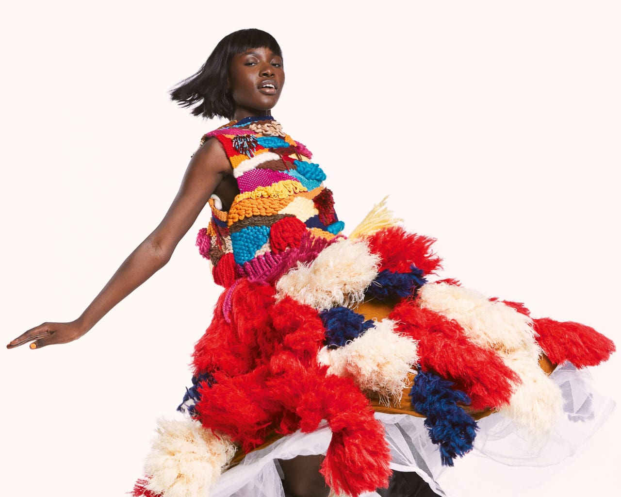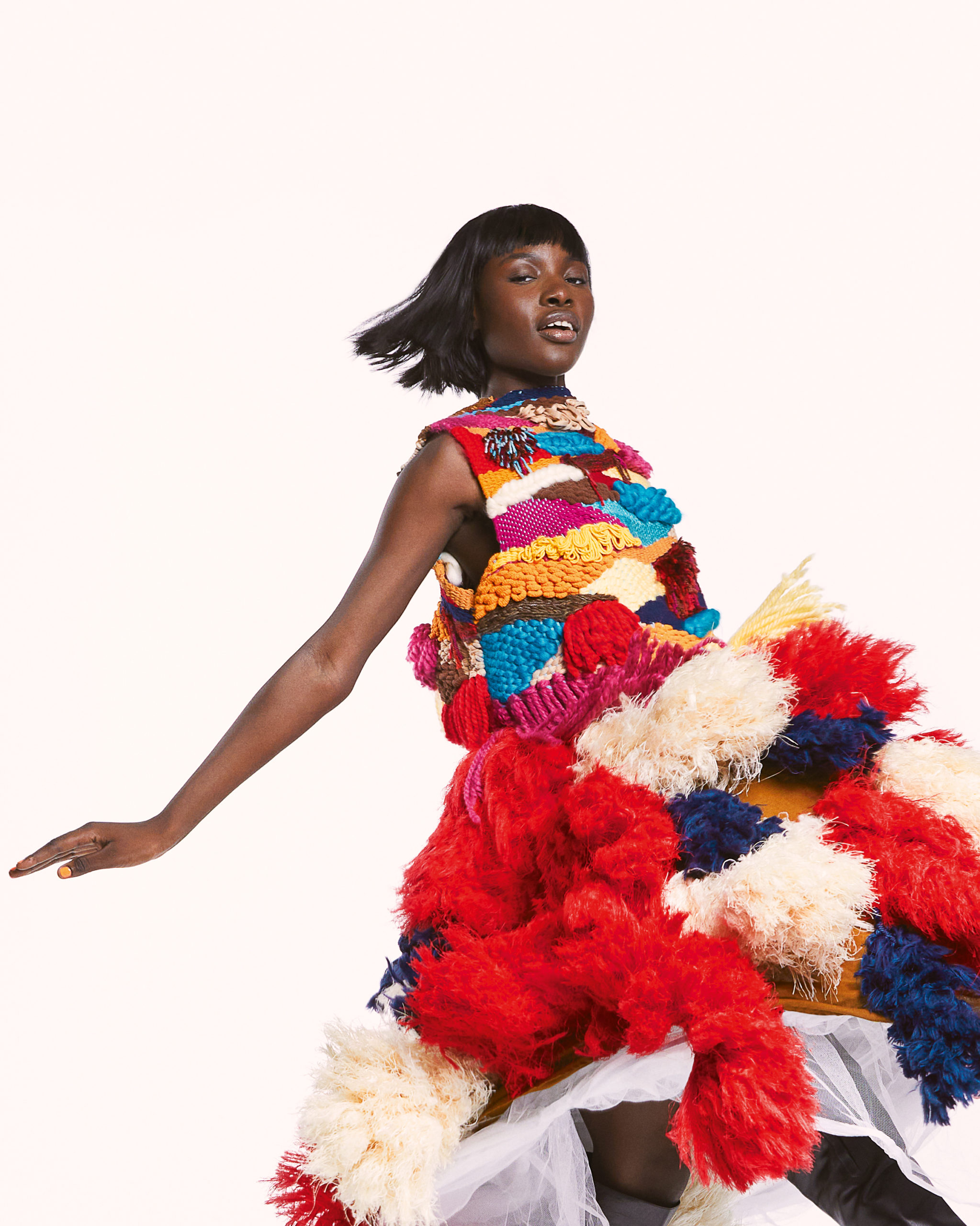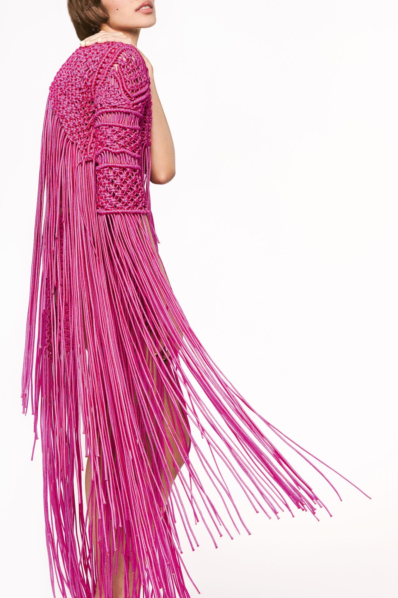 For this month’s issue, the designer created an enthralling set in a shocking pink tone. A complete ensemble of a corset, fringe top, skirt, and underwear to match, the intricate designs pay homage to the transformative power of the fringe. Layers of the knit are paired with interlocked loops covering one’s shoulders—a creative take on knitwear.