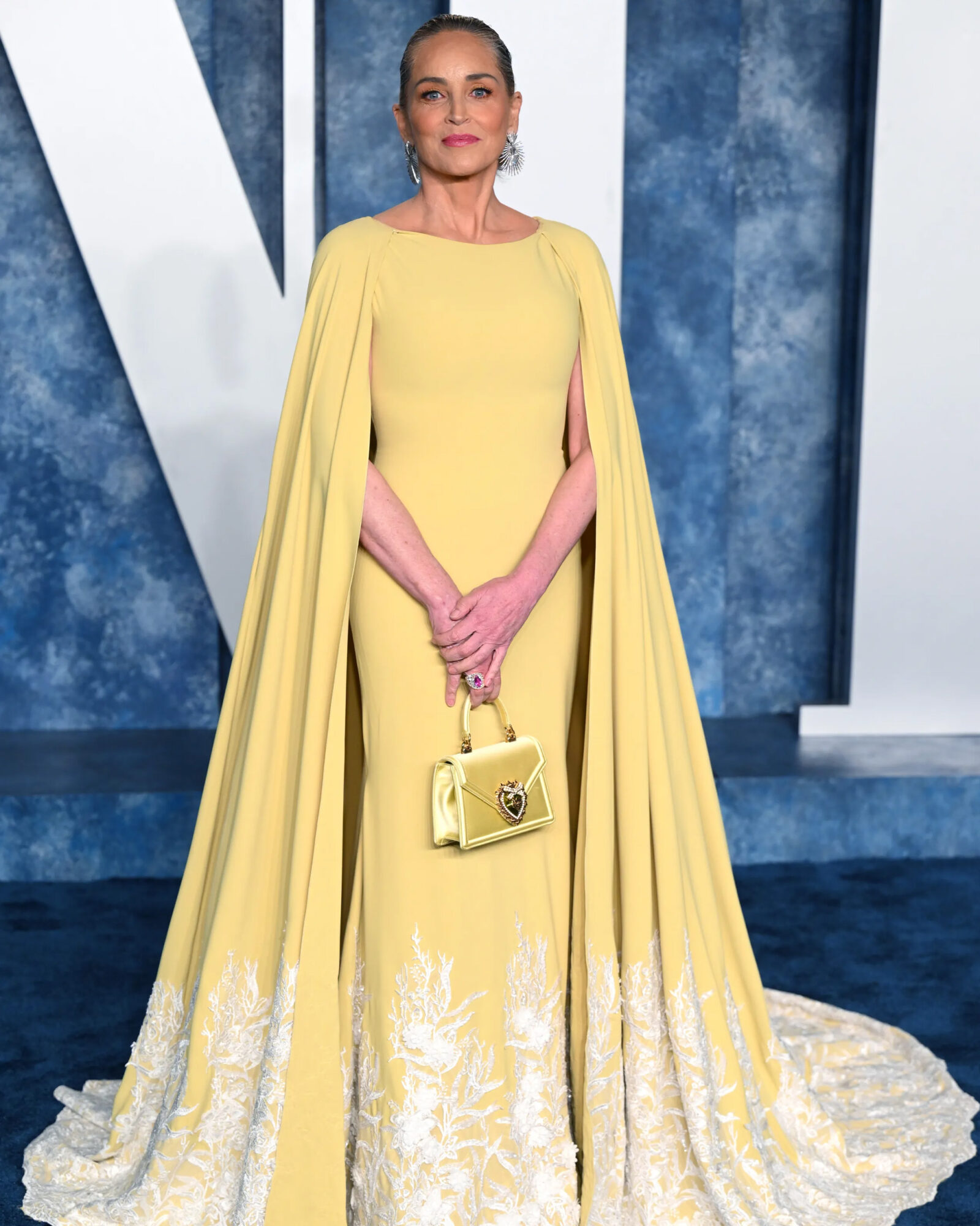 Luminous in a caped sunshine yellow Tony Ward gown and a Dolce & Gabbana handbag.