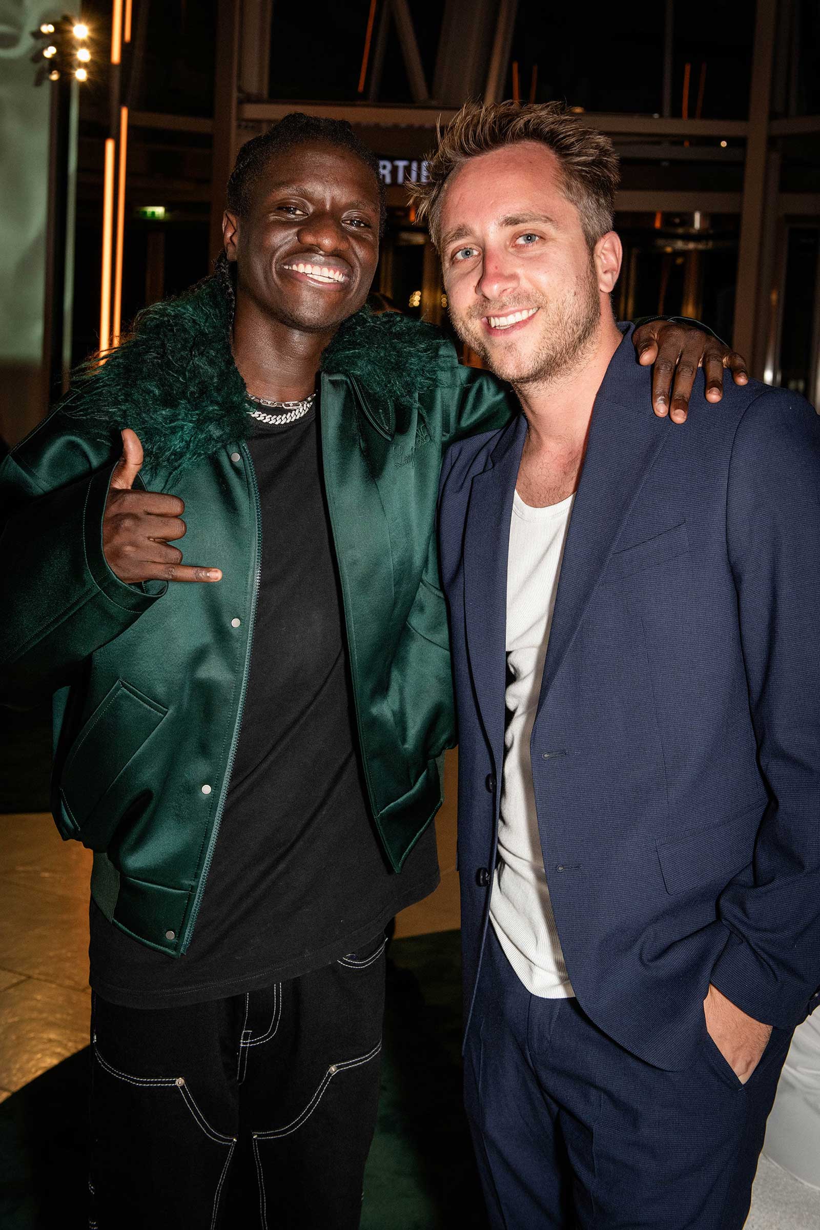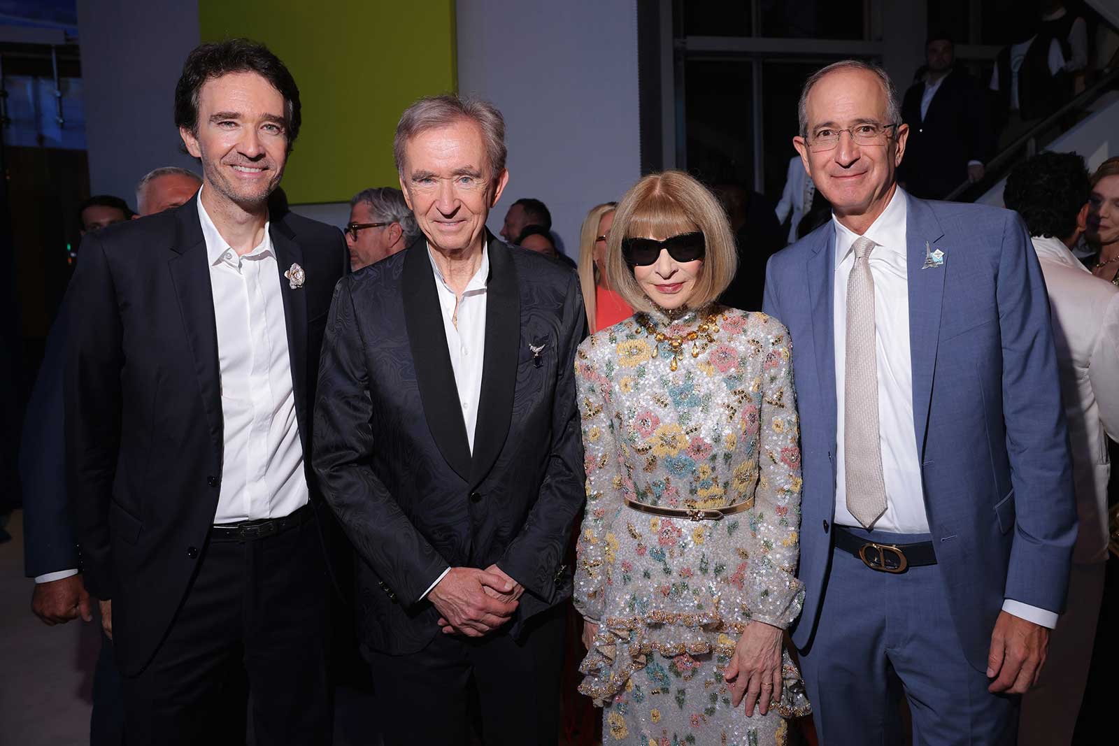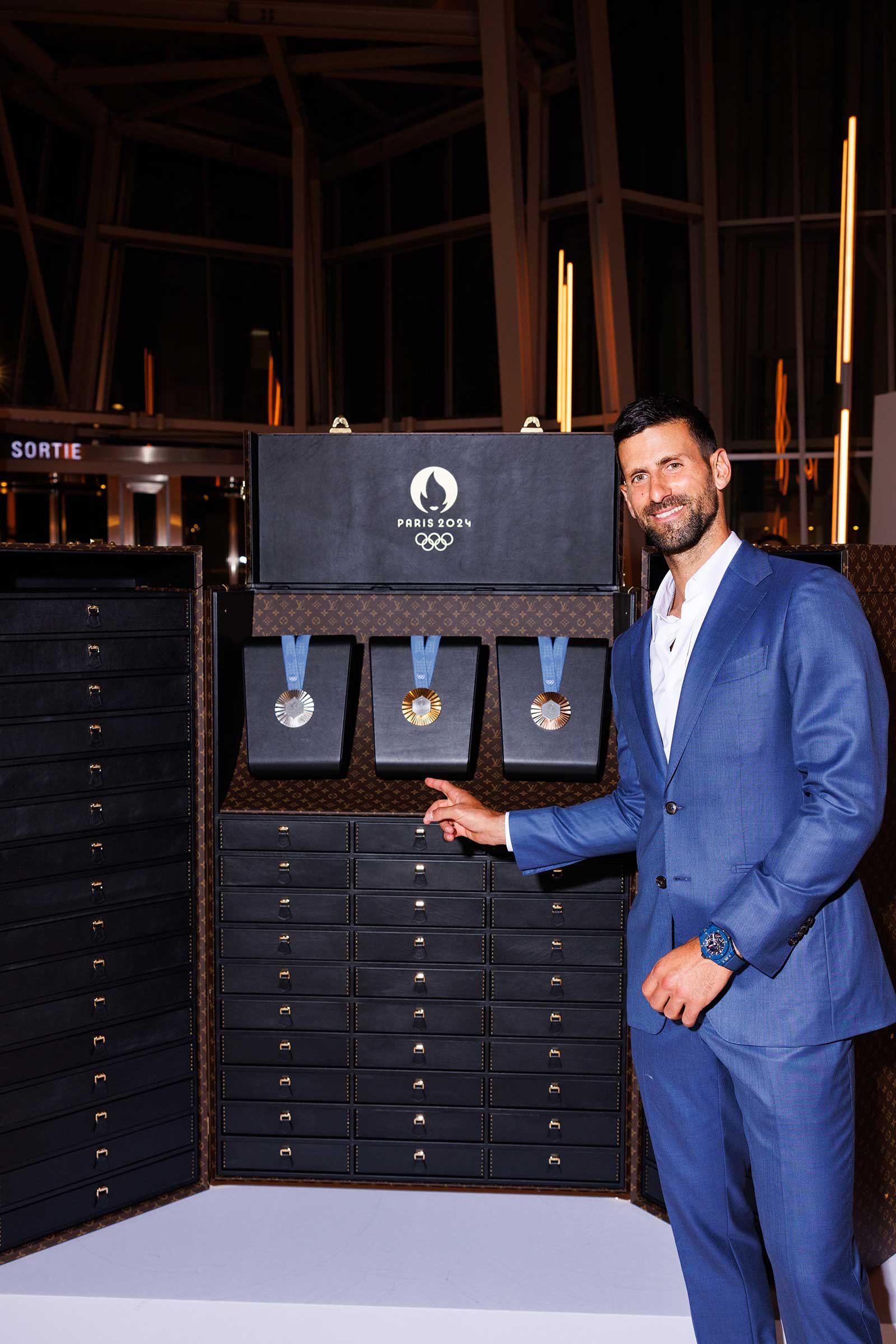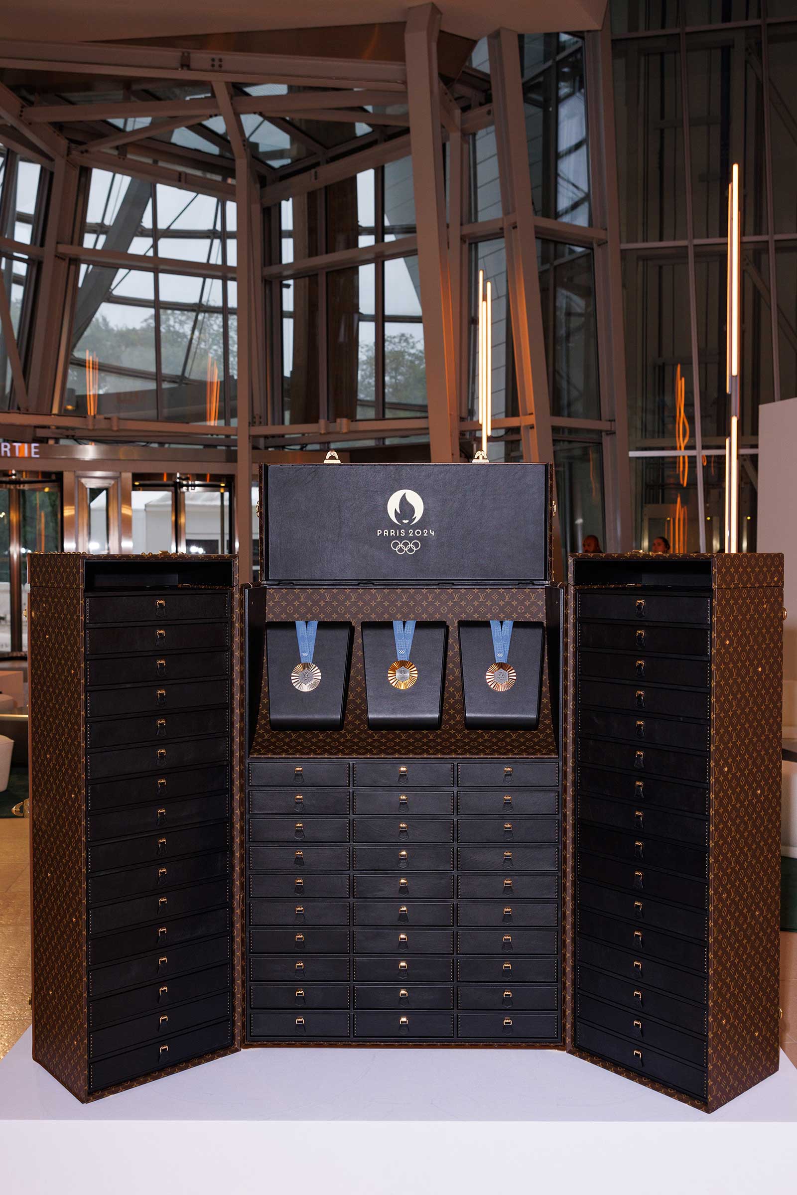 While enjoying cocktails, guests had the opportunity to see four glistening medals up close: The Olympic gold, silver, and bronze ones Louis Vuitton designed for the 2024 Games, as well as Alexandre Arnault’s New York City Marathon medal, which he wore as an accessory for the night.