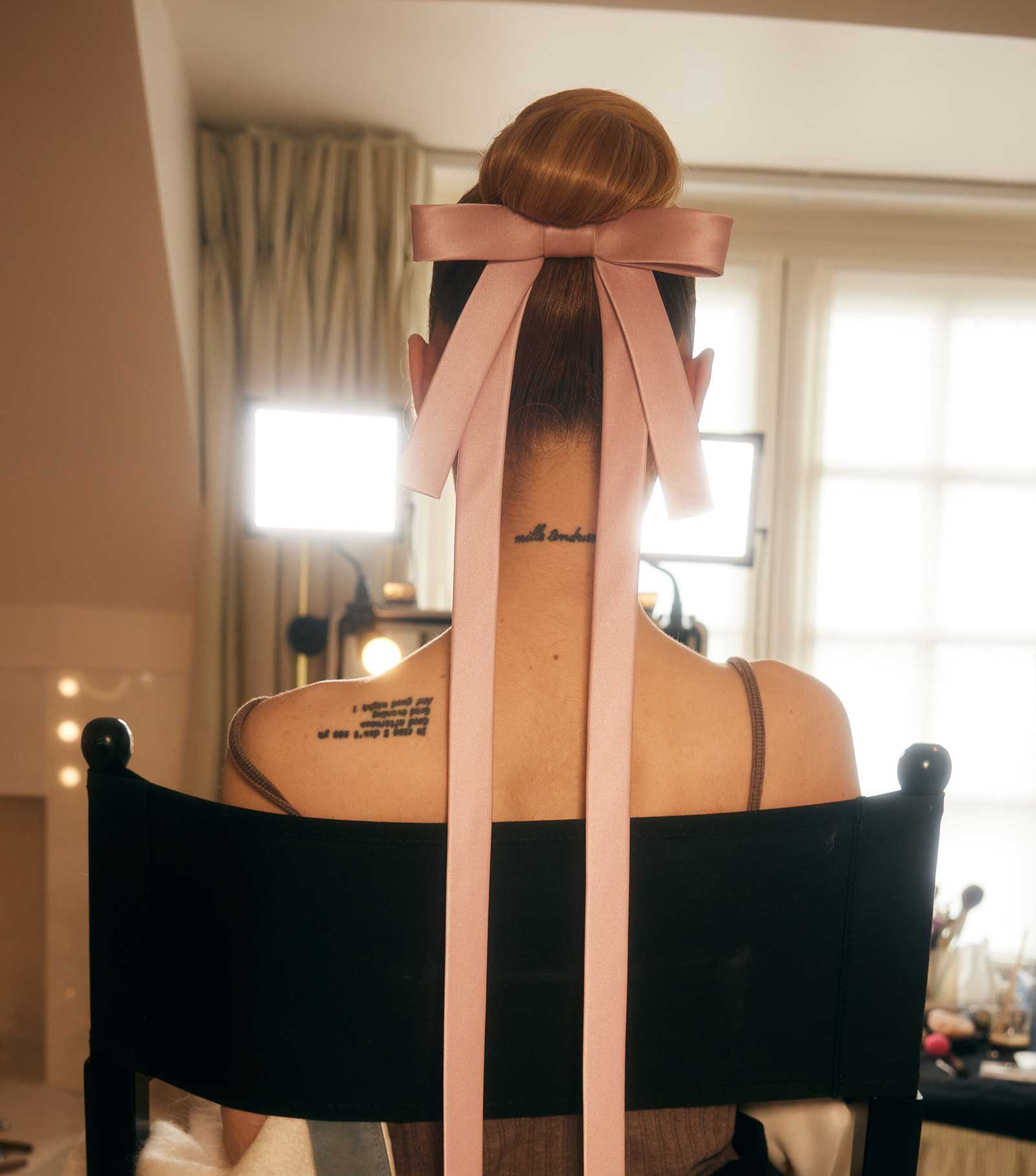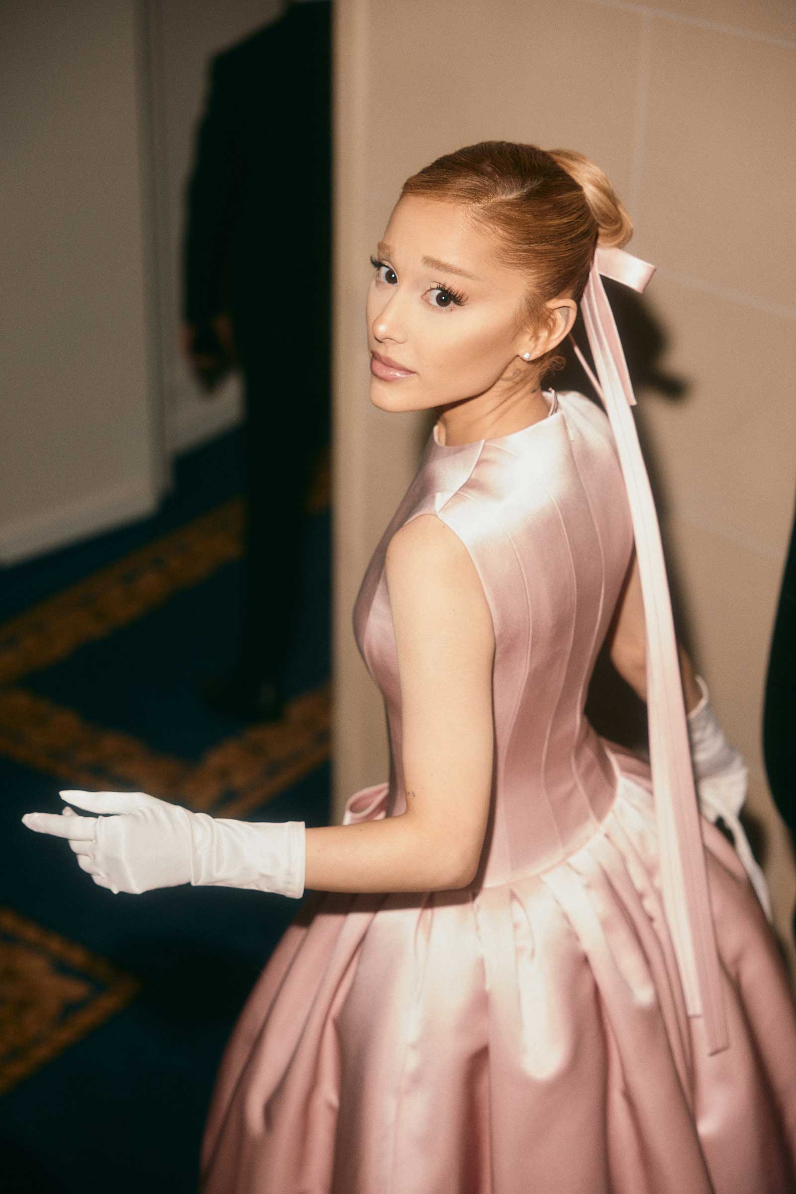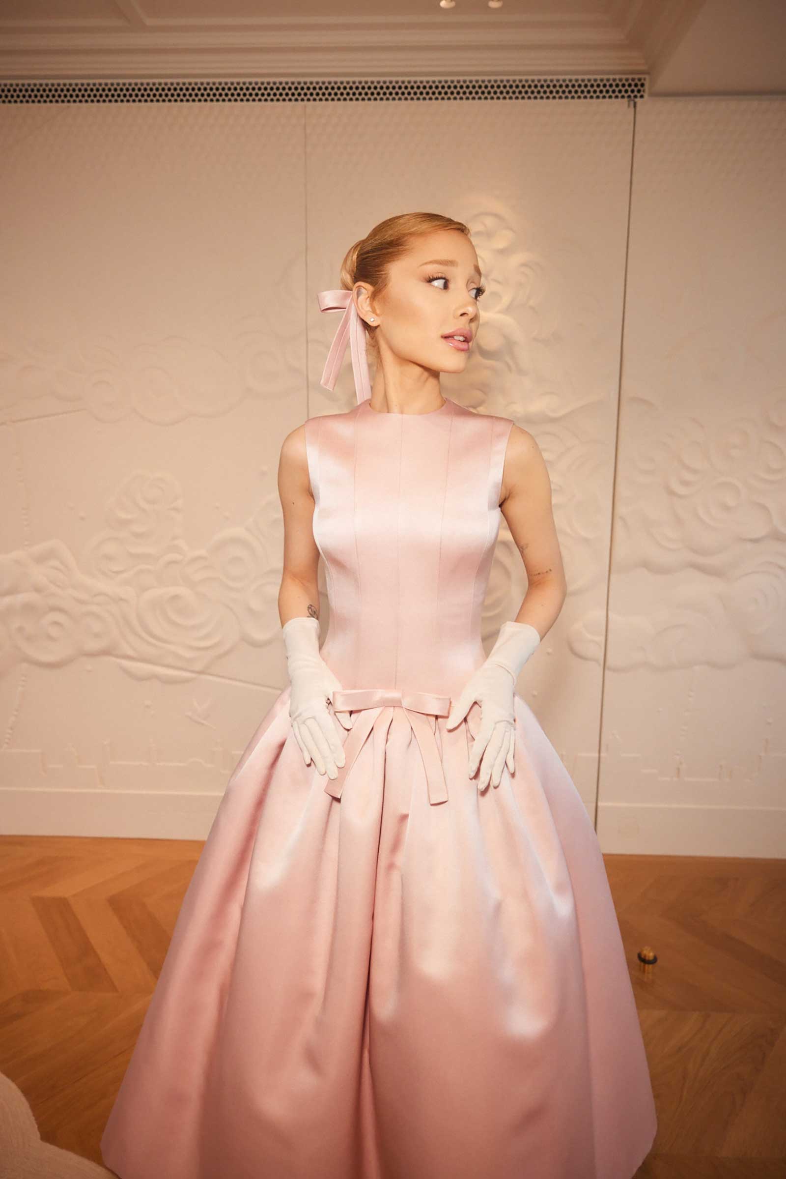 For Grande’s Glinda-inspired look, she looked to Thom Browne for a custom creation that channeled the iconic Good Witch. It resulted in a pink duchess silk-satin drop-waist dress, featuring a bow detail at the waist—complete with marching hair bows and white silk opera gloves. “For this look, it was really an ode to the history of French fashion and culture of the haute couture houses in Paris,” says Grande, who was styled by Mimi Cuttrell. “We worked closely with the Thom Browne team on this, who were such a dream to work with. Mimi and I drew inspiration from the beloved Audrey Hepburn and classic 1950s silhouettes to emulate an everlasting look.”