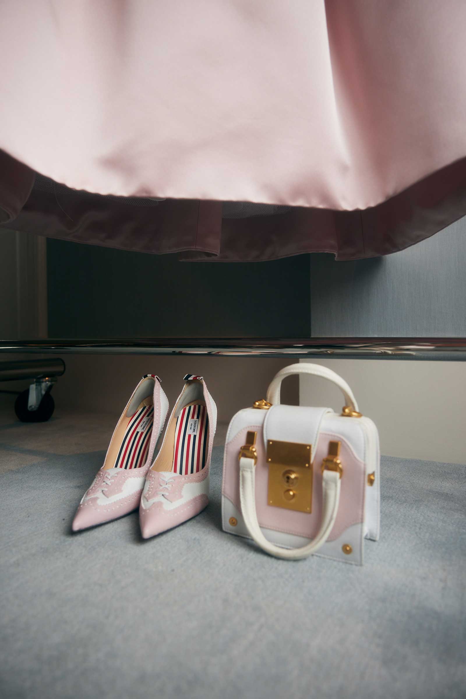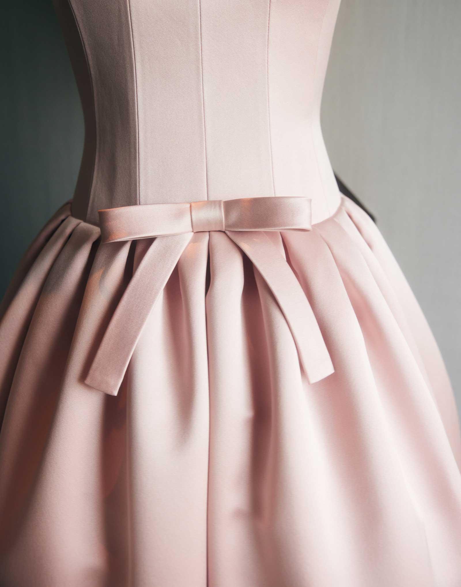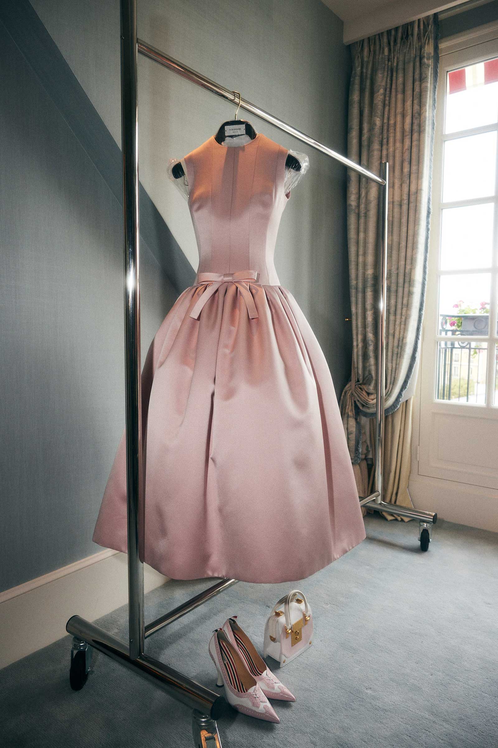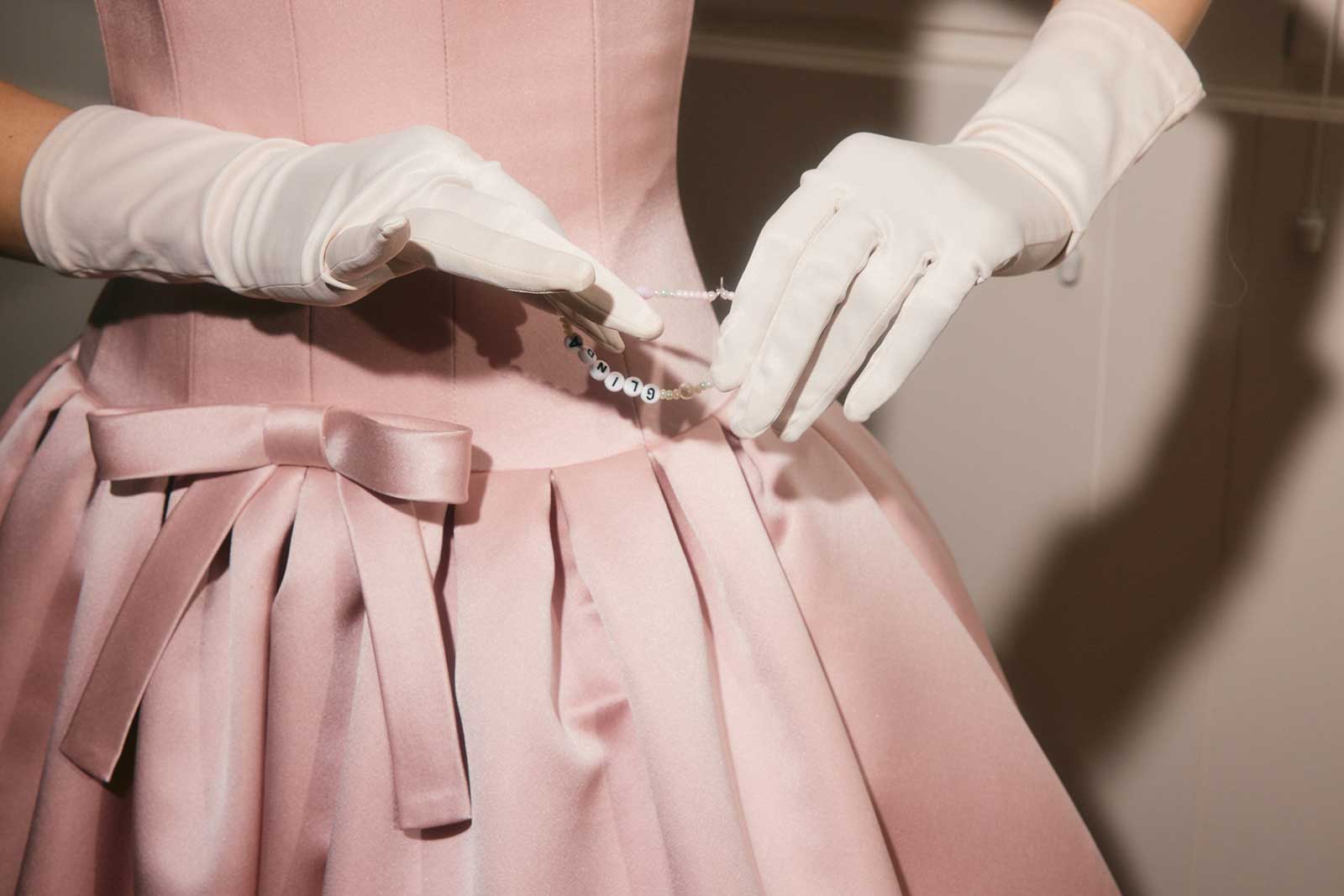 Her favorite details from the finished design? “Don’t make me choose! Every detail is so important and integral to the look,” she says. “The beautiful pink duchess satin fabric, the drop waist, the bow details, the shoes, and I also really loved my hair and makeup with it. The vision came together so beautifully, and I am so lucky to work with my incredible glam team.”