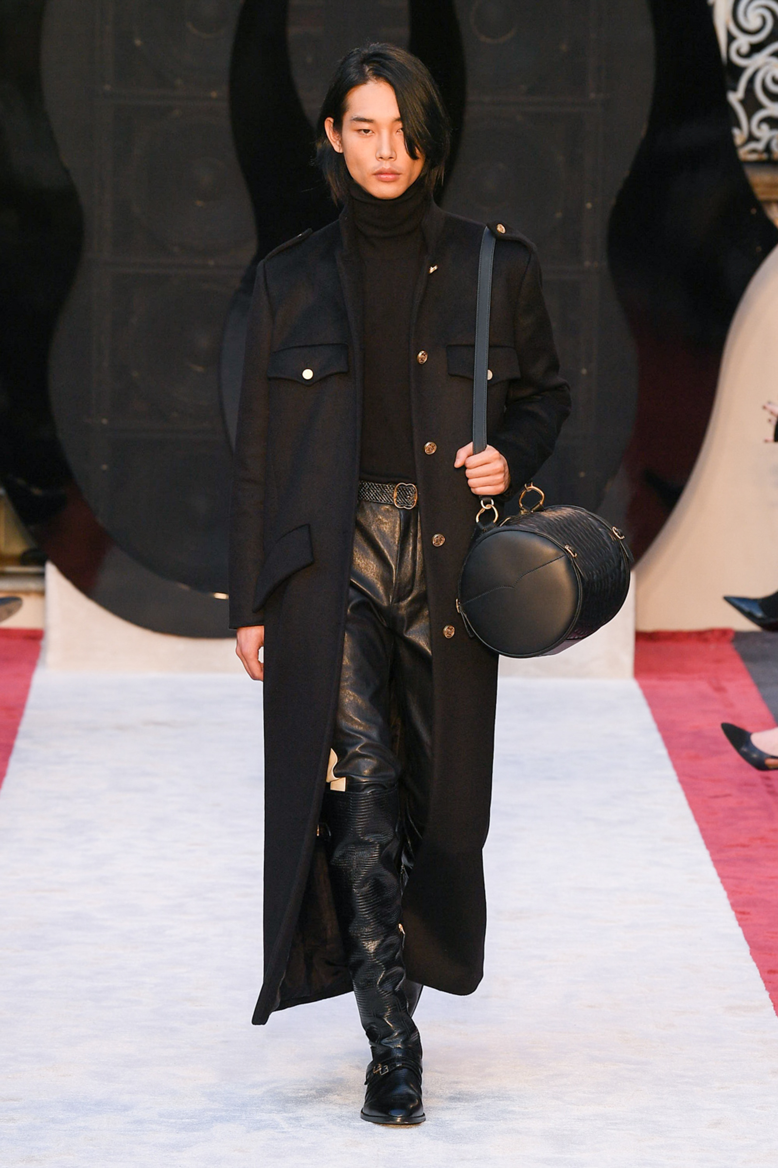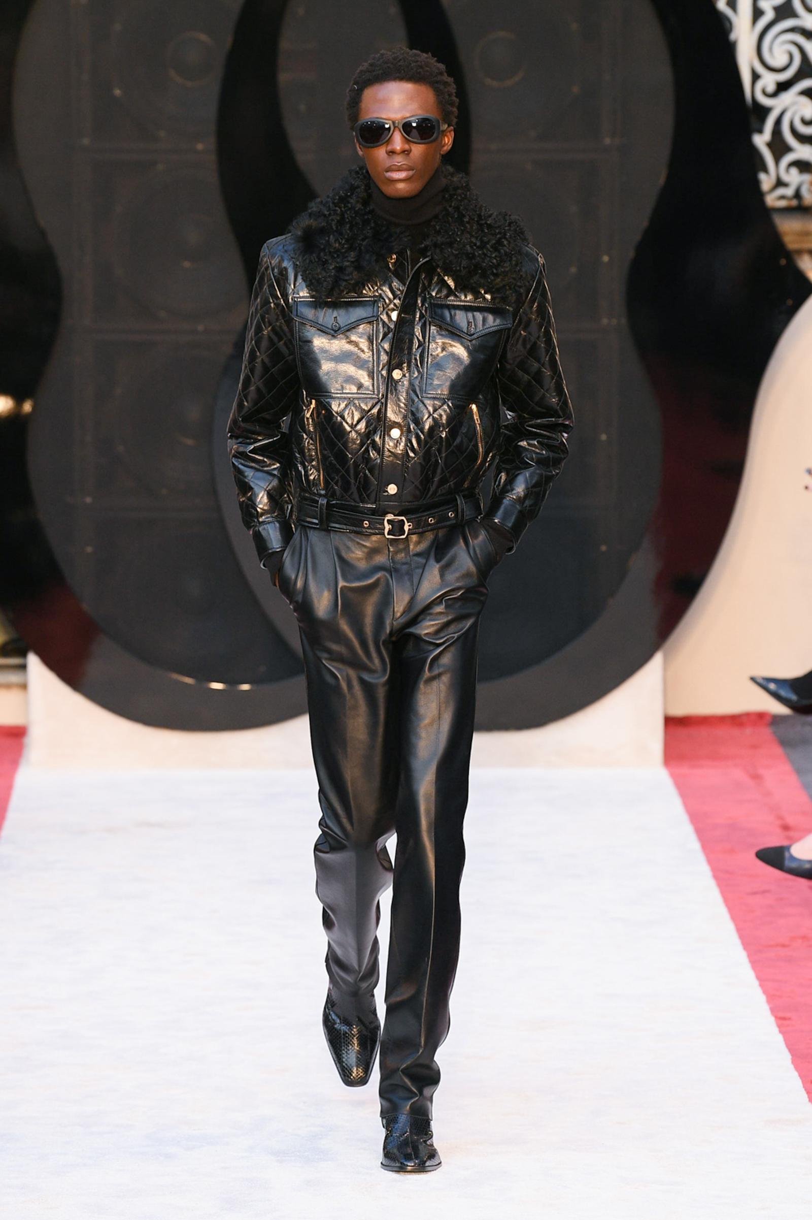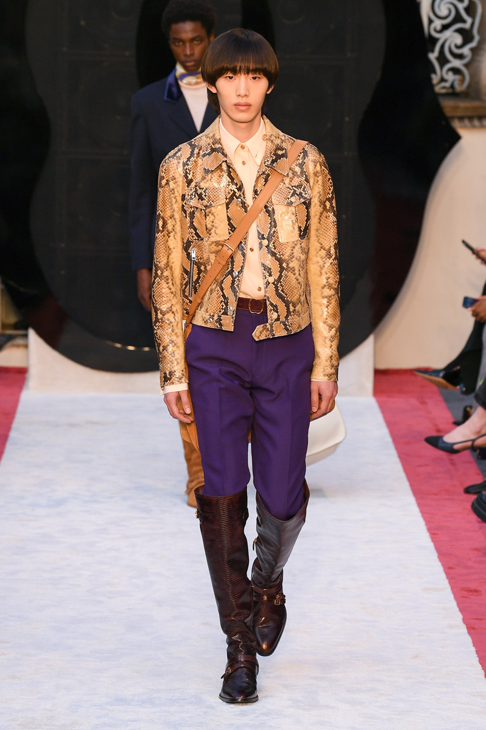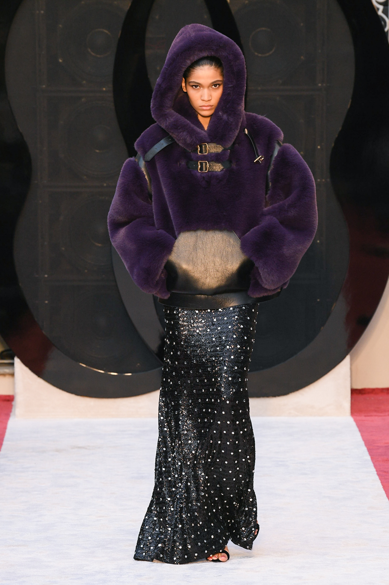 Cheetah print horse hair slippers, leather down jackets shivering with velvet bows, a great oversized leather quilted parka with water snake paneling, animal print 2.5-inch heeled Chelsea boots, and a purple shearling hoodie worn above a black beaded crystal-studded skirt were among Villaseñor’s other opulent offerings. The closing dress hung from the model’s right shoulder and a strap passed along her left: from behind the house name was advertised south east across her shoulder blade in proud gold lettering. Villaseñor said that some in his team had advised him to disrupt—aka “fuck up”—his retro urge with shots of modernity (sneakers and so forth) but he had declined. “Because the most fucked up thing is where I walk out after and I’m not a guy who comes from here or this,” he said. “There’s no silver spoon.”