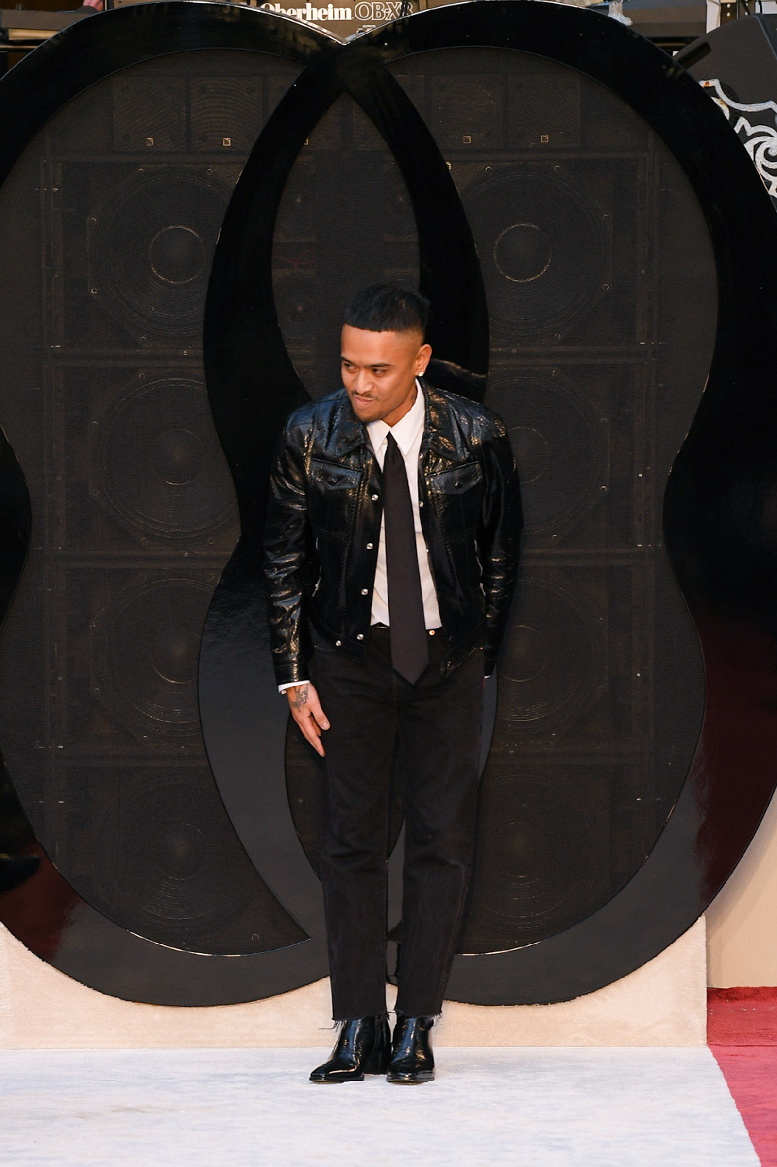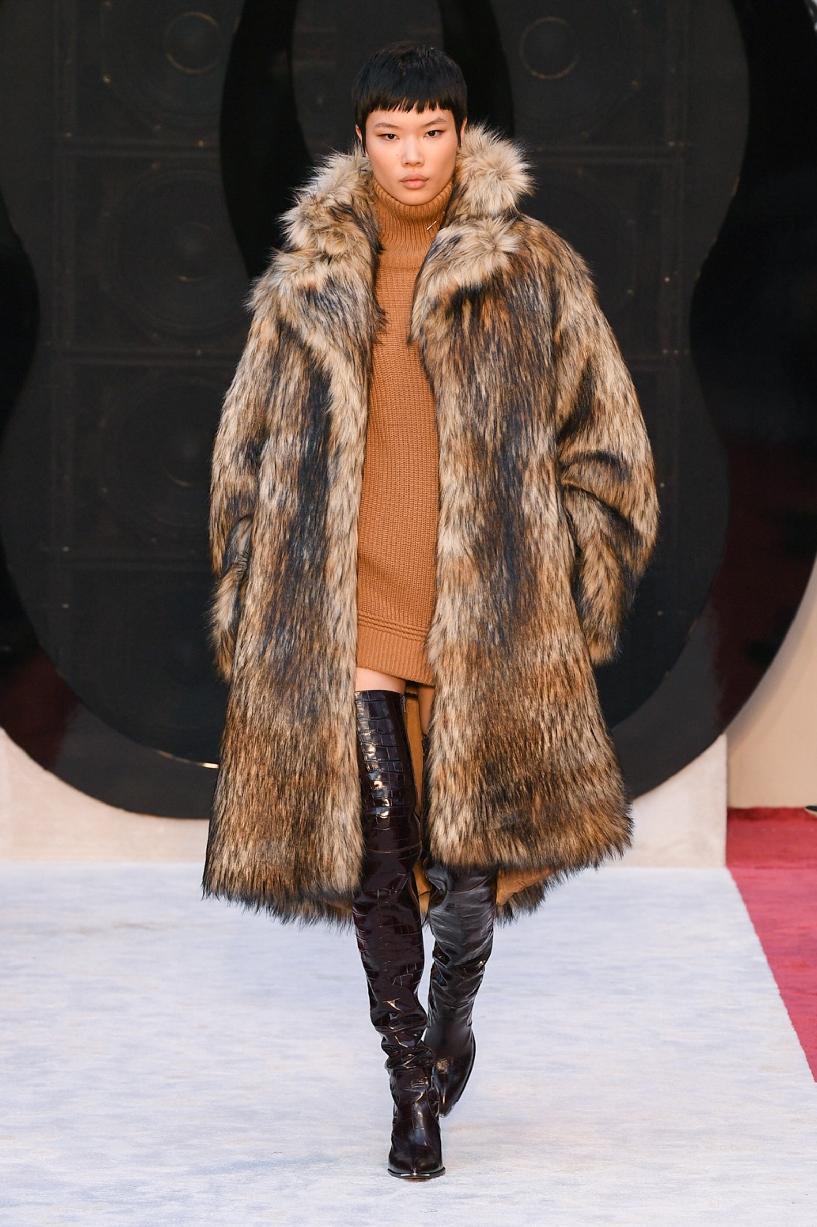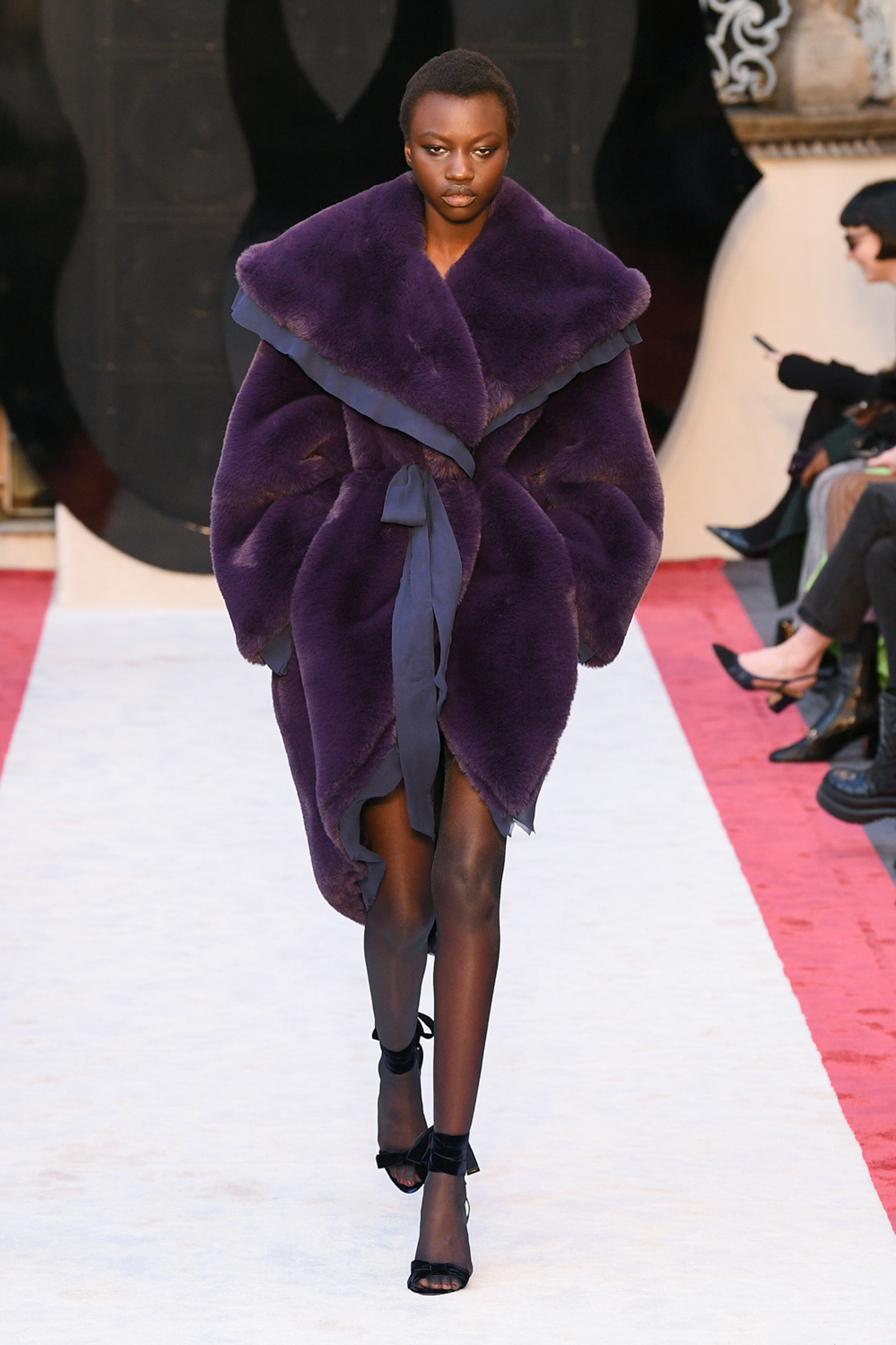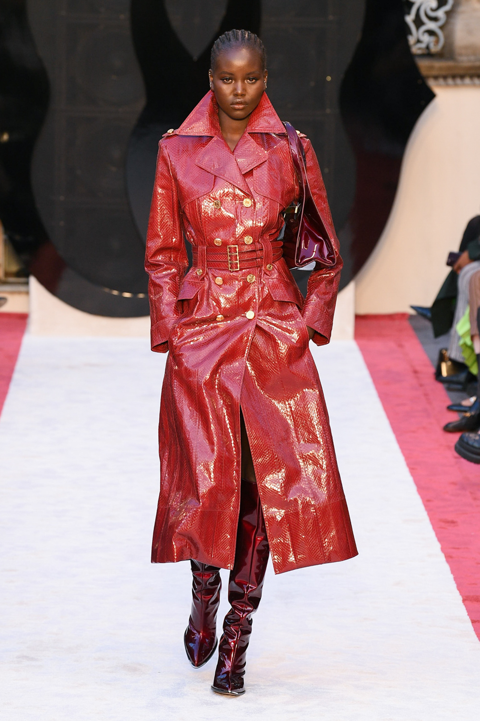 Cheetah print horse hair slippers, leather down jackets shivering with velvet bows, a great oversized leather quilted parka with water snake paneling, animal print 2.5-inch heeled Chelsea boots, and a purple shearling hoodie worn above a black beaded crystal-studded skirt were among Villaseñor’s other opulent offerings. The closing dress hung from the model’s right shoulder and a strap passed along her left: from behind the house name was advertised south east across her shoulder blade in proud gold lettering. Villaseñor said that some in his team had advised him to disrupt—aka “fuck up”—his retro urge with shots of modernity (sneakers and so forth) but he had declined. “Because the most fucked up thing is where I walk out after and I’m not a guy who comes from here or this,” he said. “There’s no silver spoon.”