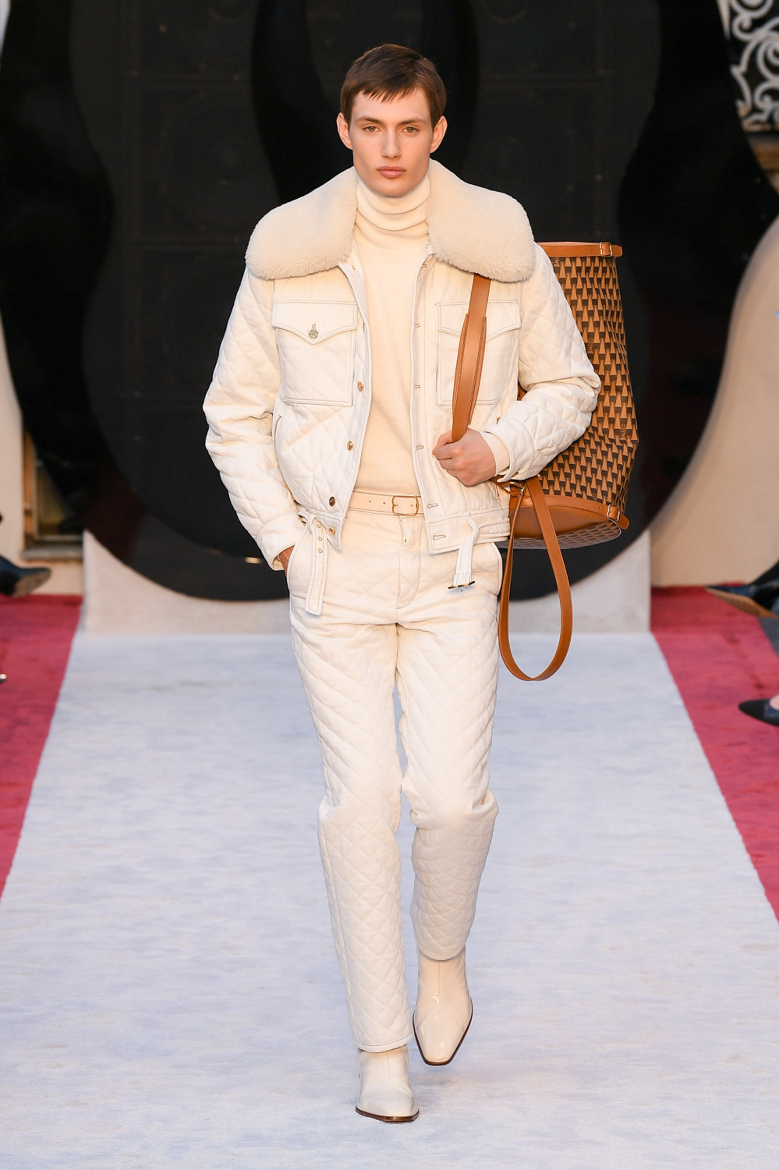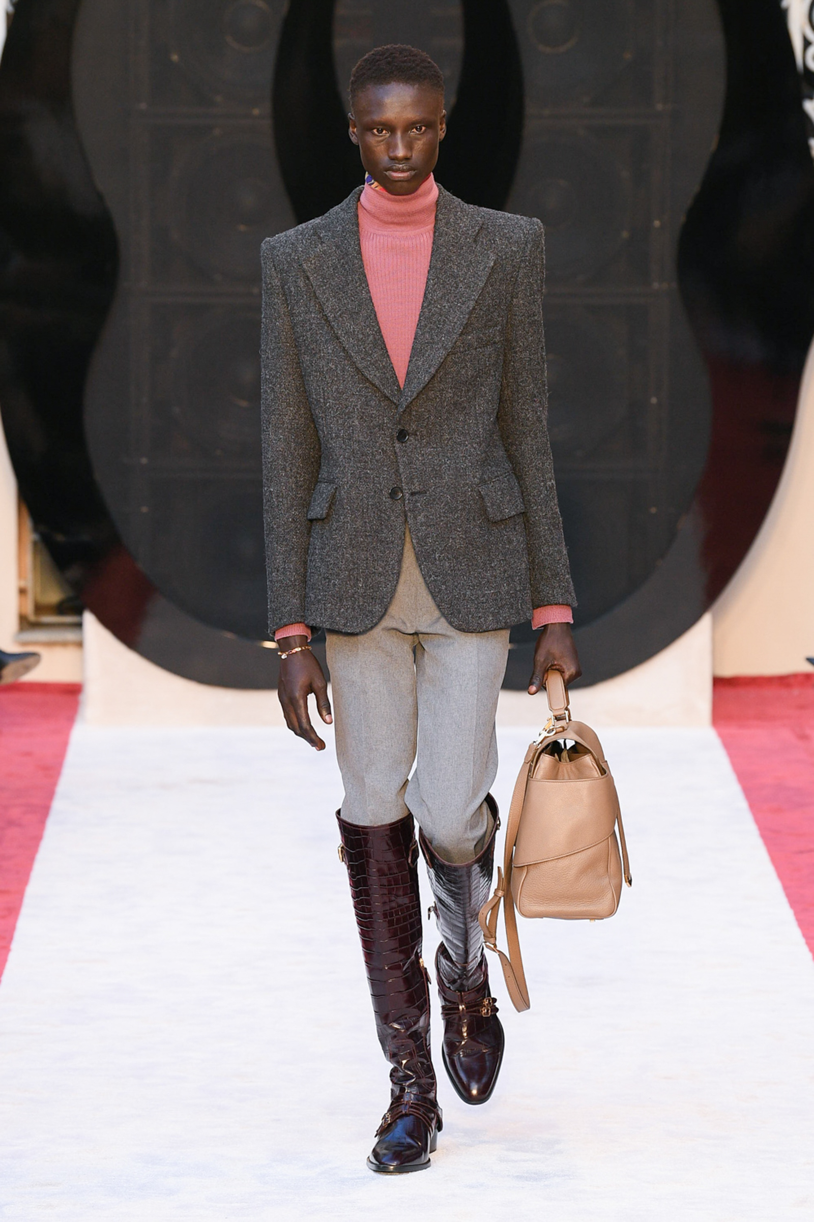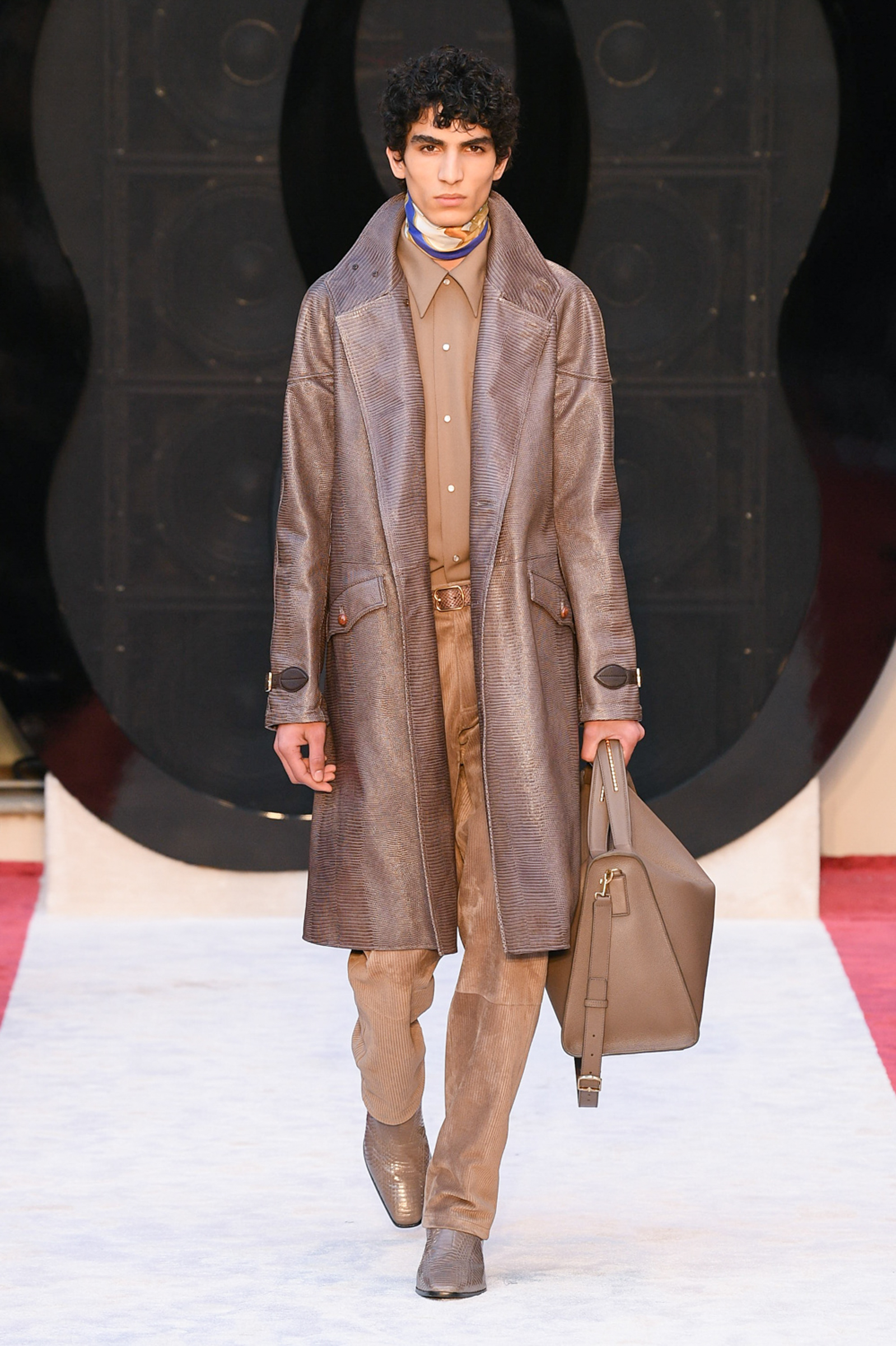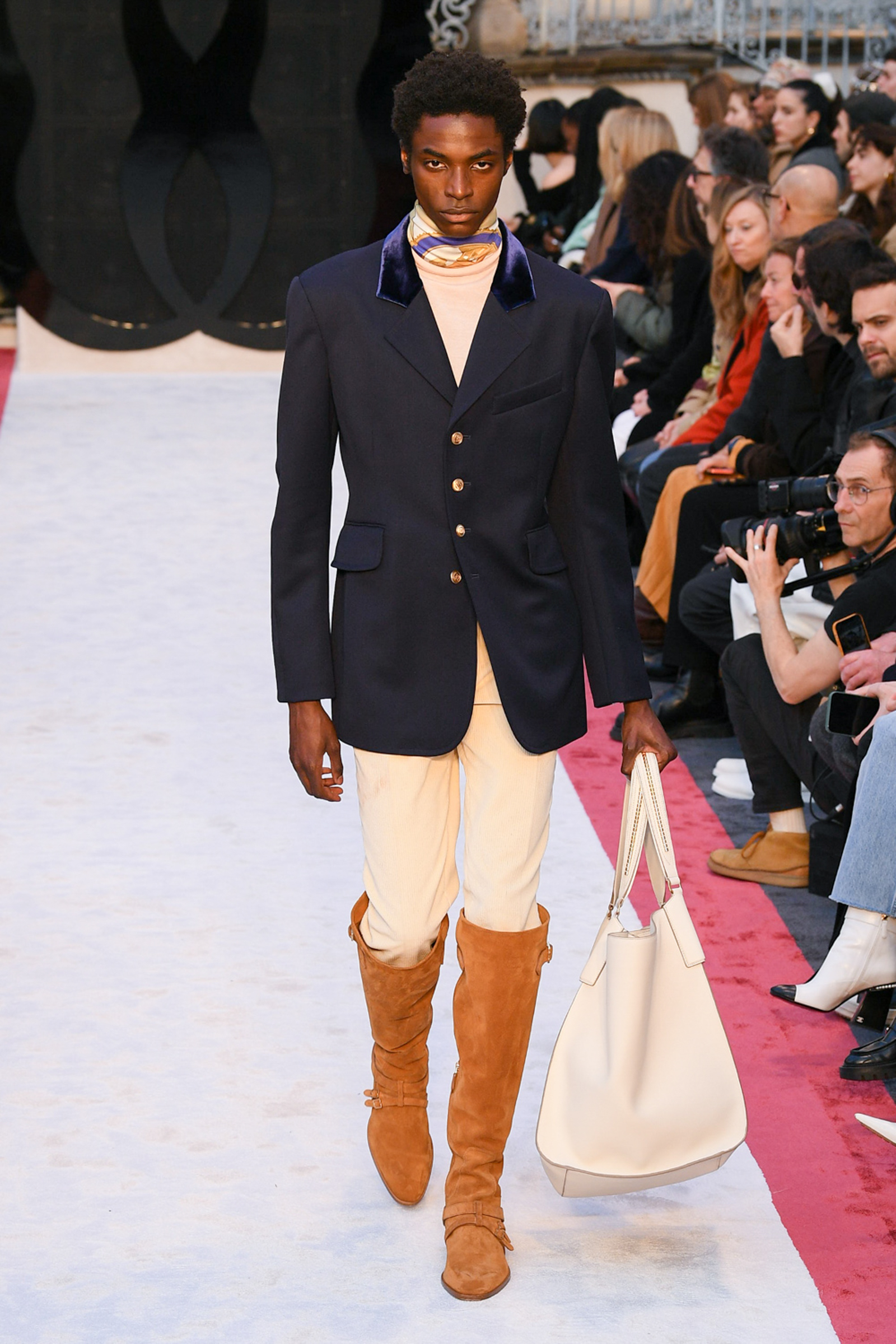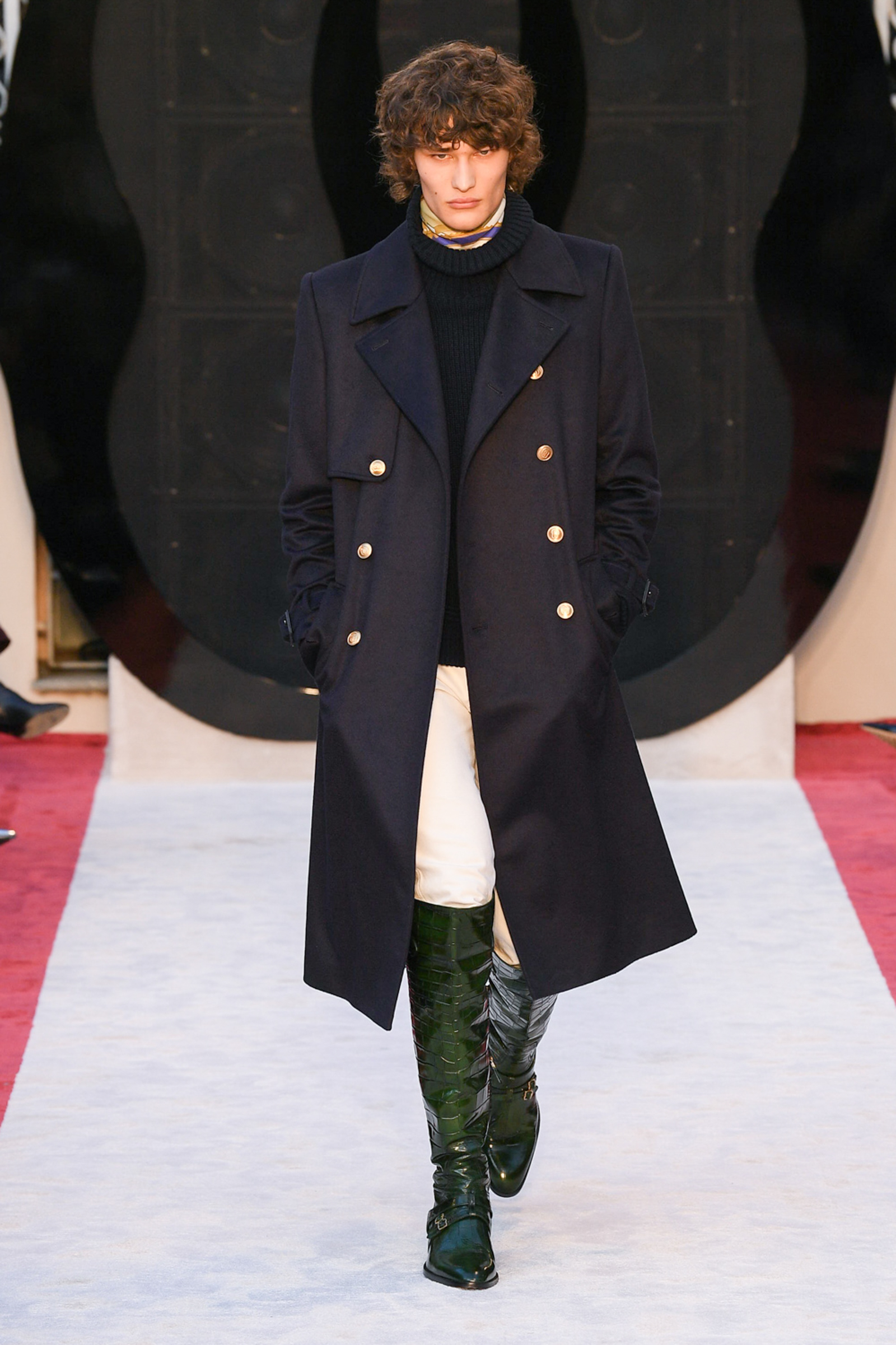 “It’s about slow travel,” said Villaseñor of his 20th century wardrobe shaped by a 21st century mindset. Non-literal references included Tommy Nutter shapes in the suiting, equestrian exclusivity in the boots, mercurial Miles Davis at Montreux in the archive-quilt black leather looks, Yves Saint Laurent in the hooded dresses, and all the foulard competitors in the straight-cut silk pants (for men) and handbags dressed in scarfs. Said Villaseñor: “When I was in my little corner of California reading Town & Country, trying to imagine myself eating truffles, this is what it looked like. It’s really opulent.”