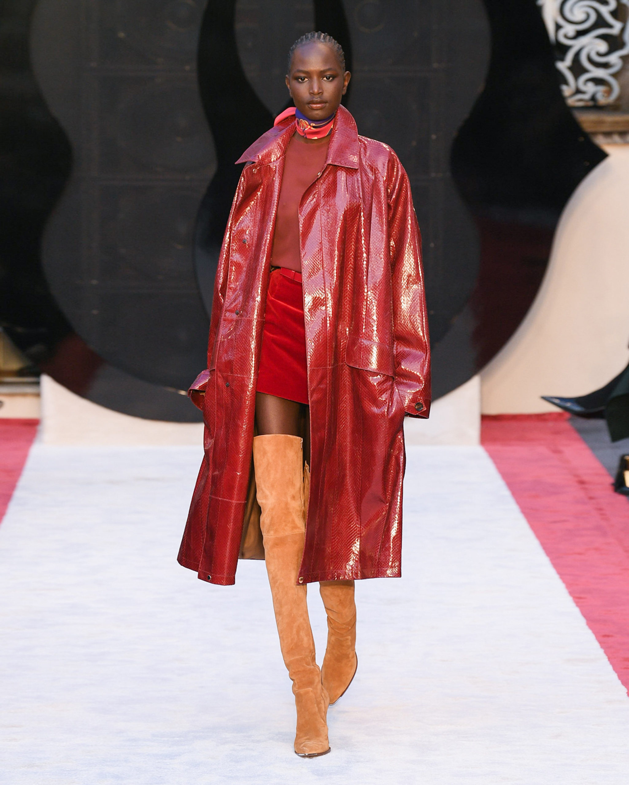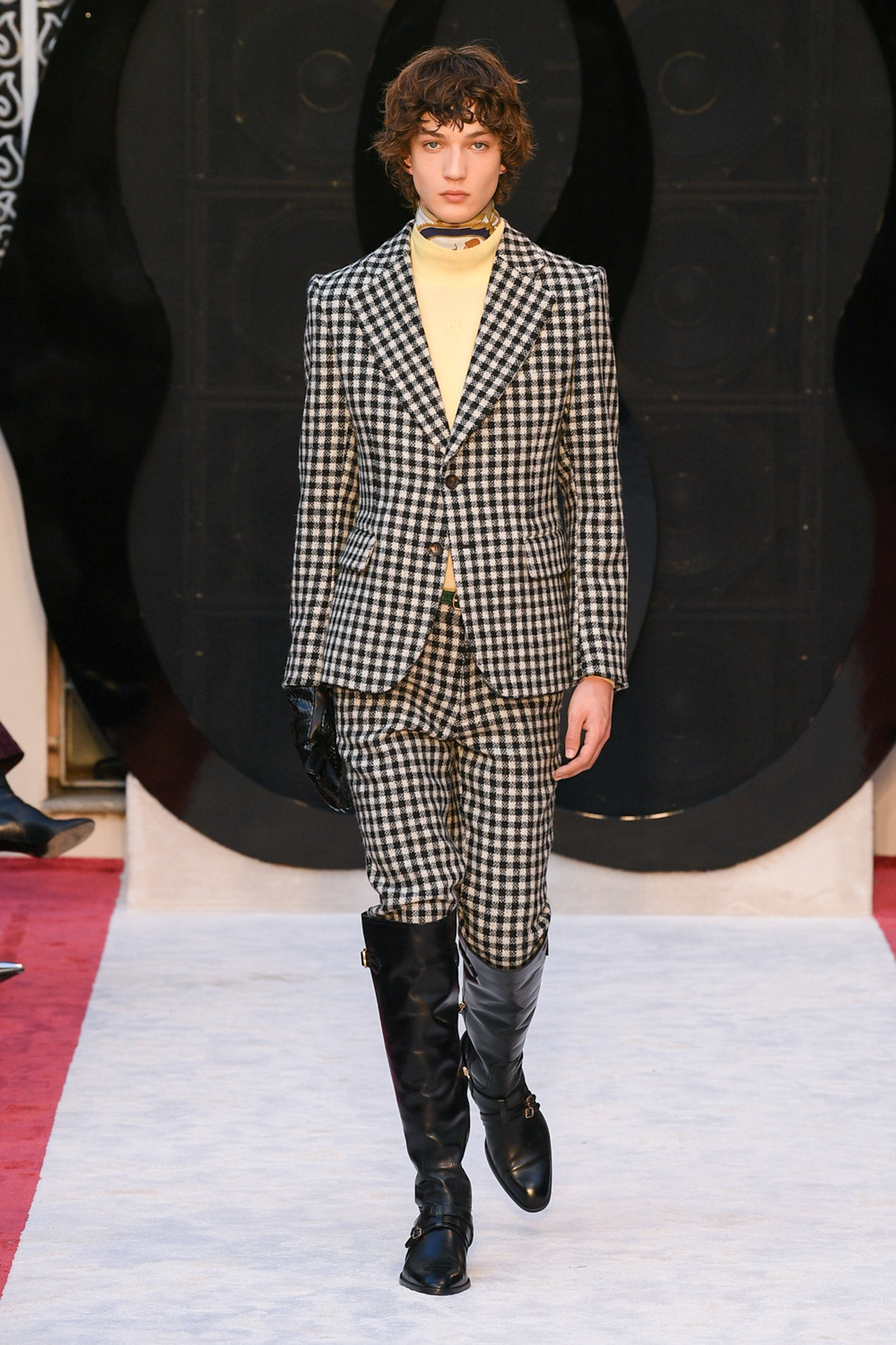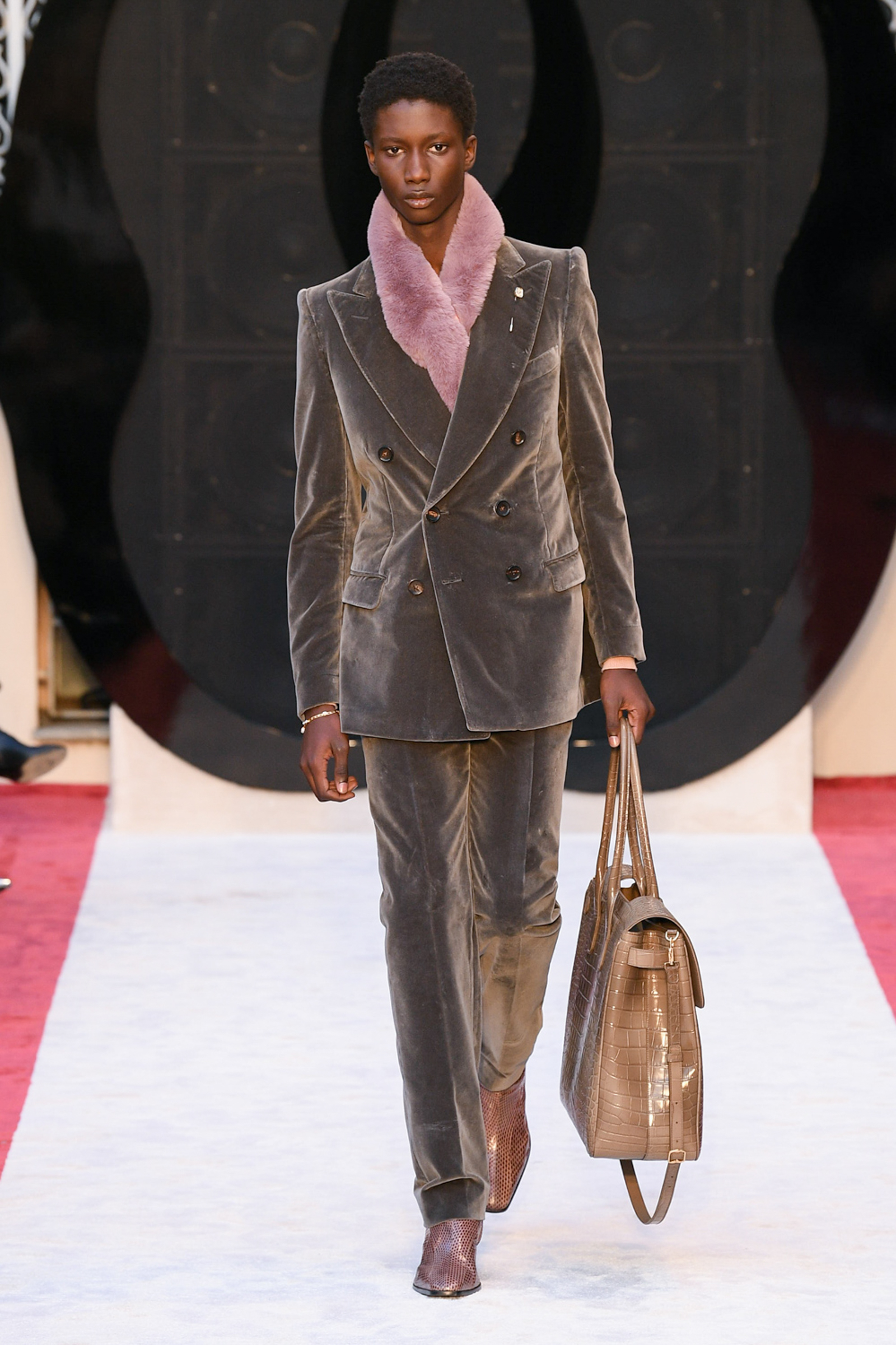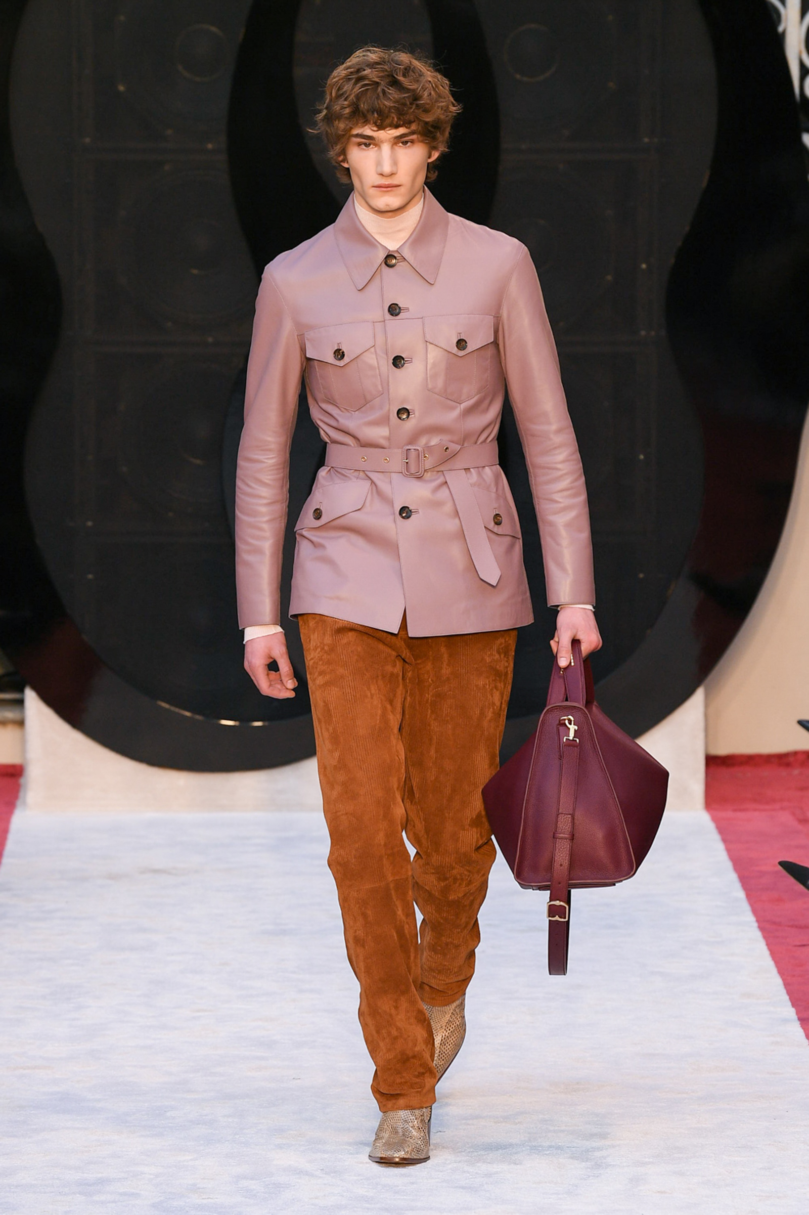 “It’s about slow travel,” said Villaseñor of his 20th century wardrobe shaped by a 21st century mindset. Non-literal references included Tommy Nutter shapes in the suiting, equestrian exclusivity in the boots, mercurial Miles Davis at Montreux in the archive-quilt black leather looks, Yves Saint Laurent in the hooded dresses, and all the foulard competitors in the straight-cut silk pants (for men) and handbags dressed in scarfs. Said Villaseñor: “When I was in my little corner of California reading Town & Country, trying to imagine myself eating truffles, this is what it looked like. It’s really opulent.”