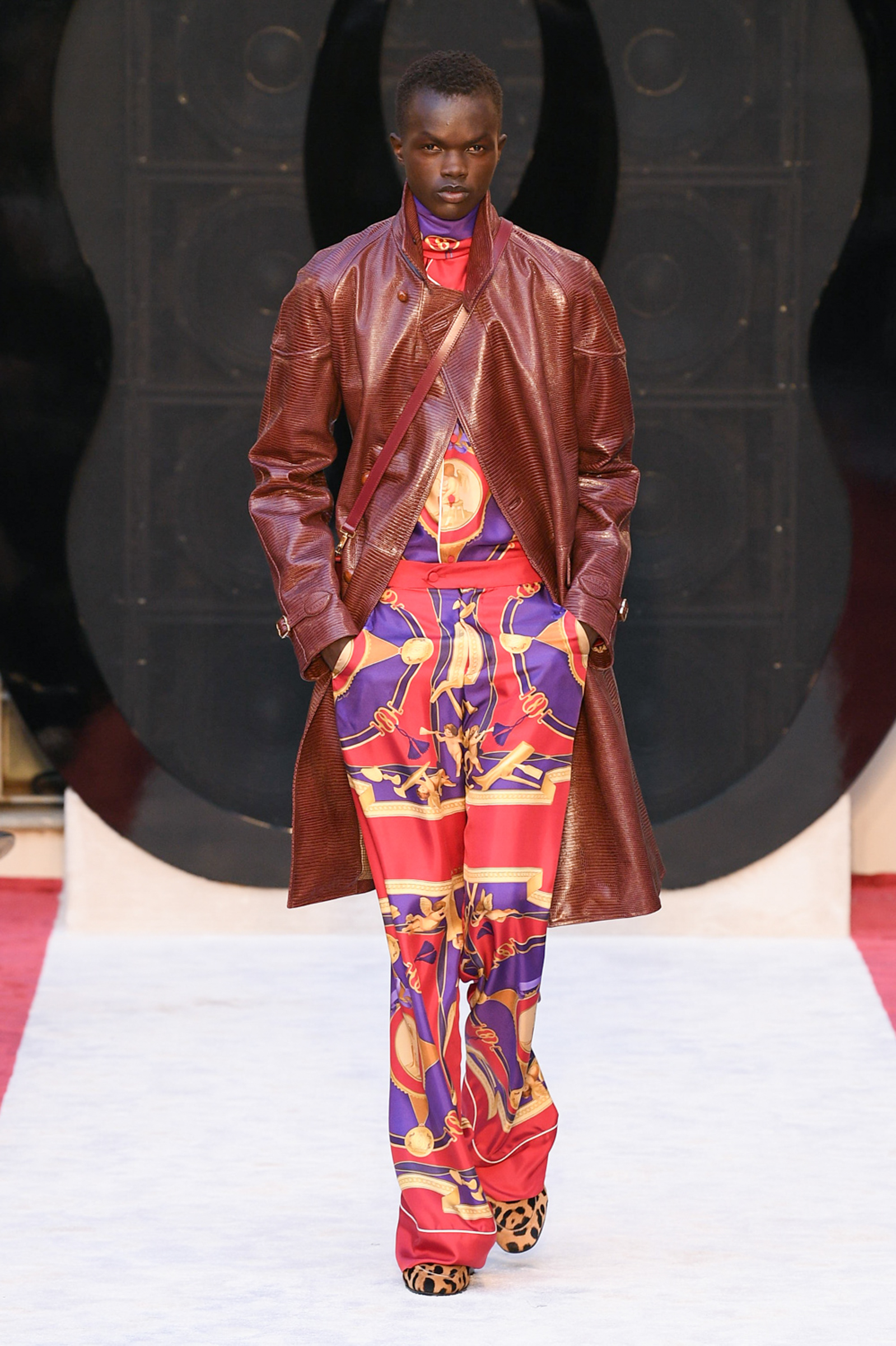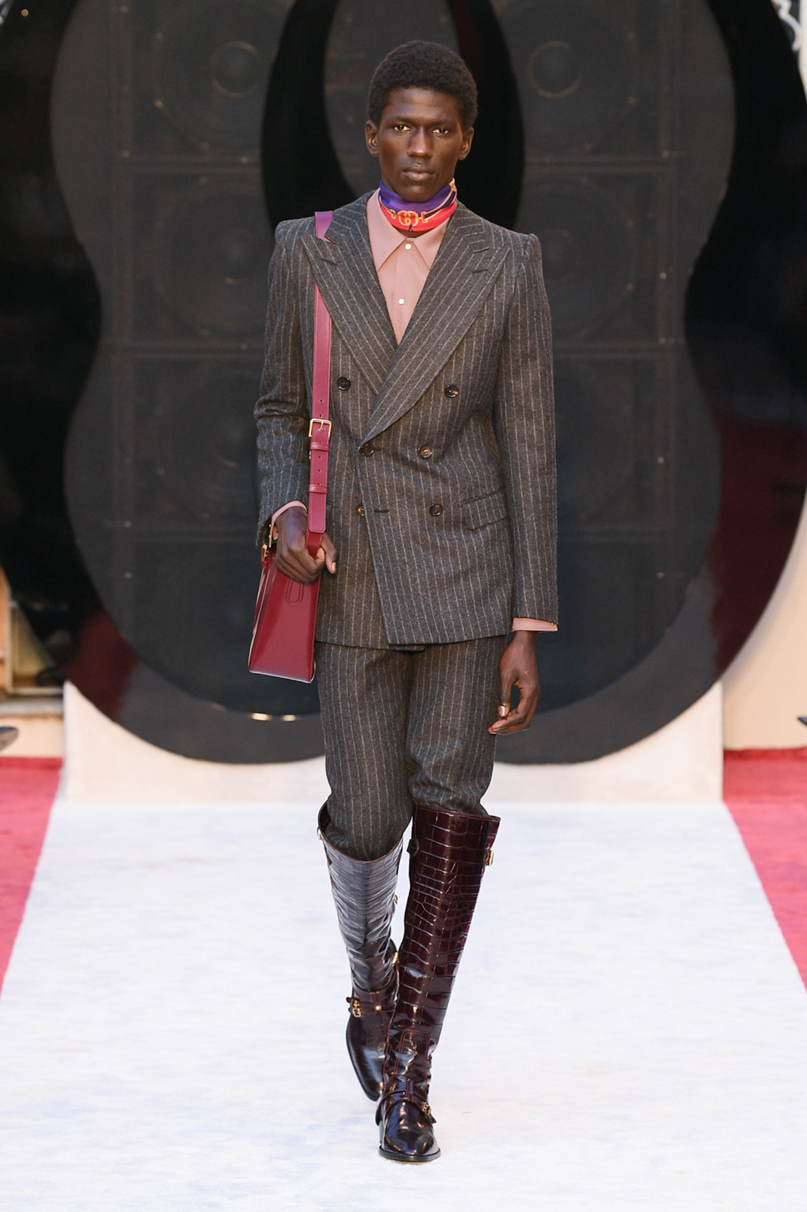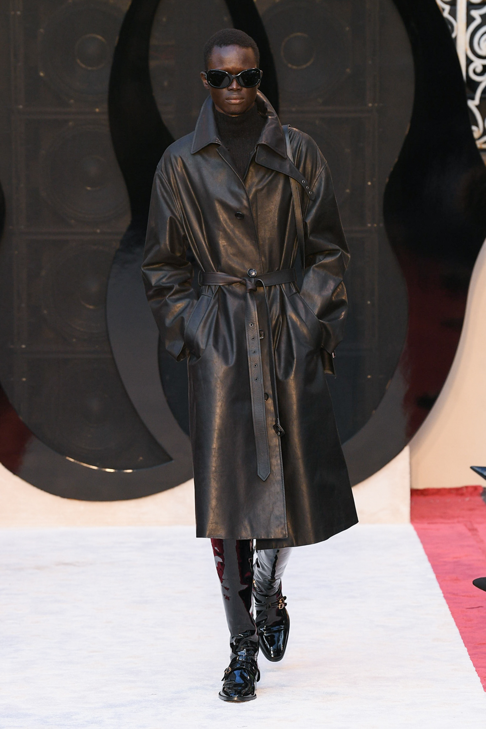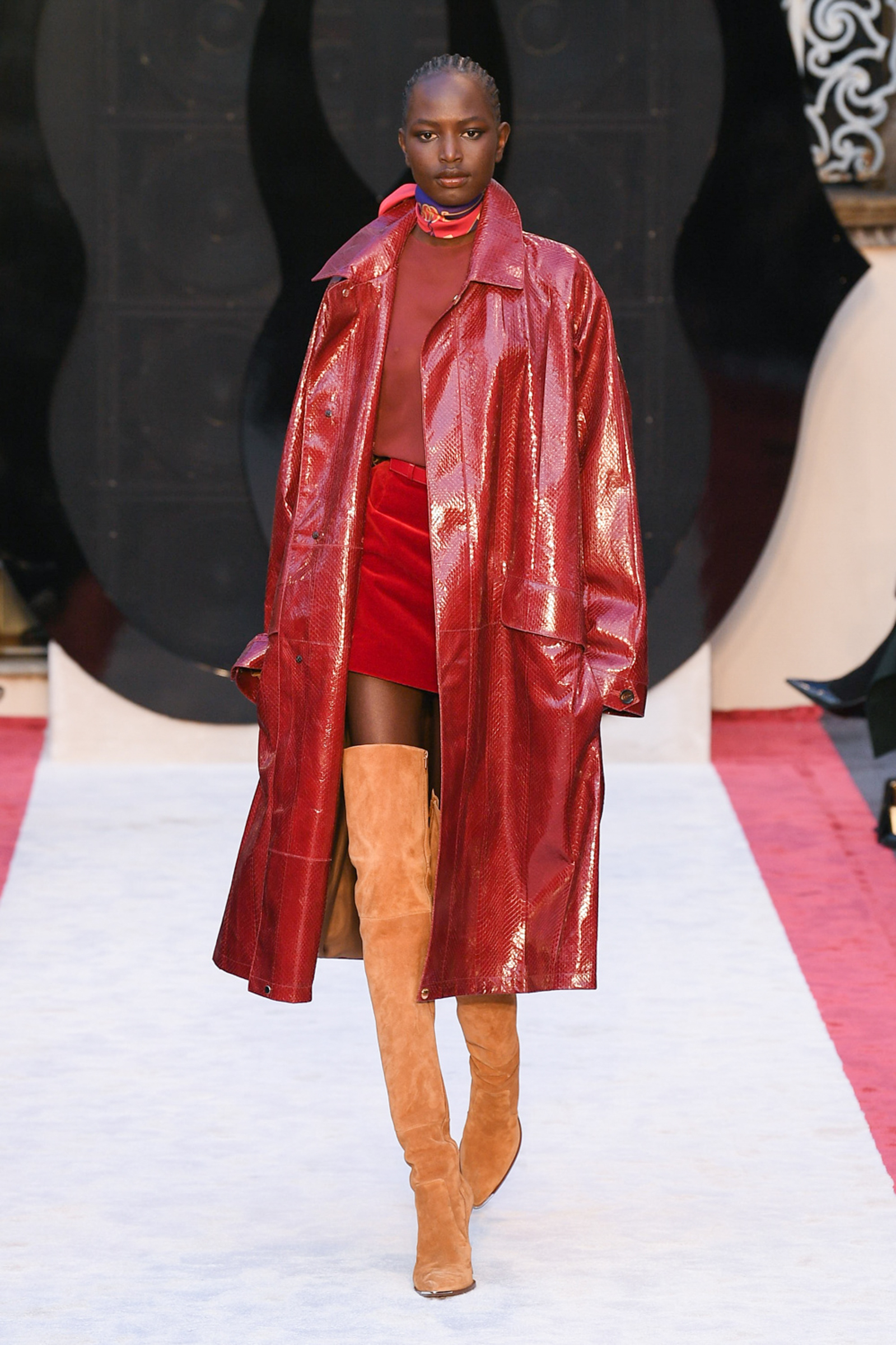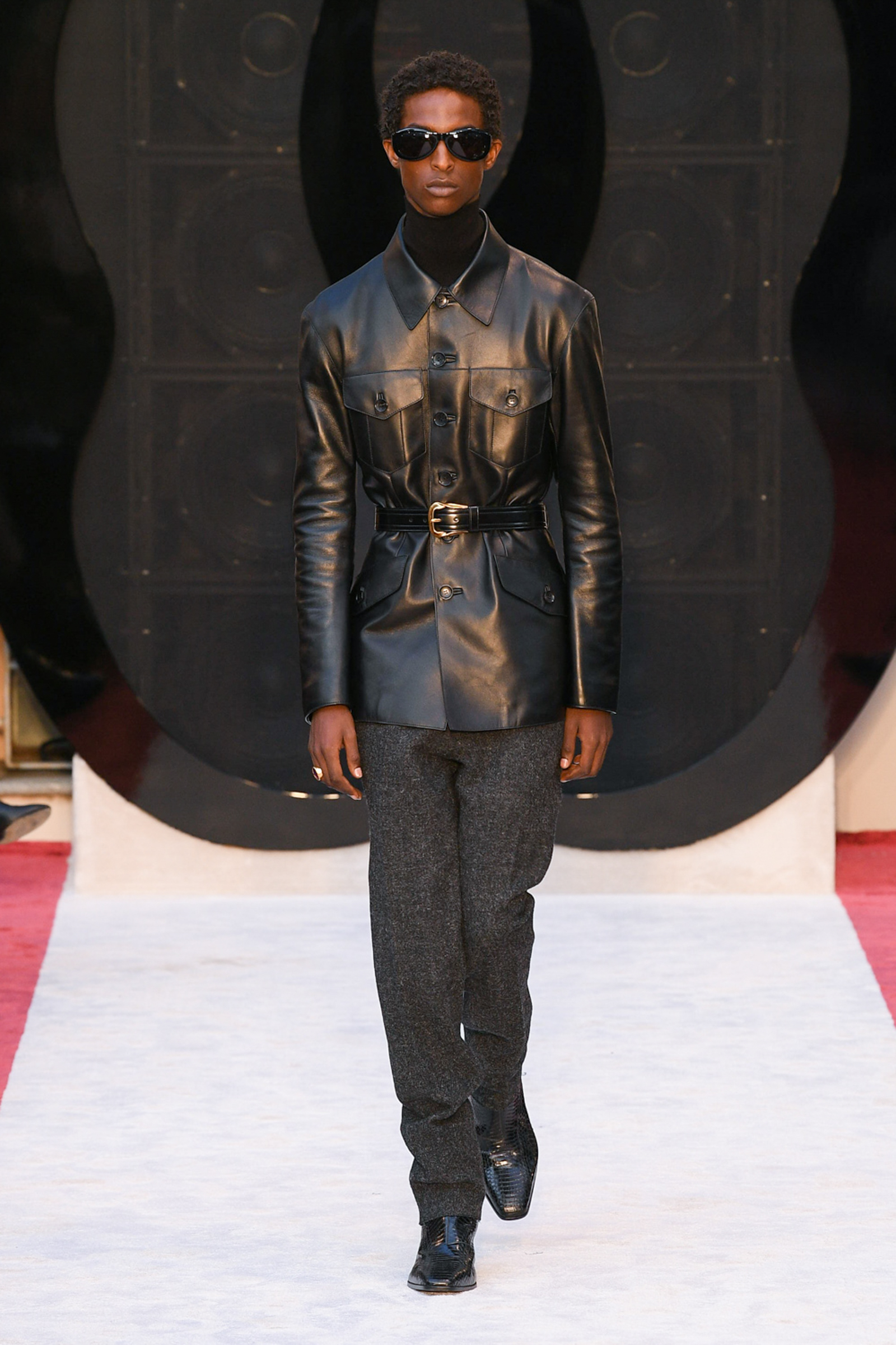 “It’s about slow travel,” said Villaseñor of his 20th century wardrobe shaped by a 21st century mindset. Non-literal references included Tommy Nutter shapes in the suiting, equestrian exclusivity in the boots, mercurial Miles Davis at Montreux in the archive-quilt black leather looks, Yves Saint Laurent in the hooded dresses, and all the foulard competitors in the straight-cut silk pants (for men) and handbags dressed in scarfs. Said Villaseñor: “When I was in my little corner of California reading Town & Country, trying to imagine myself eating truffles, this is what it looked like. It’s really opulent.”