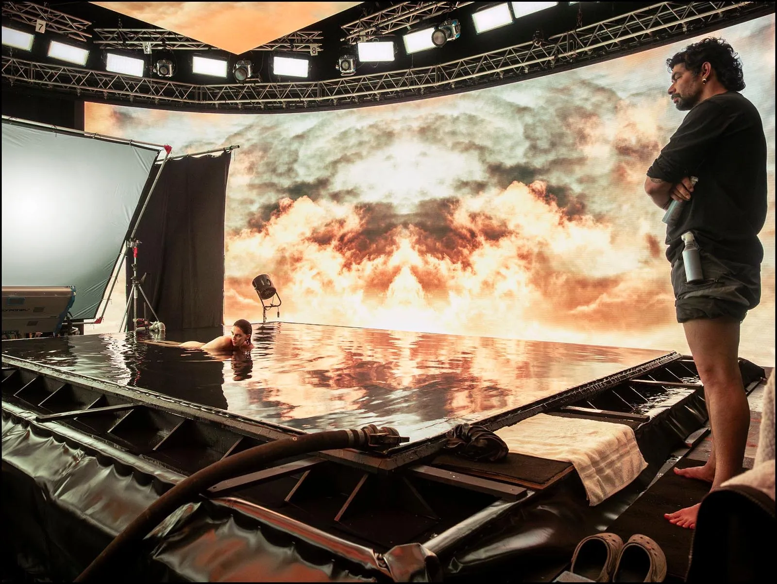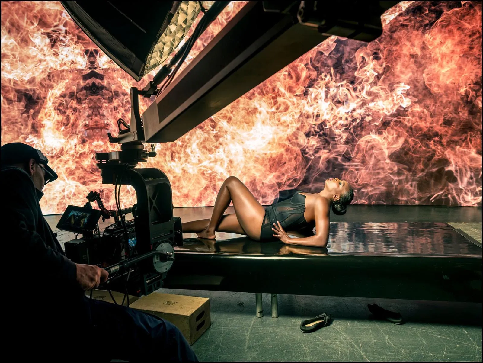 While the finished images will be revealed later this year, behind-the-scenes shots highlight the high-drama and dynamism to be expected: underwater and pastoral forest scenes, smouldering backdrops, dramatic windblown fabrics. Williams reclines in front of flames, while Rossellini is framed by bunches of brilliant pink florals, and Shayk makes use of the wind machine for a show-stopping shot.