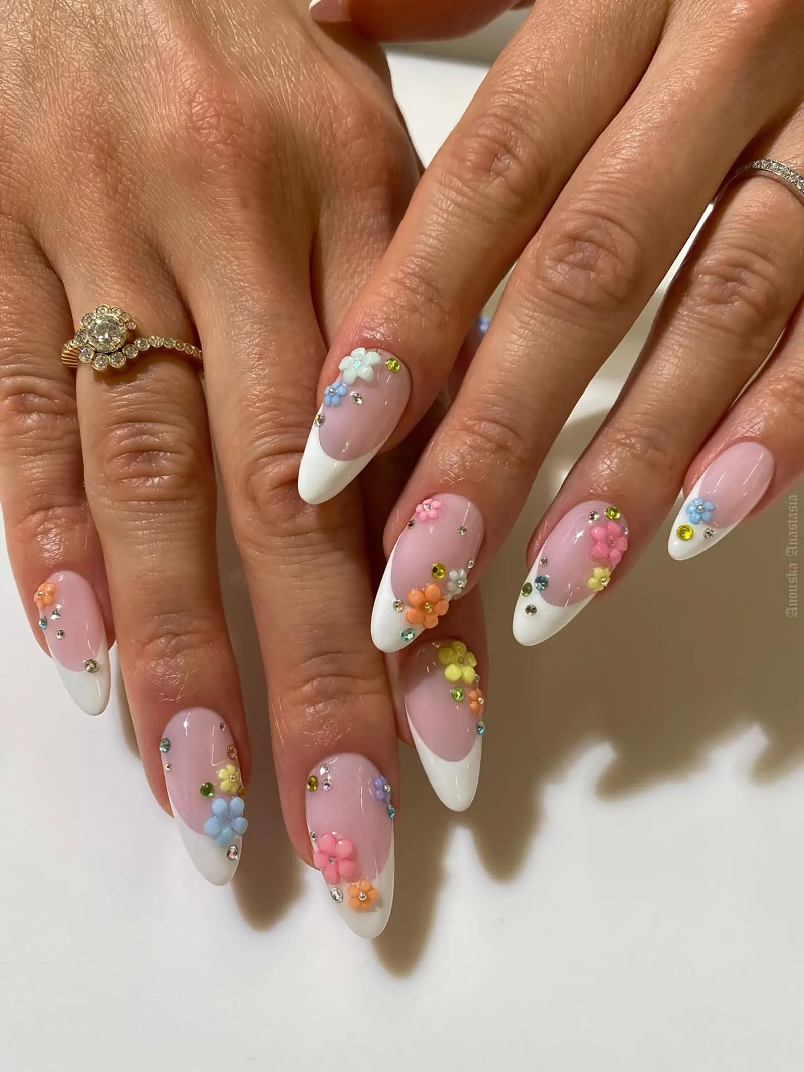Bucolic scenes on London-based nail artist Anouska Anastasia’s manicure. Recalling scenes from a pastoral Disney film, her French mani features small bunches of sweet pastel florals.