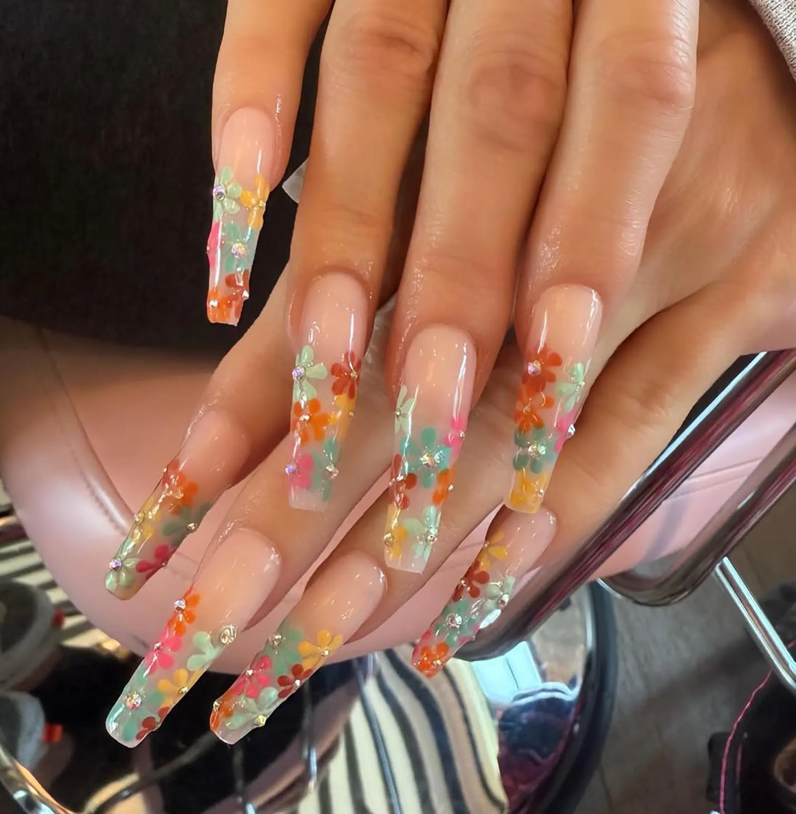 Tokyo meets Hollywood—nail artist to the stars (CC Hailey Bieber and Kesha) Britney Tokyo crafted Gwen Stefani’s talons for her AMAs performance, giving her coffin-shaped nails pops of aquamarine, hot pink, and butter yellow florals with jewels.