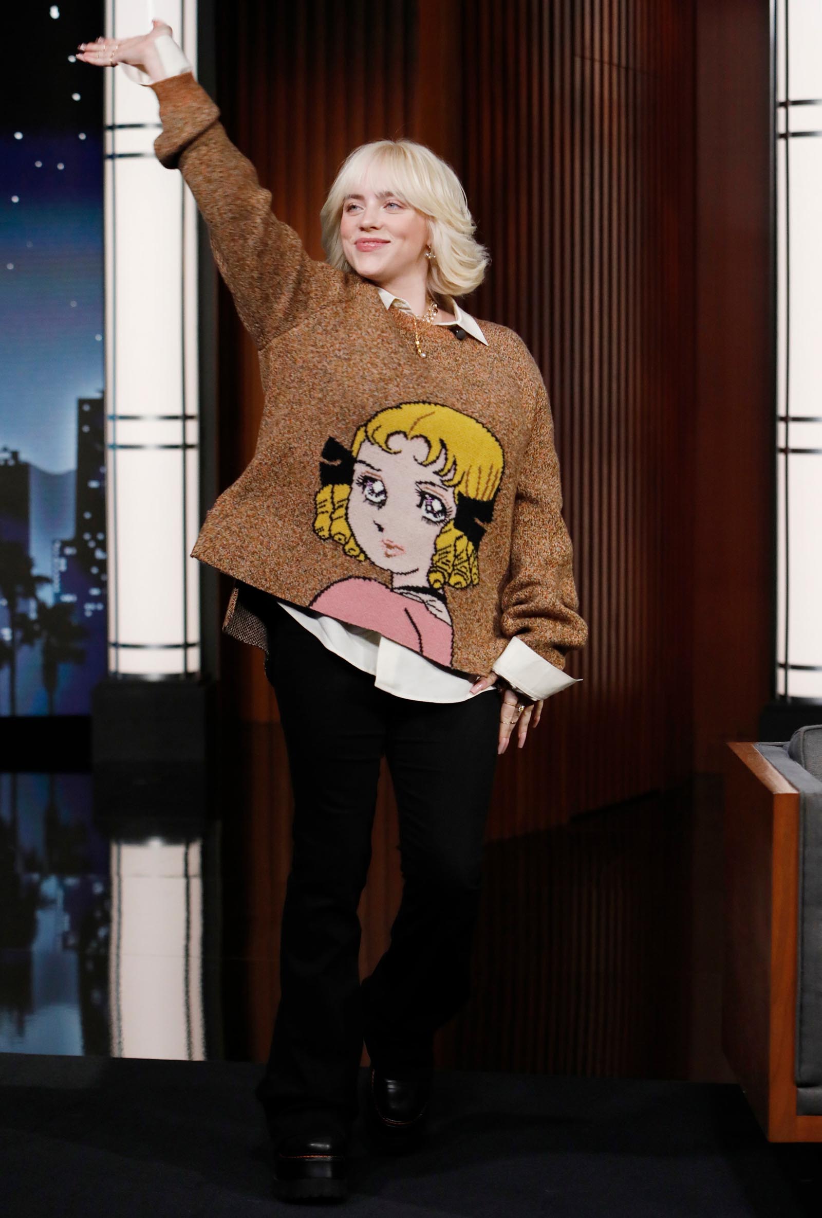 But it’s that dissonance that makes Billie Eilish, well, Billie Eilish. Over the last several years, as she’s grown from sweet teen to self-assured adult, the singer has undergone quite a style evolution. While she infused her look with a youthful energy—repping cartoon characters including Jessica Rabbit, the Powerpuff Girls, and Sailor Moon—she also shows off her more grown-up side, albeit, on her terms. See the Commes Des Garçons tee she wore with an extra long blue necktie, or the one she paired with a black tee and basketball shorts.
