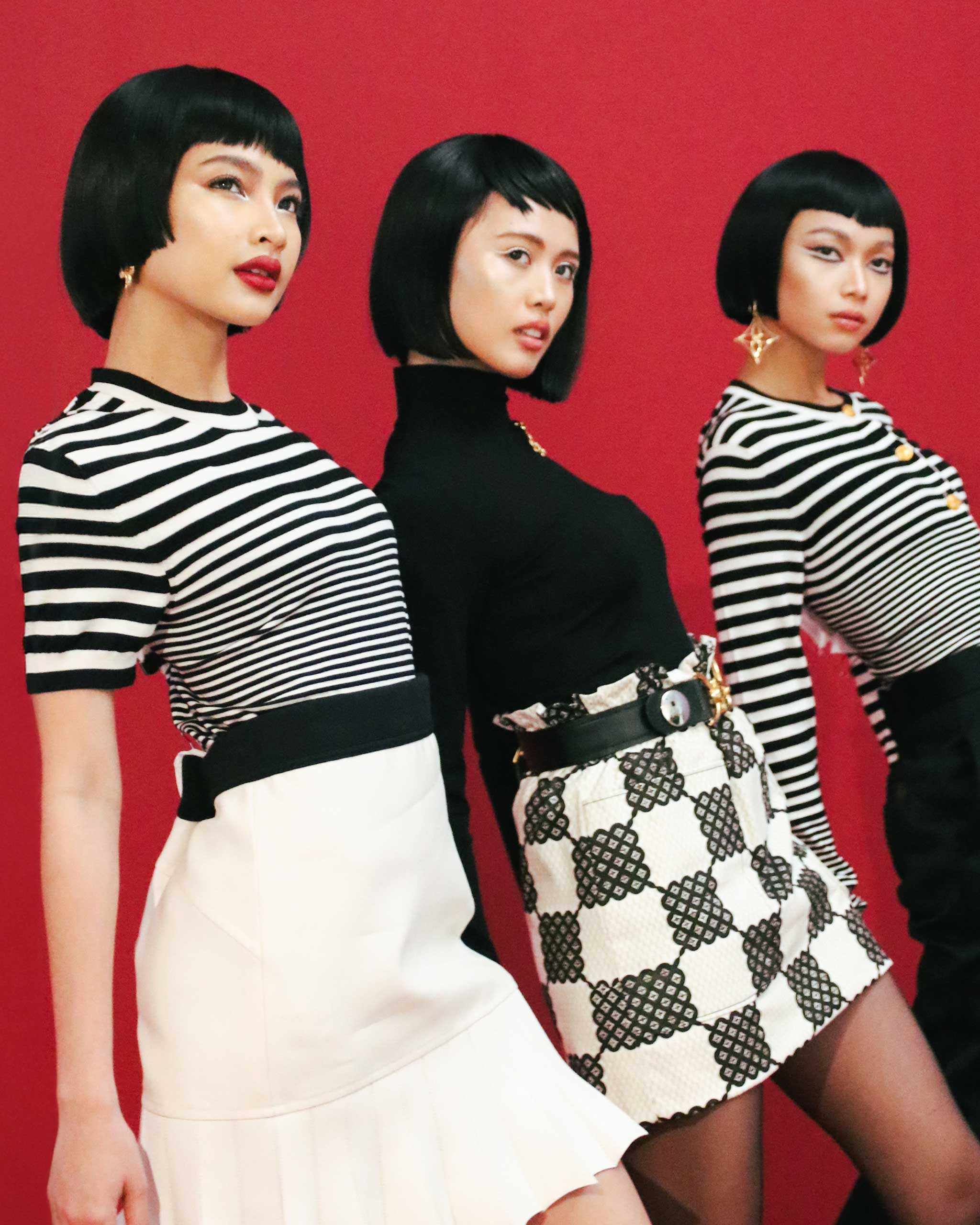 In the story’s planning stages, photographer Renzo Navarro was only excited, saying the concept was “a way to tell a different side of them.” On camera, it was. They readily transformed in blunt cuts; their heads bopped and feet tapped in tandem to chansons; and Louis Vuitton stylings transported them back to that mod affair, when mini skirts were an act of soft rebellion and the youth fought for their vision of a better world.