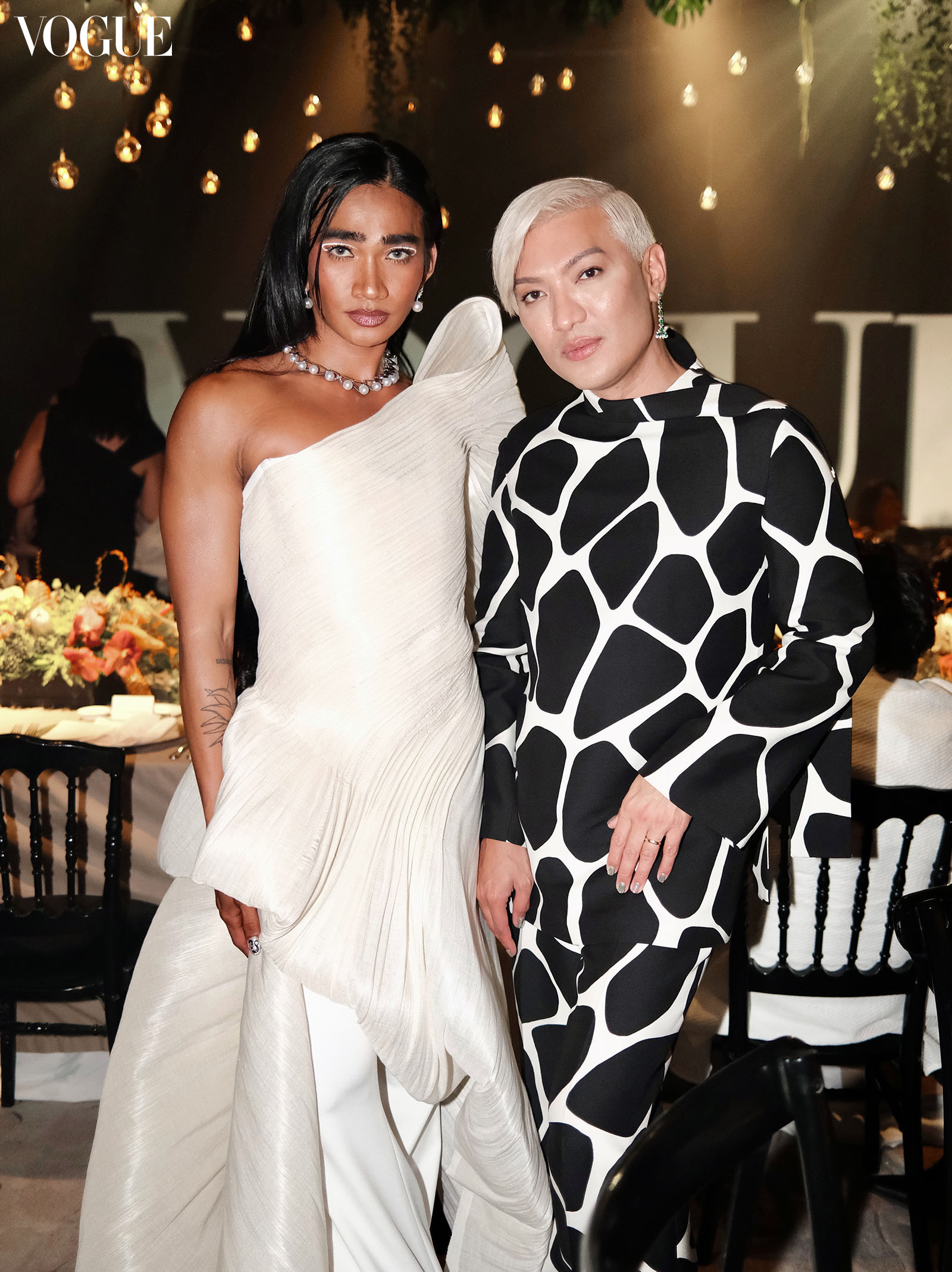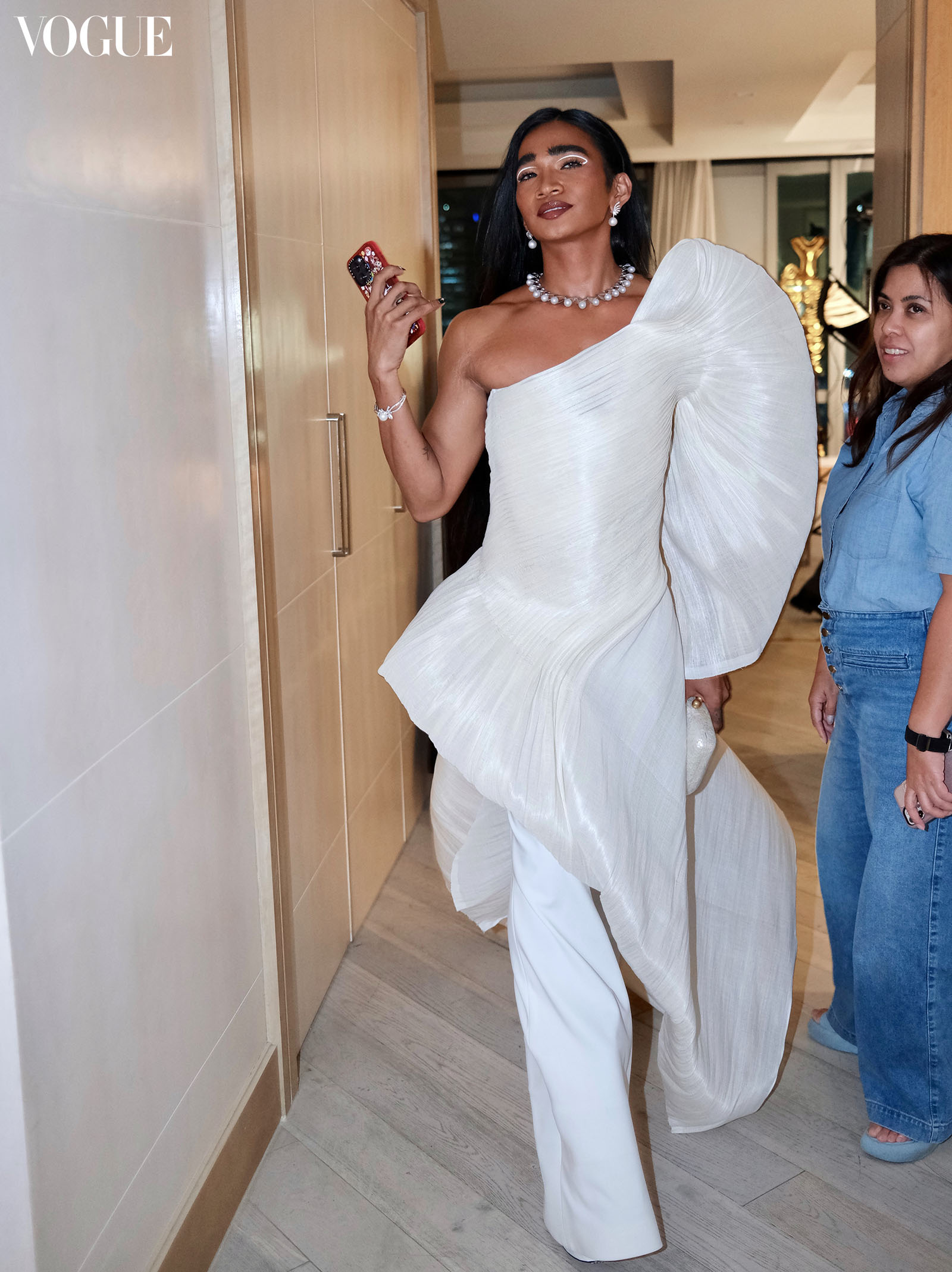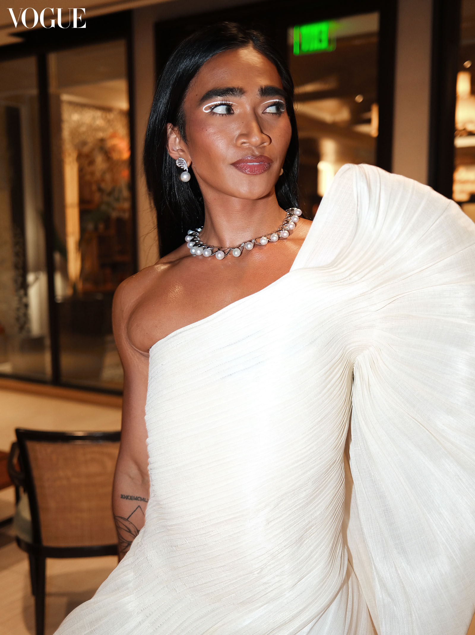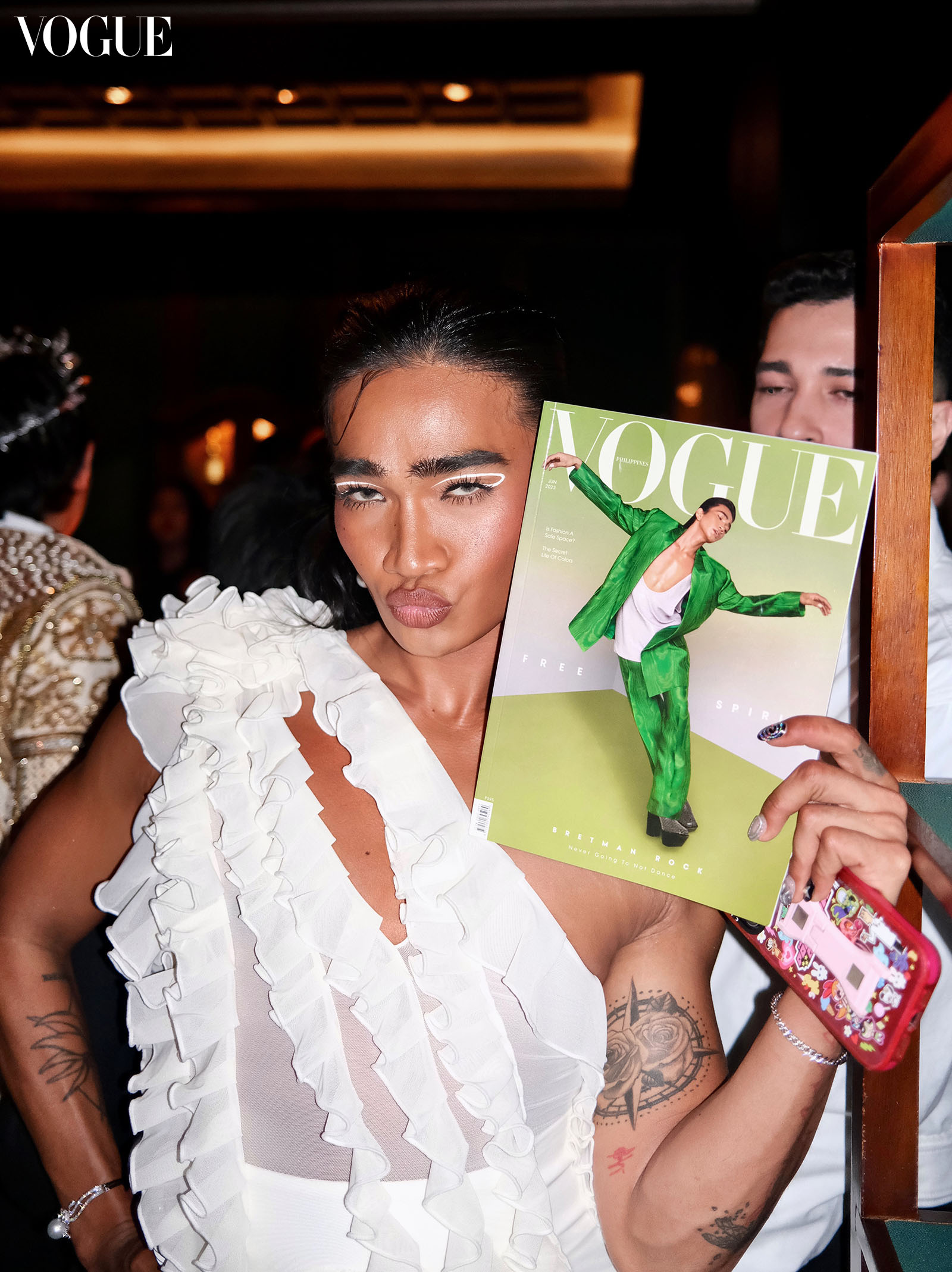 If there’s anyone who knows how to turn out a look, it’s Vogue Philippines June cover star Bretman Rock. Last Tuesday evening, the internet megastar arrived at the Vogue Philippines Anniversary Gala in his “perlas ng silanganan fantasy” frock—a sculptural abaca piece by Rajo Laurel—topped over white pants and paired with a choker of lustrous Jewelmer pearls.