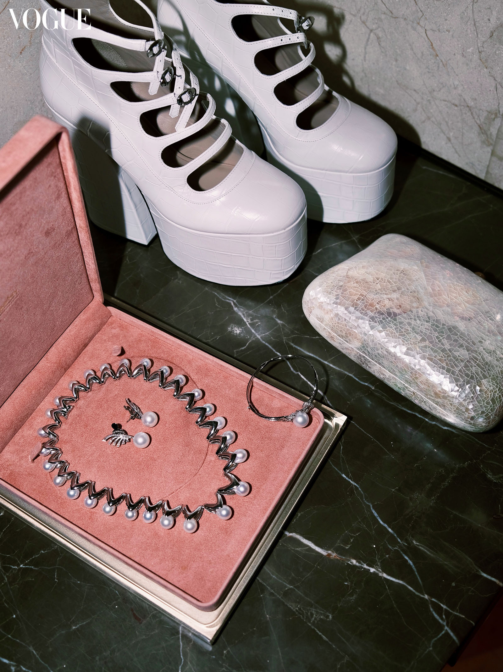 Photo by Brian Meller9/38My accessories for the night: Jewelmer pearls, a mother of pearl clutch from Artefino by Odel, and my favorite Marc Jacobs platform boots.