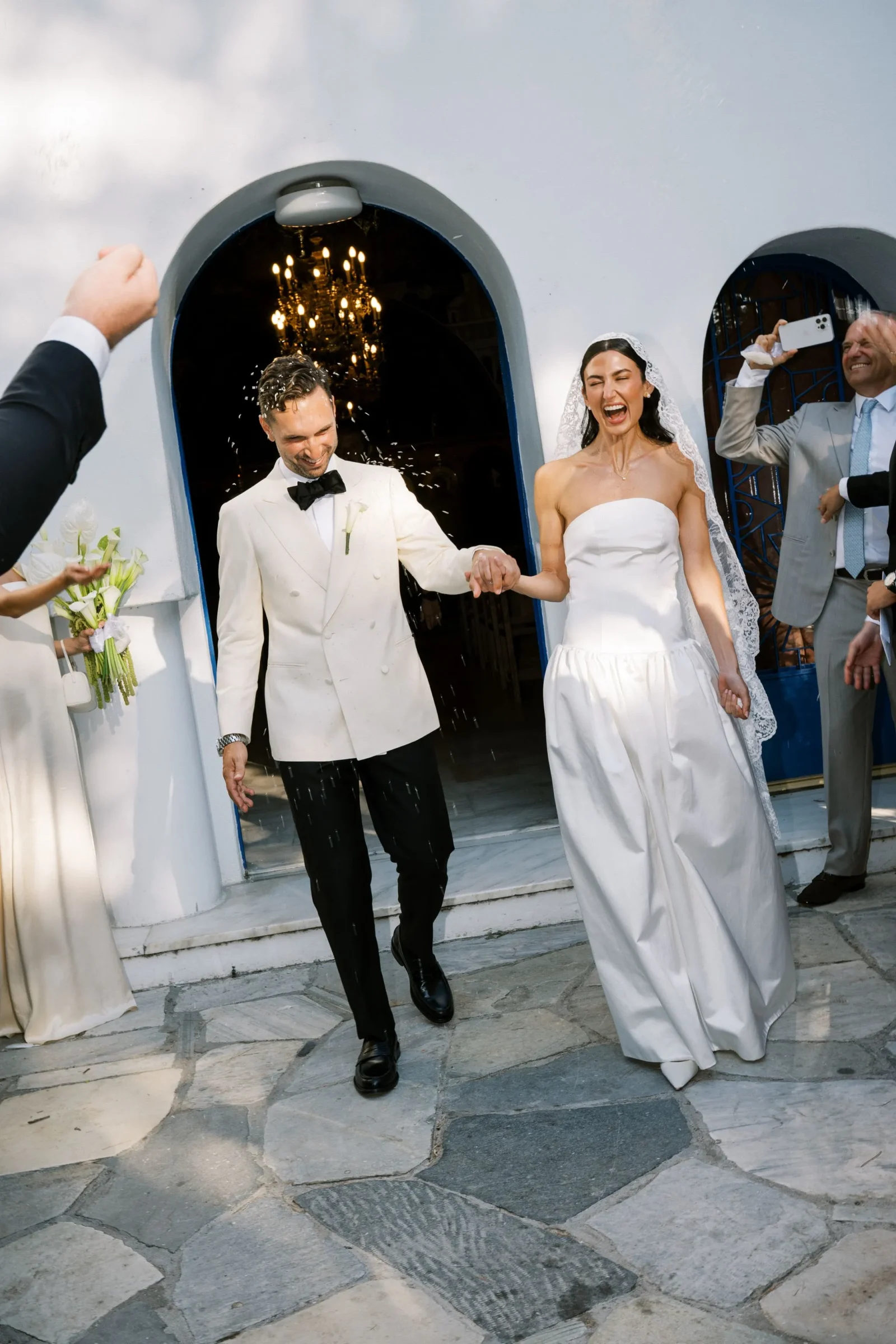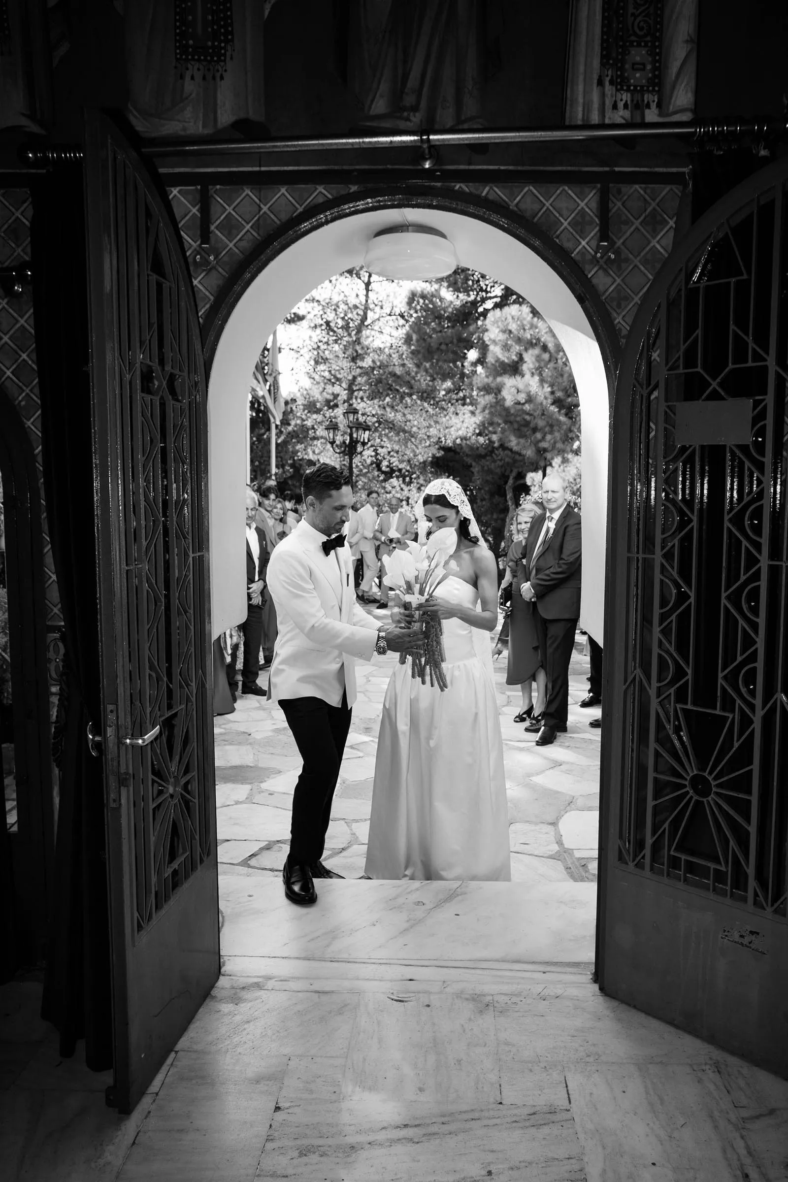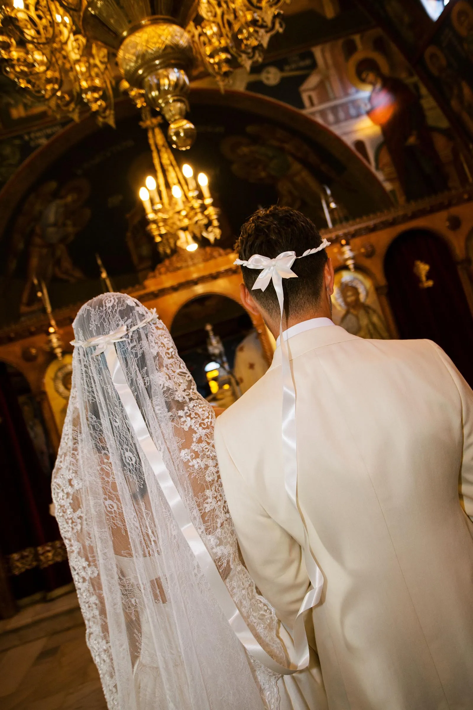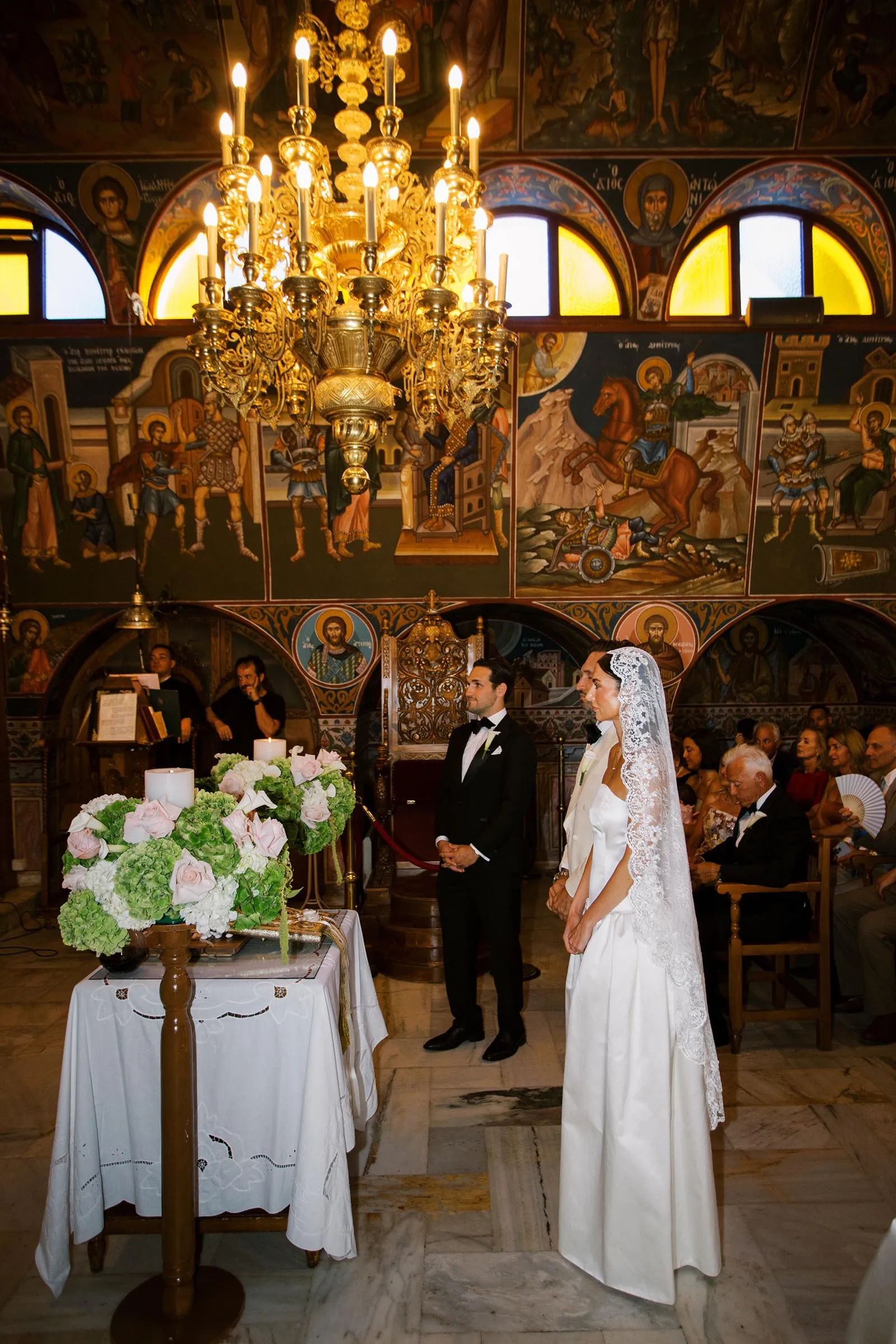 From there, Rebecca and her godfather made the short trip to the Chapel of Agios Georgios, where Stephen, holding the bride’s bouquet of calla lilies, and all their guests were waiting outside, as per Greek tradition. Following the procession inside the church, the bride and groom discovered to much hilarity that the entire service was in Greek. “What was funny is that we had paid extra for it to be in English, yet there was no English,” Rebecca laughs. “But we had printed out little leaflets for our guests in English of the order of service, so they could follow along.”