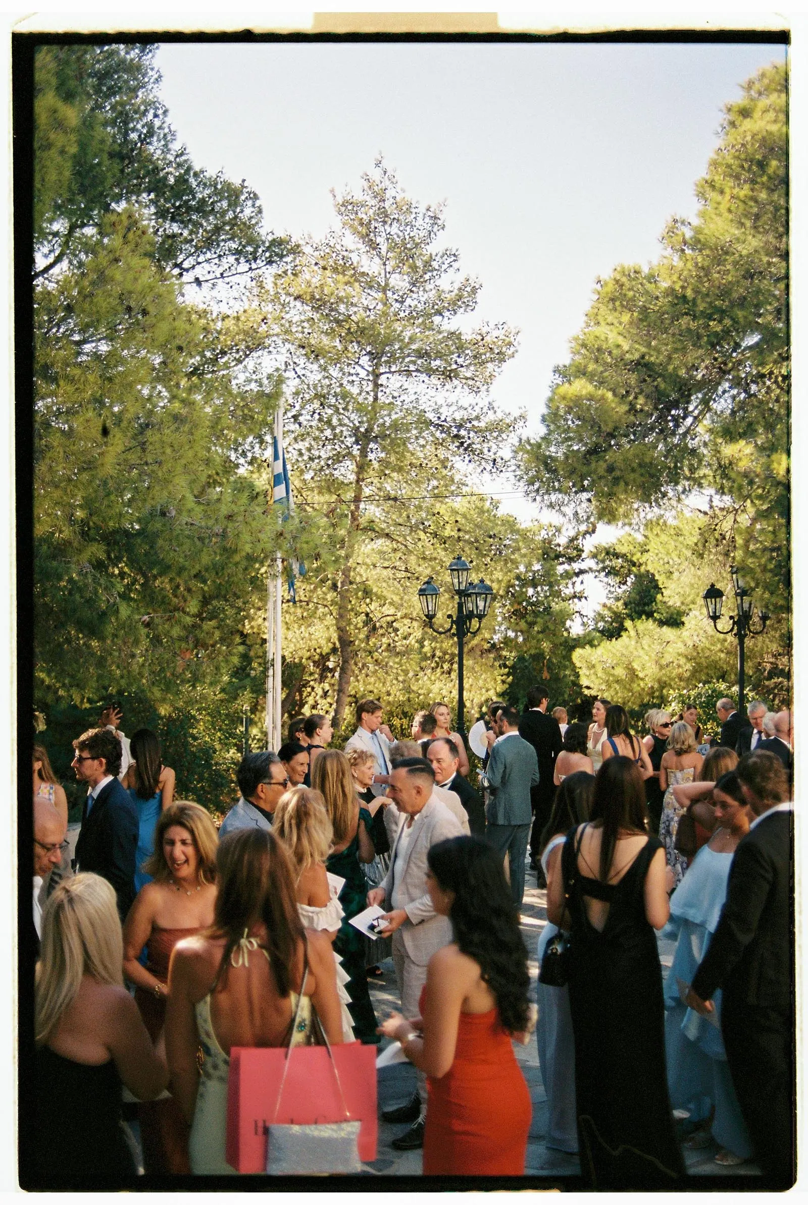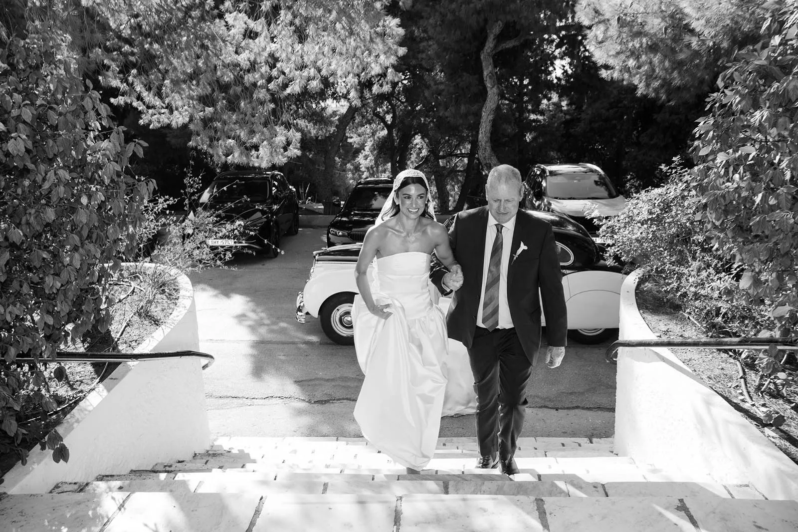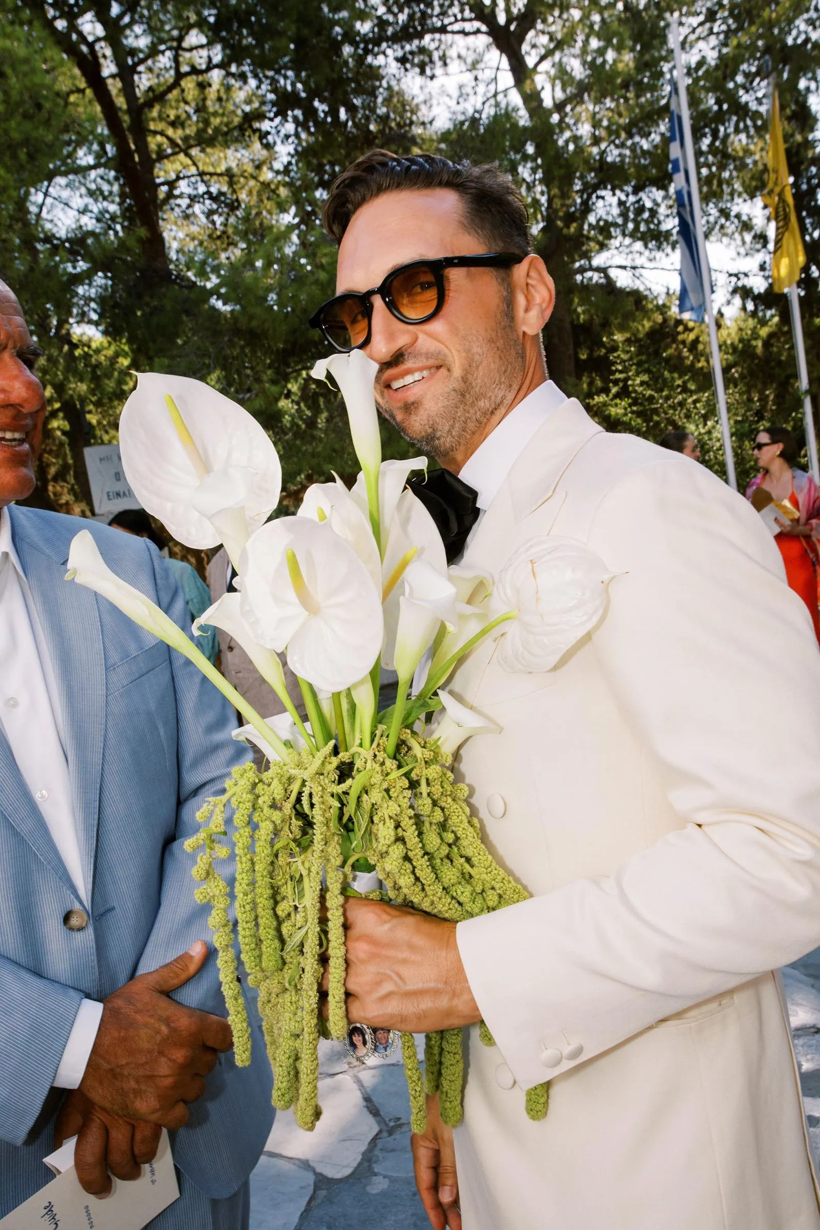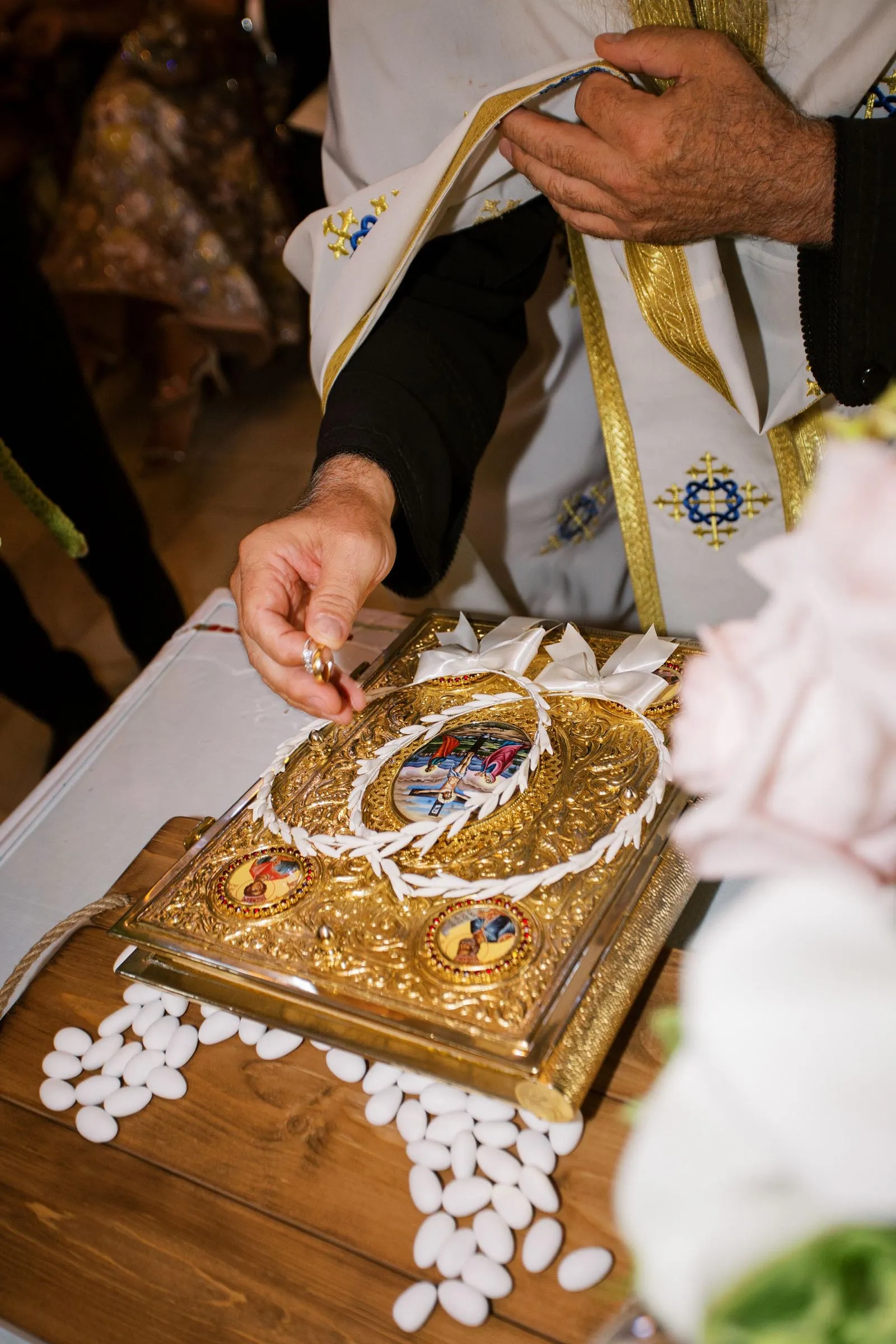 From there, Rebecca and her godfather made the short trip to the Chapel of Agios Georgios, where Stephen, holding the bride’s bouquet of calla lilies, and all their guests were waiting outside, as per Greek tradition. Following the procession inside the church, the bride and groom discovered to much hilarity that the entire service was in Greek. “What was funny is that we had paid extra for it to be in English, yet there was no English,” Rebecca laughs. “But we had printed out little leaflets for our guests in English of the order of service, so they could follow along.”