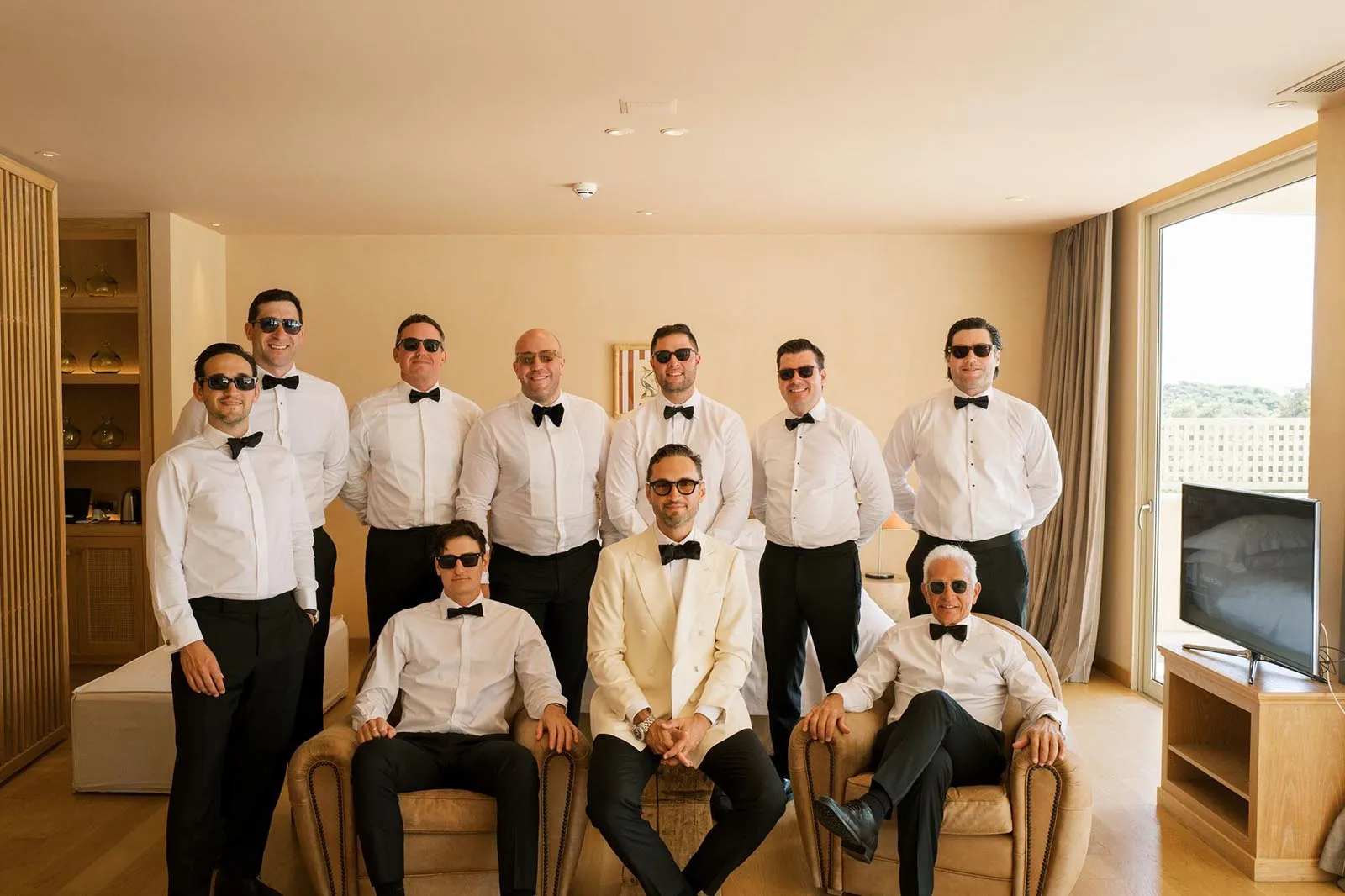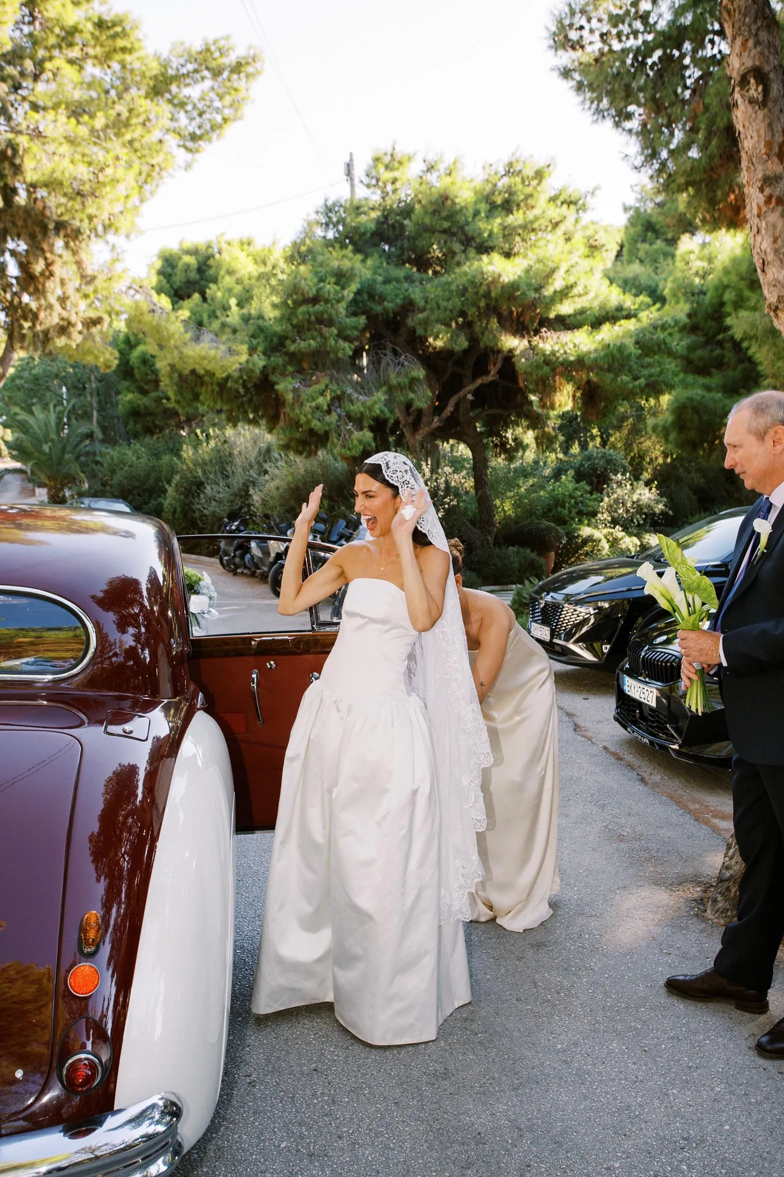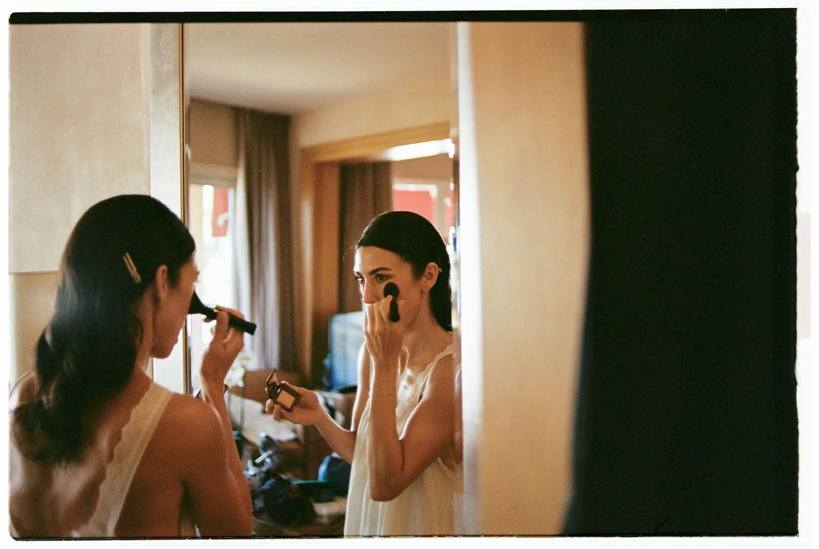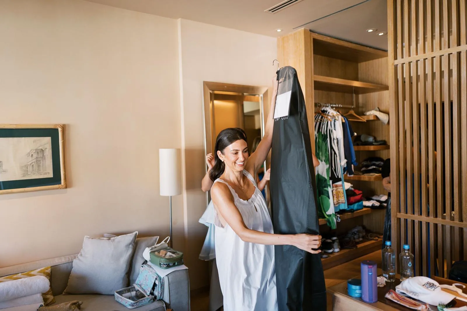On the morning of the wedding, Rebecca and Stephen had breakfast together as normal (“I didn’t want to be stressed or have anything out of the normal,” the bride explains), before separating to get ready for the ceremony. The bridal party headed to a salon in Athens to get their hair and nails done, returning to The Margi hotel for final preparations, with Rebecca opting to do her own make-up for the day. “I wanted the girls to be in a couple of rooms getting ready, helping each other out, because I thought that would make me feel most at ease,” the bride says.