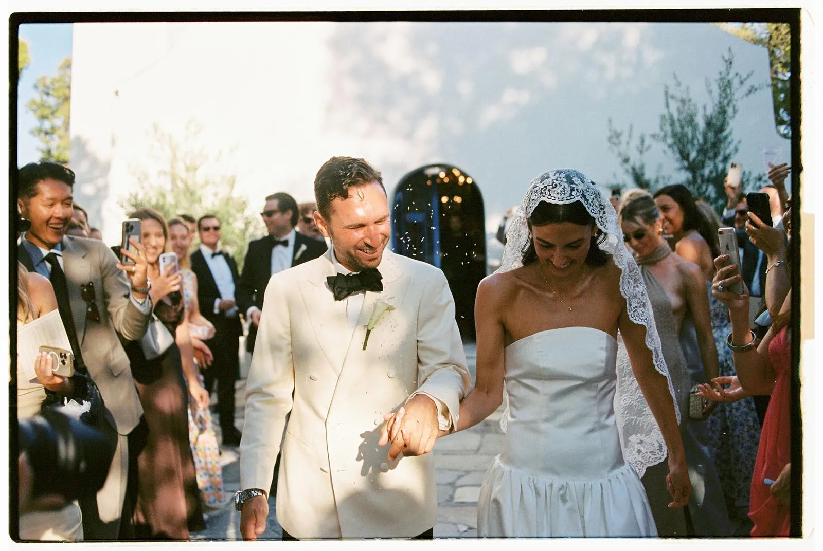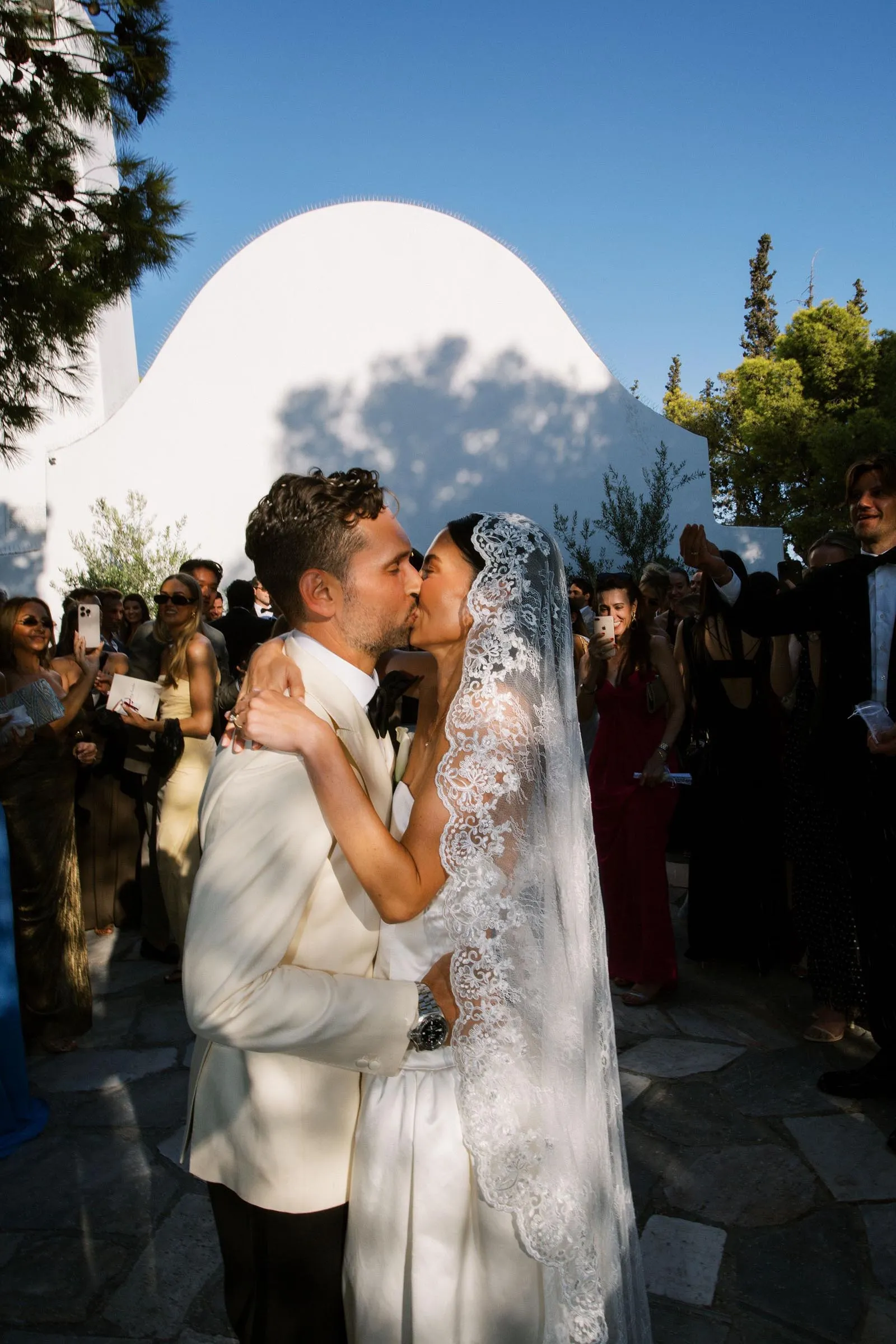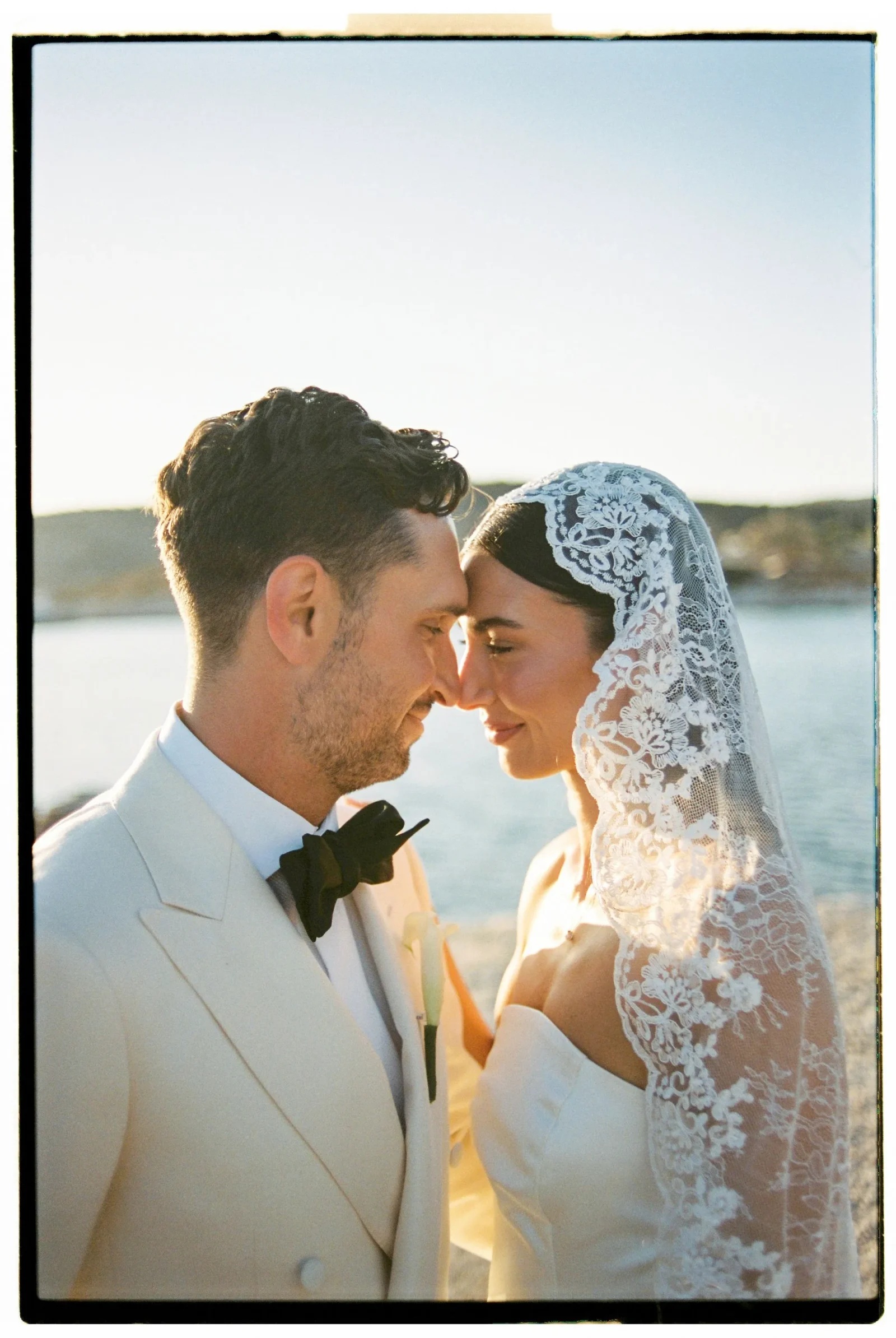 When it came to the accessories, Rebecca knew she wanted to wear a veil for her Greek Orthodox ceremony—but struggled to find the perfect one at first. “I knew I wanted a heavy lace veil around the face, so I travelled to Madrid to find one at a local market, but had no luck,” the bride explains. It was only when she came across New Zealand-based brand Harriett Falvey that she was able to find the “clean, structured” veil she was looking for, working with the bridal designer to ensure that it was the right length, as well as complementing the colour of her dress. “Until the day itself, I hadn’t actually tried them together,” Rebecca says. “The veil was honestly the MVP of the day.”