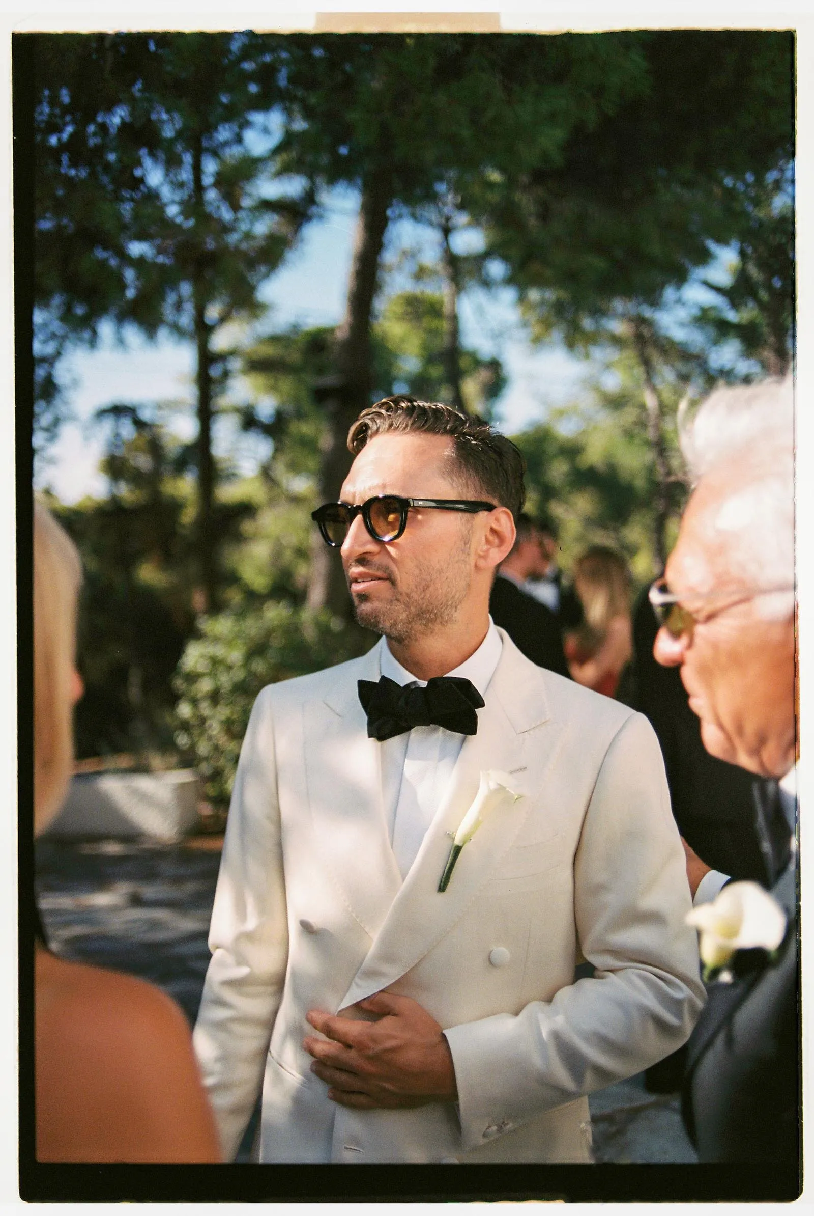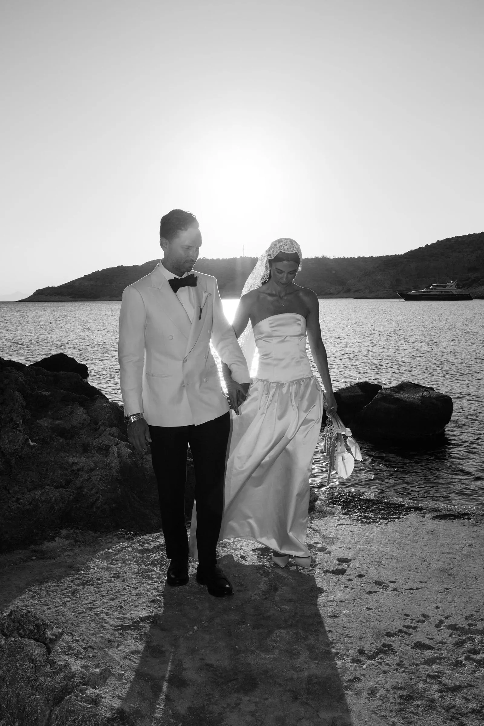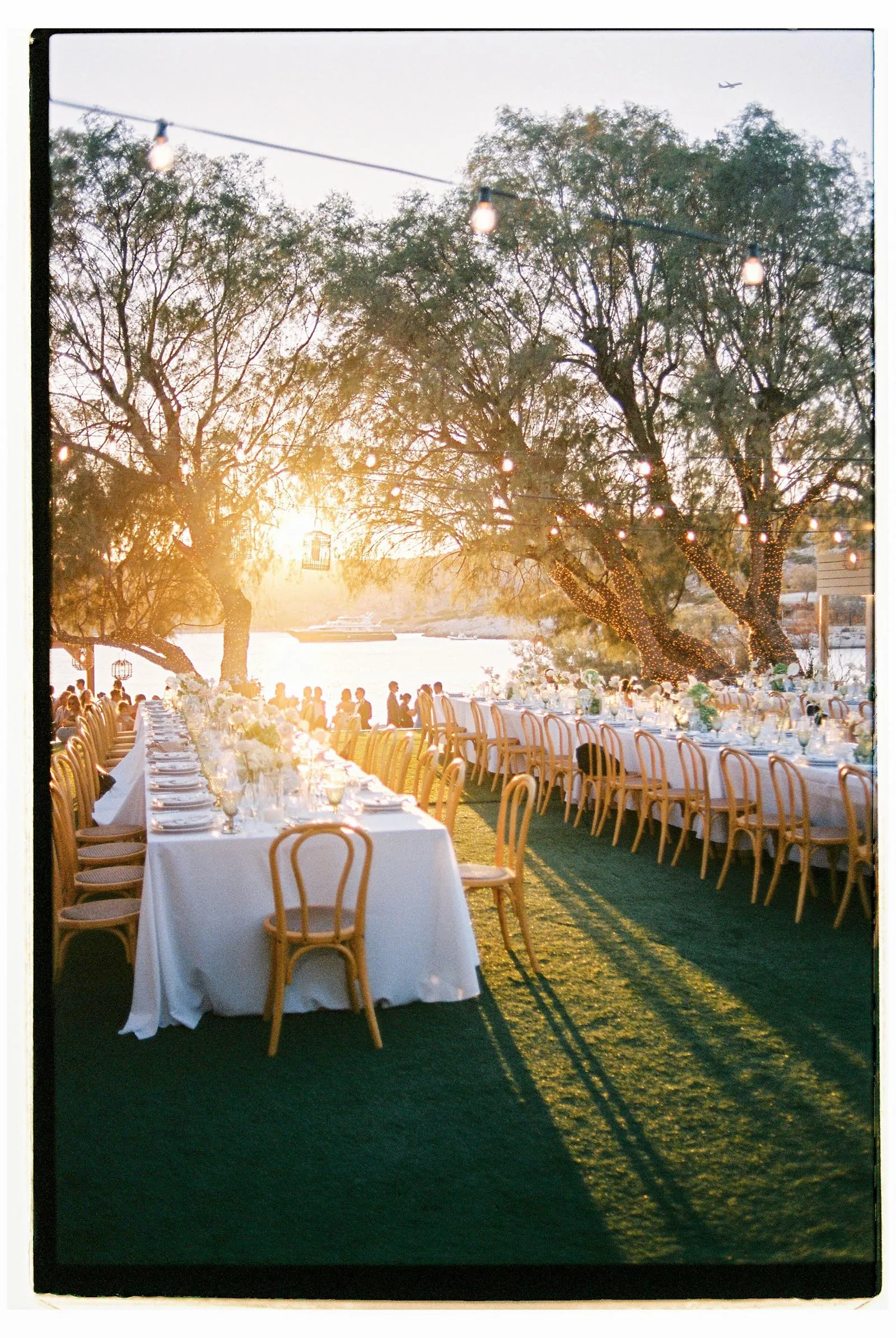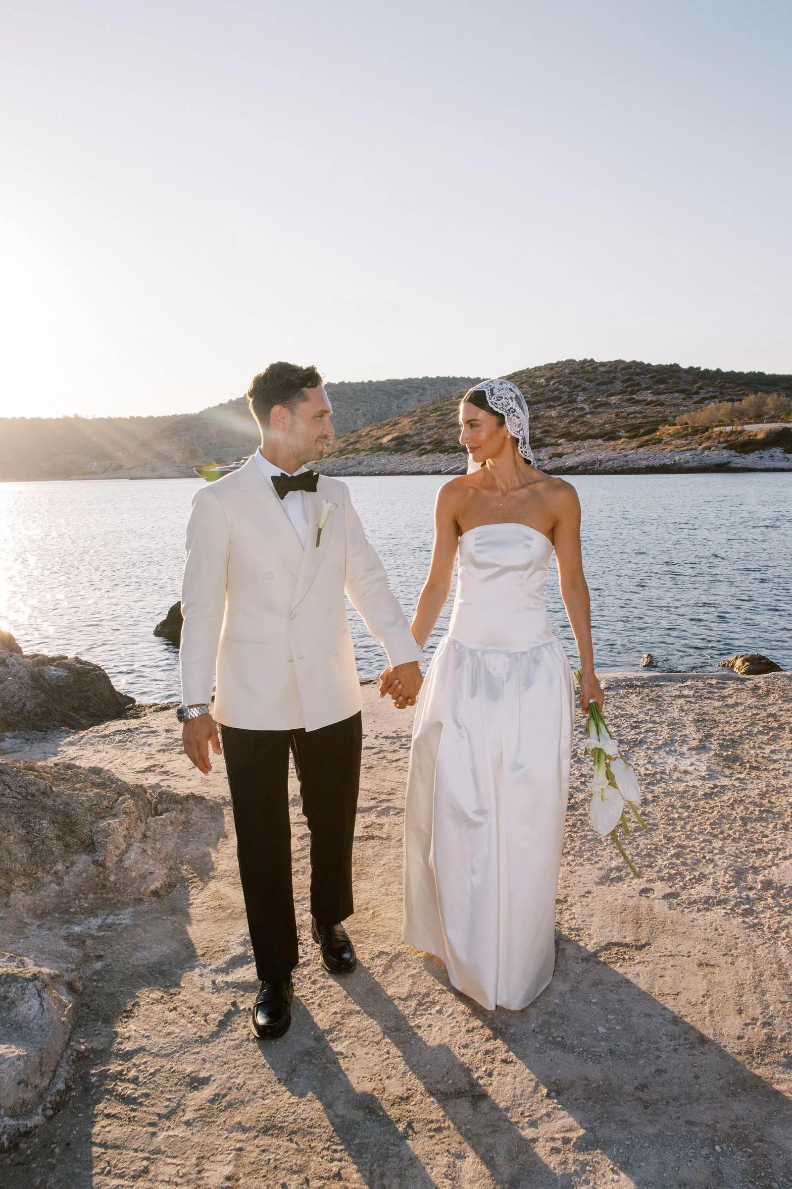 Right away, the couple knew that they wanted to get married in Greece—not only because of Stephen’s heritage, but also because it’s a place they’ve often travelled to together over the years. Given that most of their guests were coming from either Australia or the UK, it also acted as a convenient location between the two. “We knew we loved the Athens Riviera,” Rebecca says, with the couple quickly settling on their venue: the Reef. “It’s sat up on the beach, but you can still see the mountains in the distance,” the bride says of the stunning backdrop.