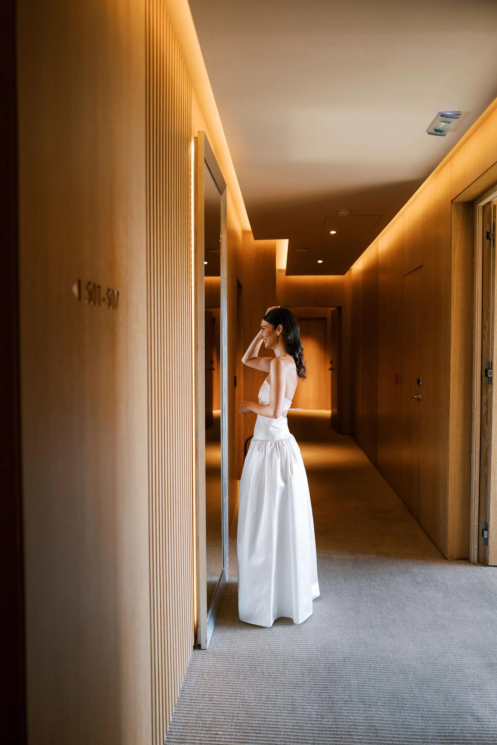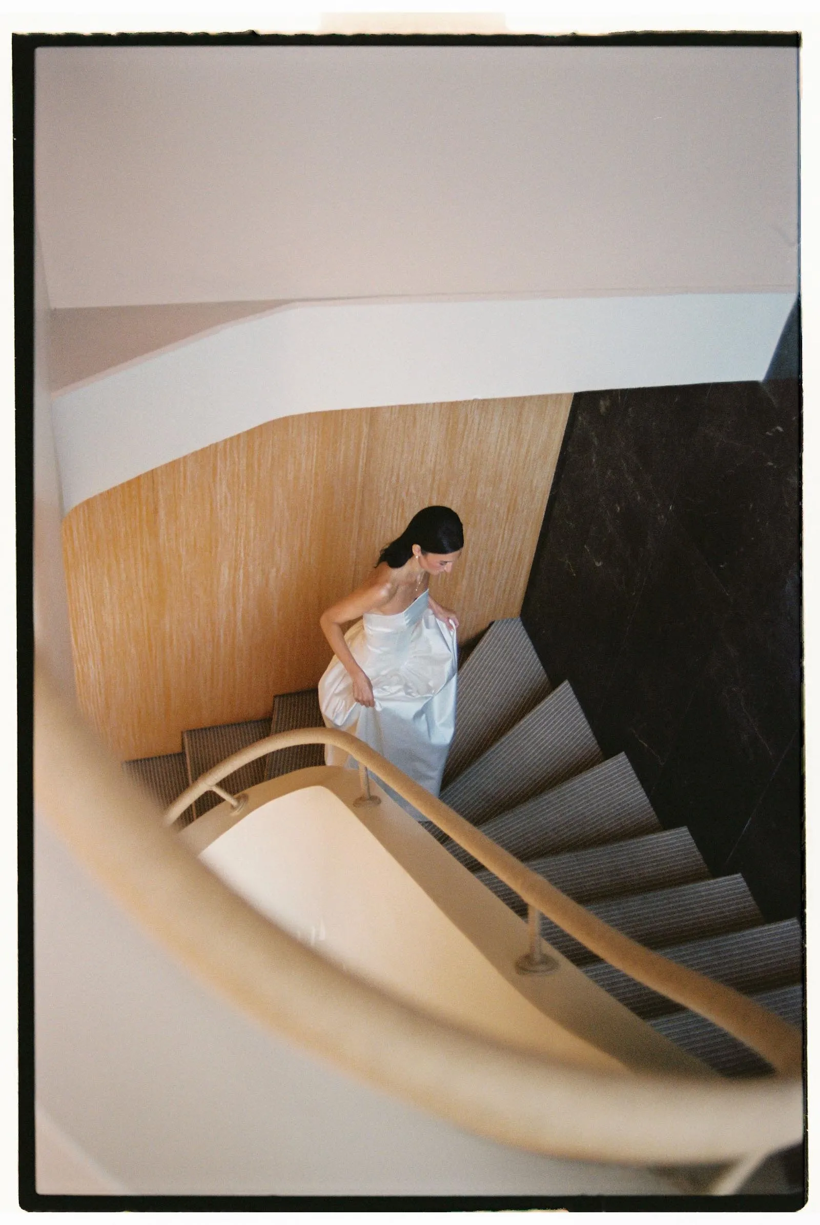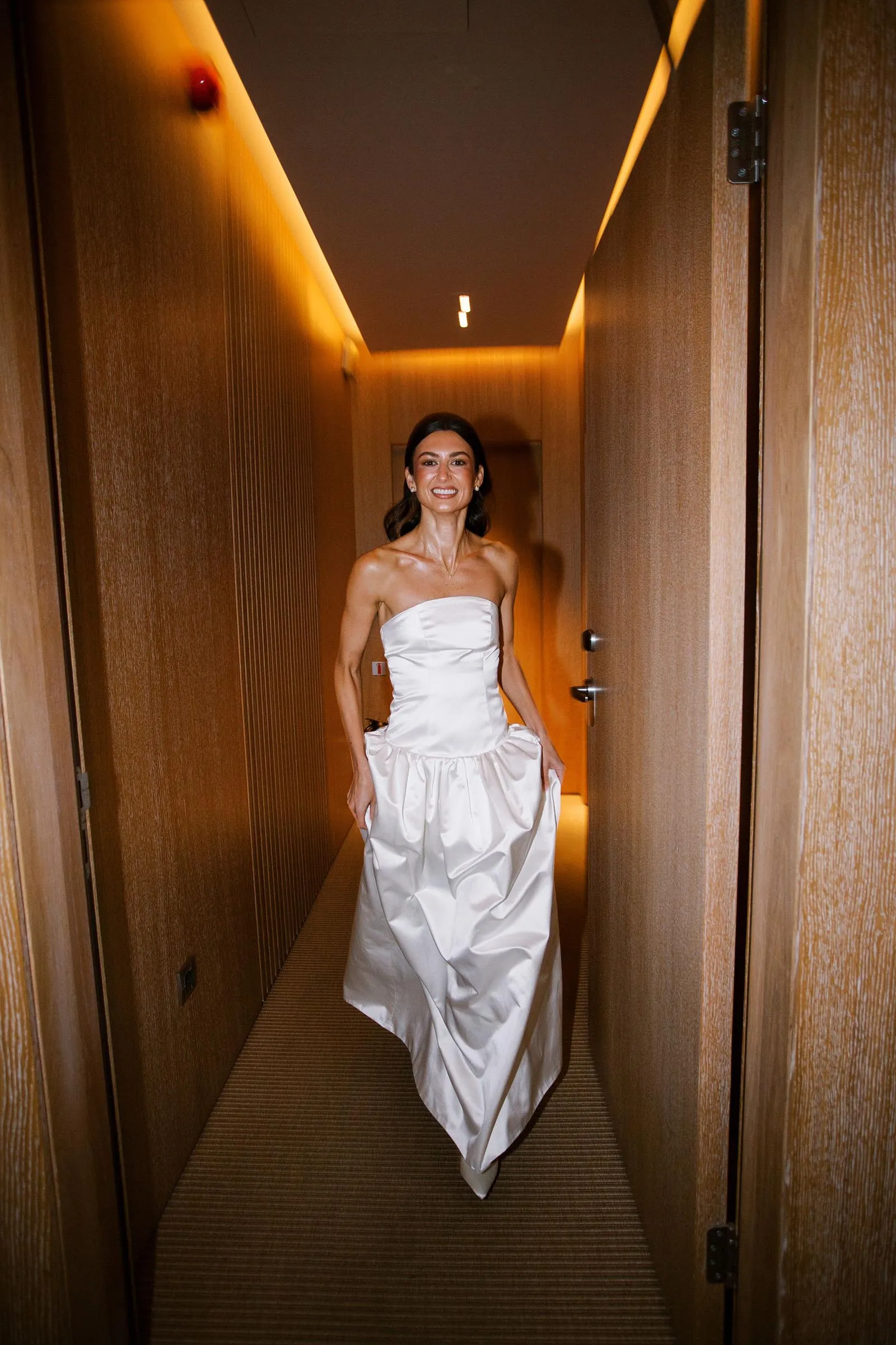 Once the venue was nailed, Rebecca turned her attention to the dress, with her first port of call being London-based bridal brand The Own Studio—which has fast become a favourite for minimalist brides. After trying on a few styles, she settled upon a strapless drop-waist design in duchesse satin (style 82, to be precise). “They have that cool, modern It-girl factor, but [the dresses are] still timeless,” Rebecca notes. “I wanted the dress to feel bridal, but not too formal.”