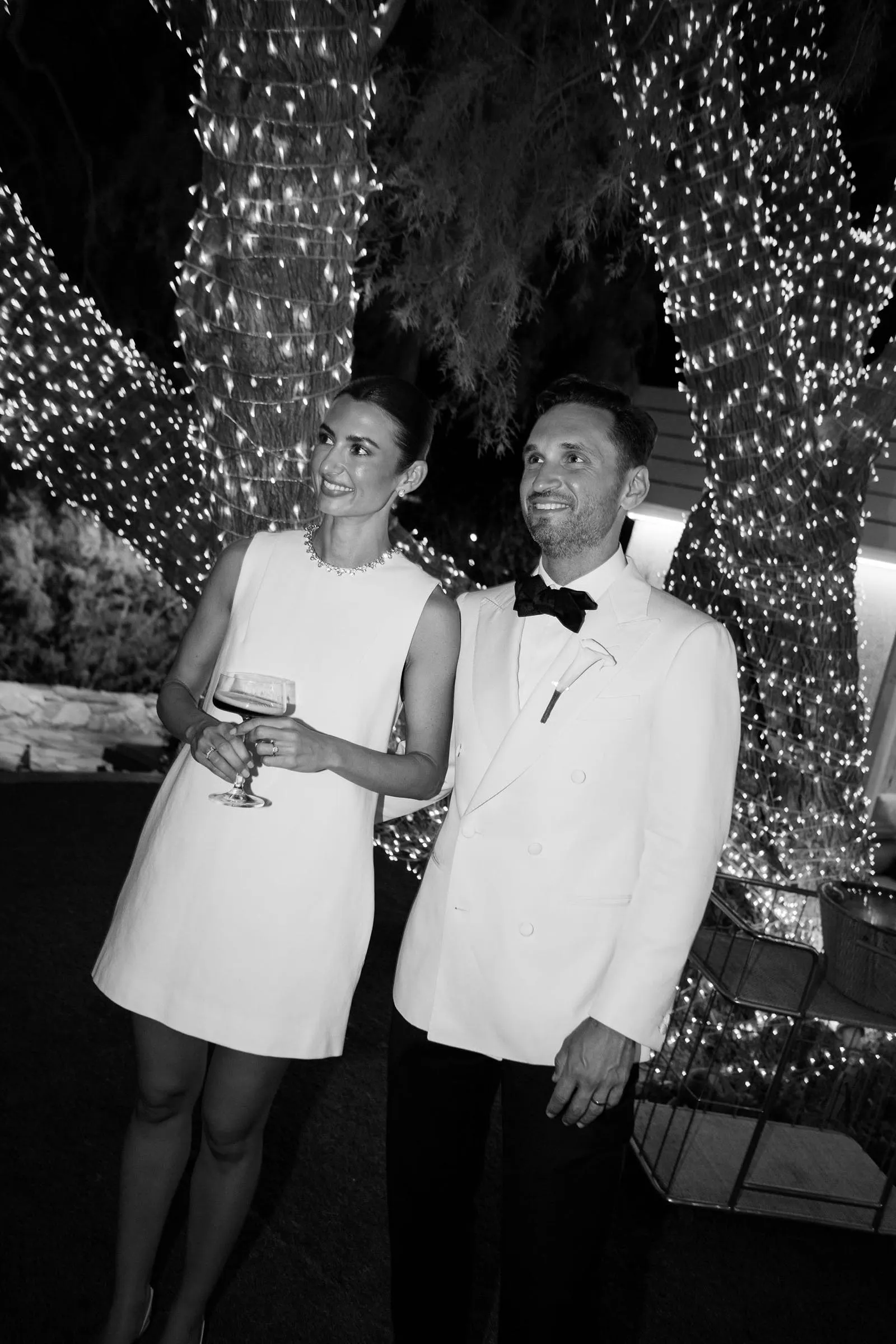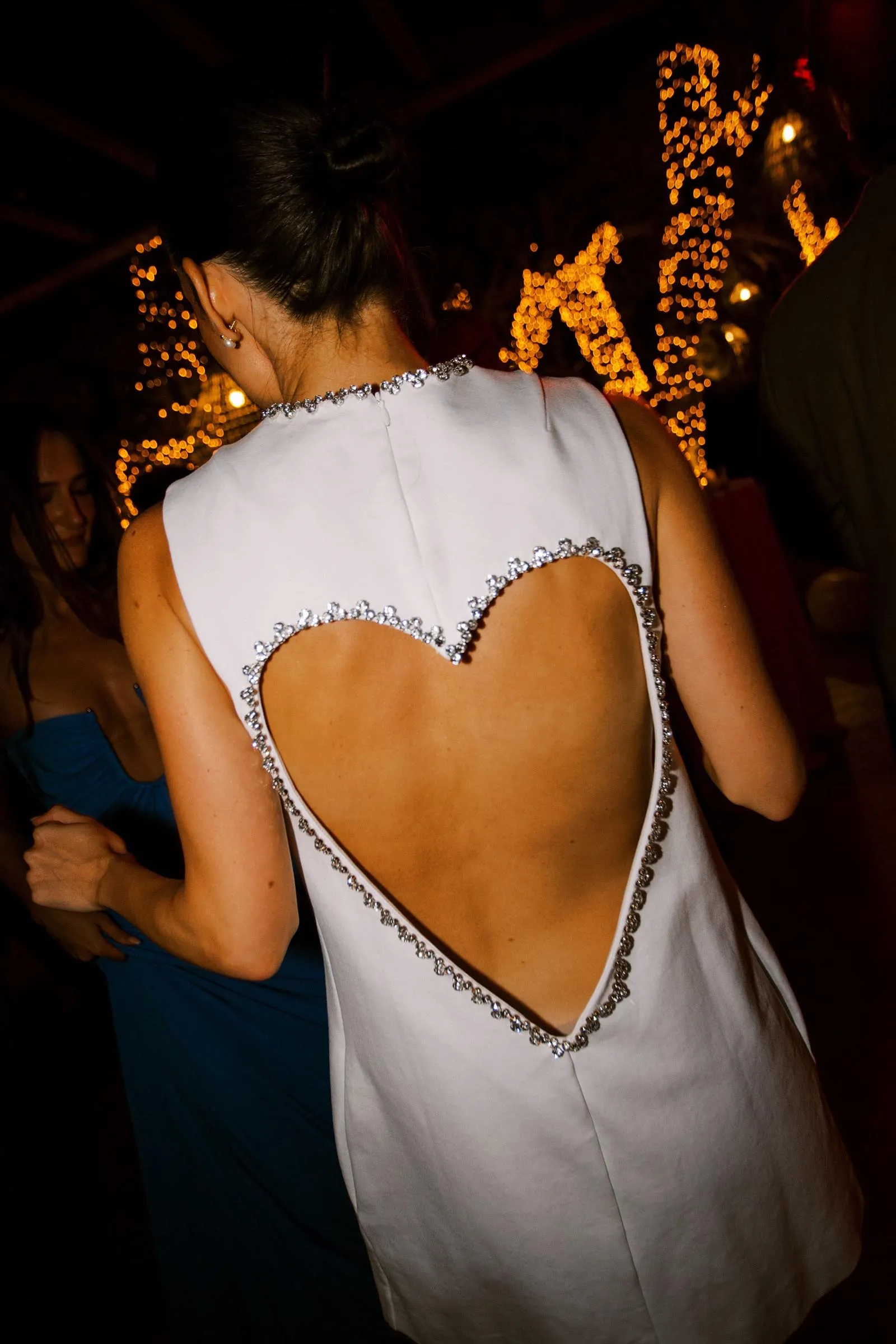 Ahead of the cake cutting, Rebecca changed into a second dress: an Area minidress featuring a heart-shaped cut-out at the back, embellished with crystals. “I feel that when you come out in your second dress on the dance floor, it’s so [often] missed, and so I wanted it to be more of a statement,” the bride says. After that, it was time to hit the dance floor, with the couple foregoing the traditional first dance by inviting all guests to boogie with them to “Keep On Movin’” by Five.