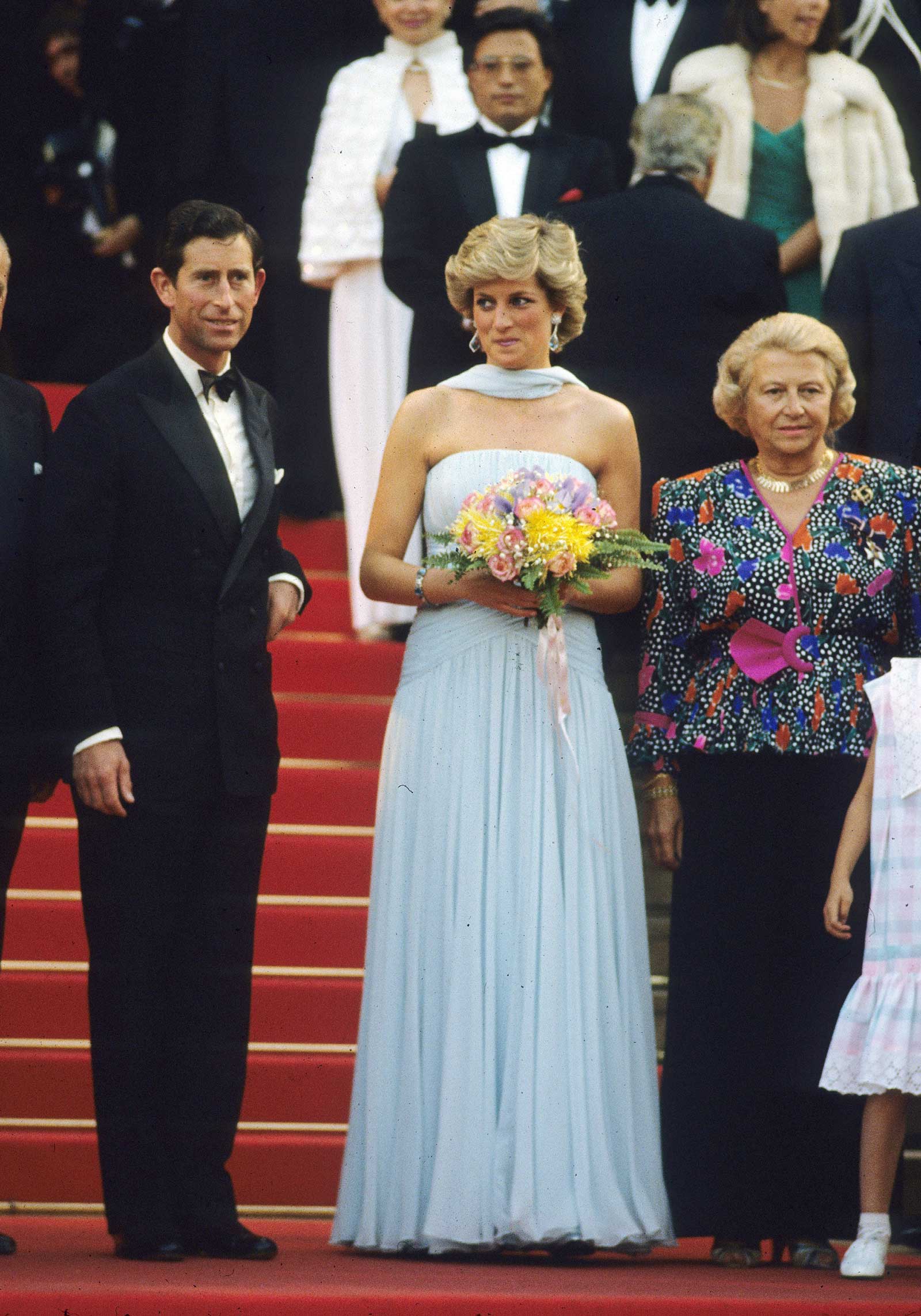 Prince Charles and Princess Diana—who’s wearing a dress by Catherine Walker—attend an event in honor of Sir Alec Guinness.