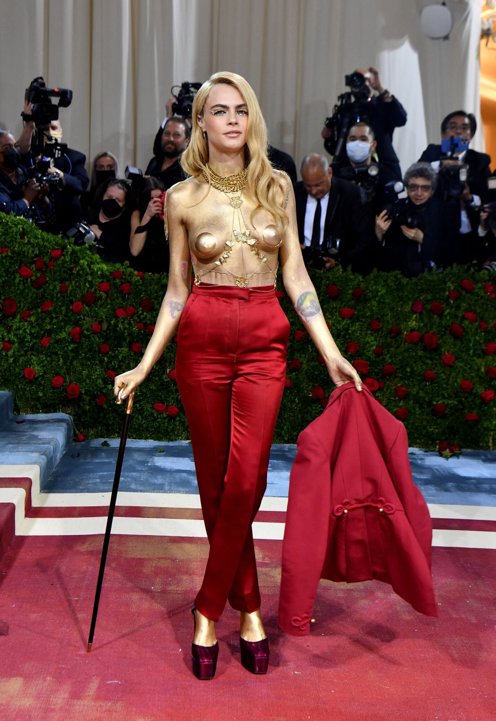 Since attending her very first Met Gala in 2011, English model Cara Delevingne—Vogue’s cover star last month—has become a mainstay on the star-studded event’s red carpet, which is hosted every year on the steps of the Metropolitan Museum of Art in New York. Whether embracing the punk theme in 2013, or the theme of camp in 2019, Delevingne has consistently proven she’s dedicated to nailing the dress code—and truly going for it—to deliver a memorable fashion look. In fact, over the years, she’s proven to be one of Met’s biggest risk-takers. Who could forget the star’s 2022 look by Dior that read: “Peg the Patriarchy”?