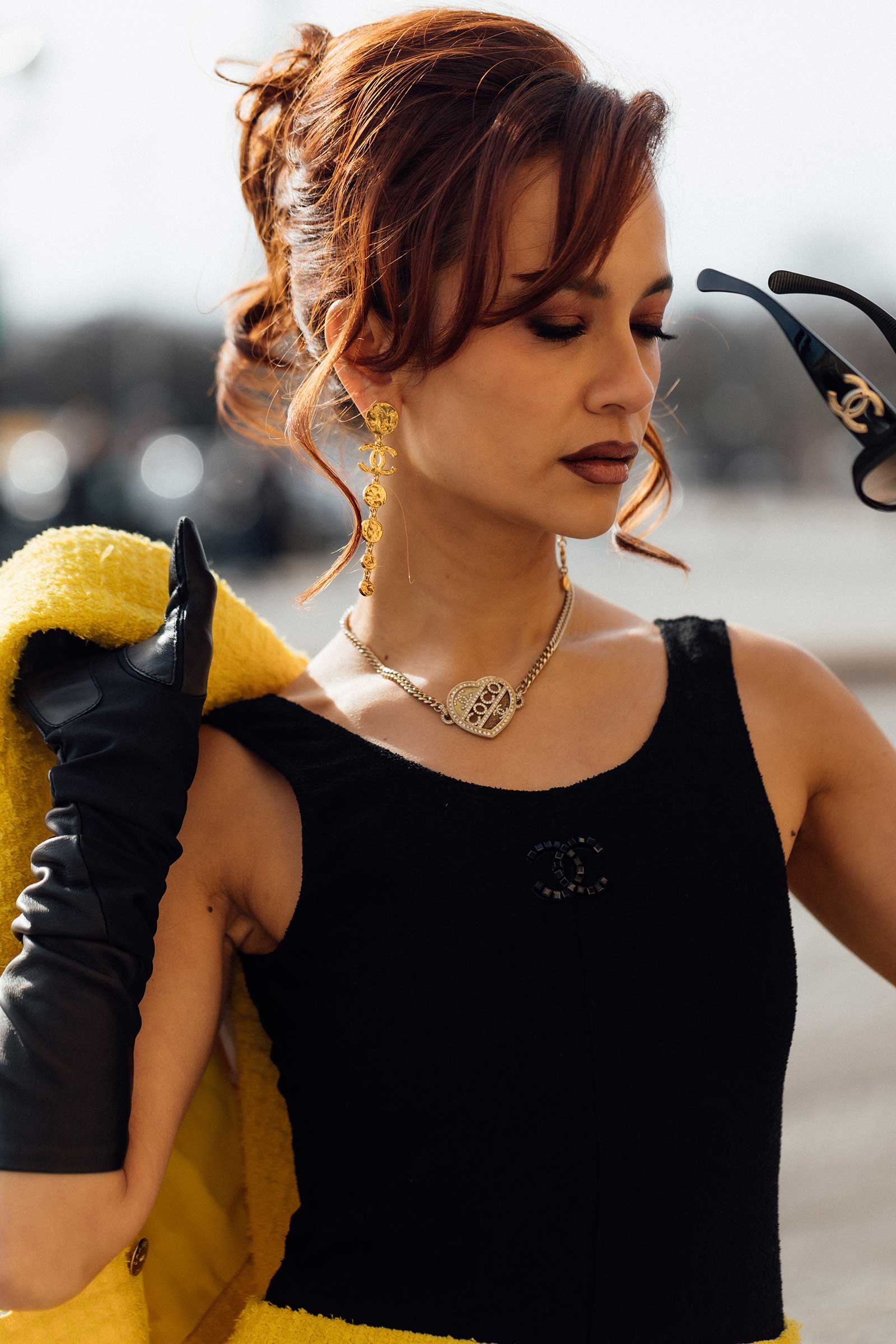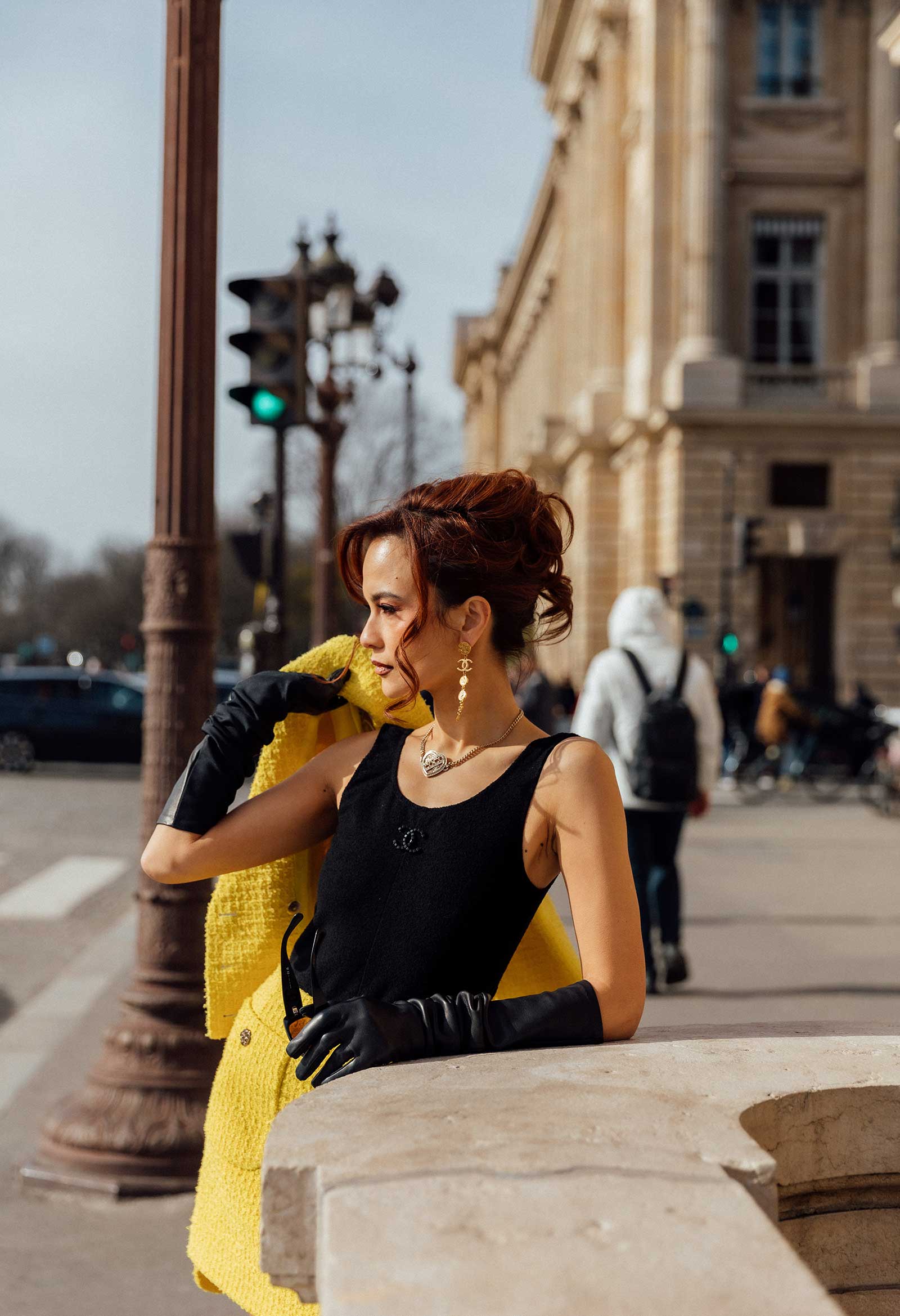 I styled this beautiful yellow suit from spring/summer 2022 with a classic black glove and vintage Chanel playsuit